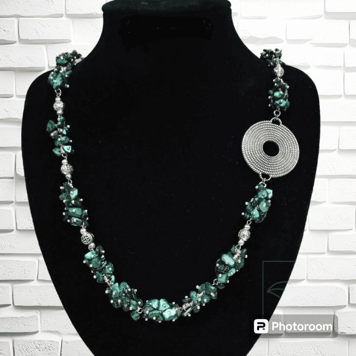 قلاده من كسر حجر عقيق اخضر اللون مرصع بمسامير استالس بدلاليه معدن فضي اللون بطول 42سم