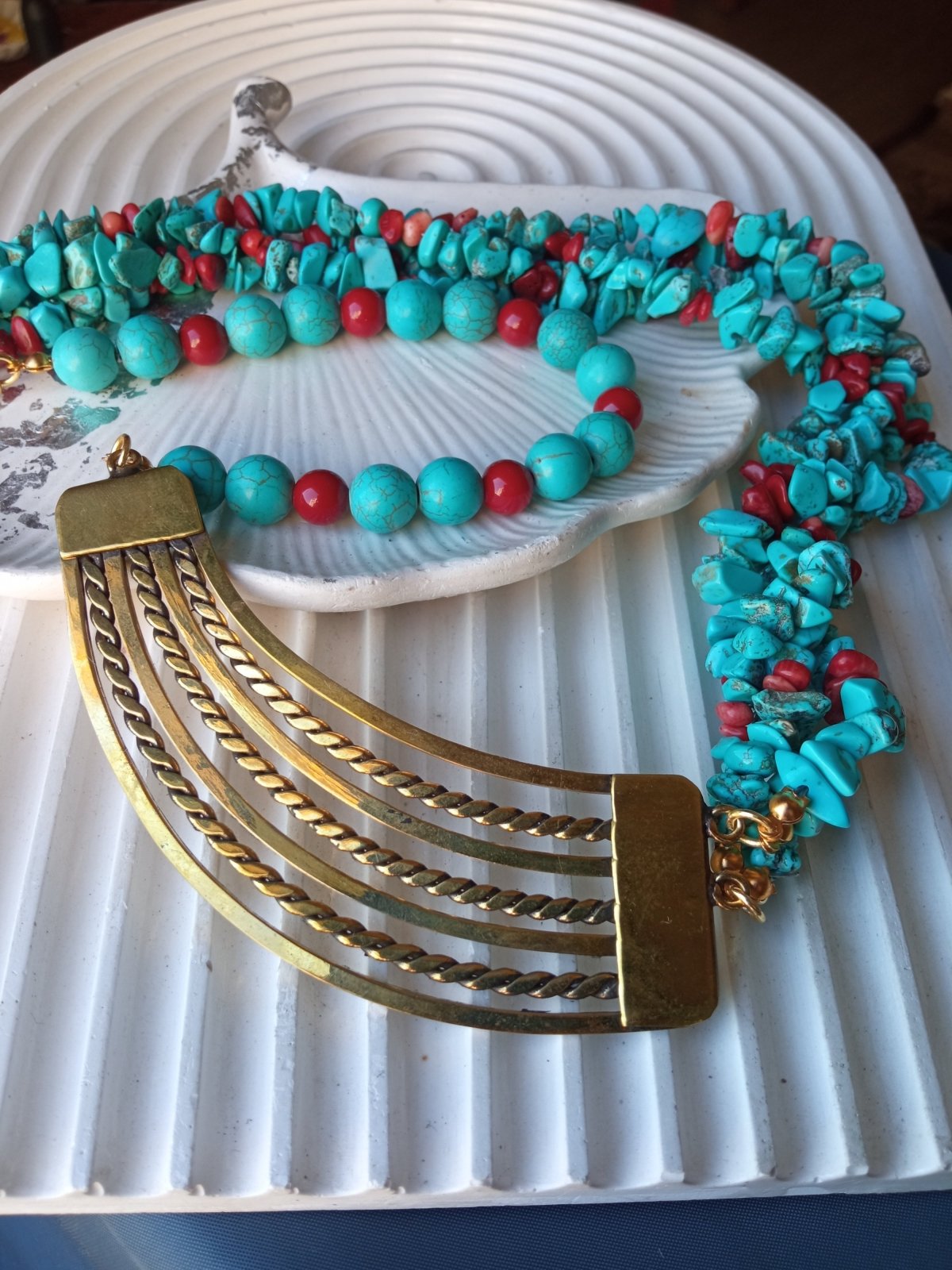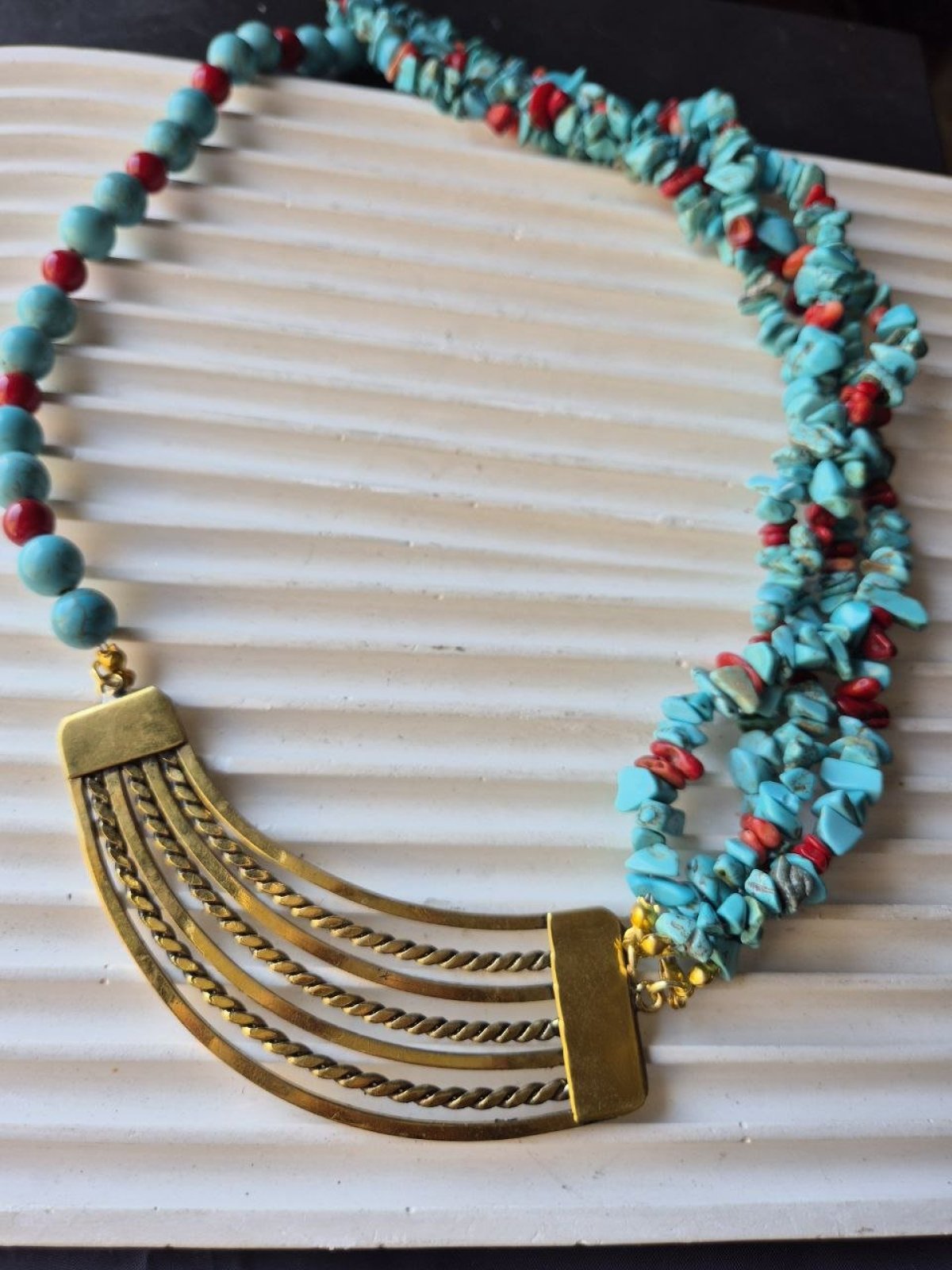 كوليه هاند ميد من حجر ال فيروز مع المرجان و فاصل من النحاس