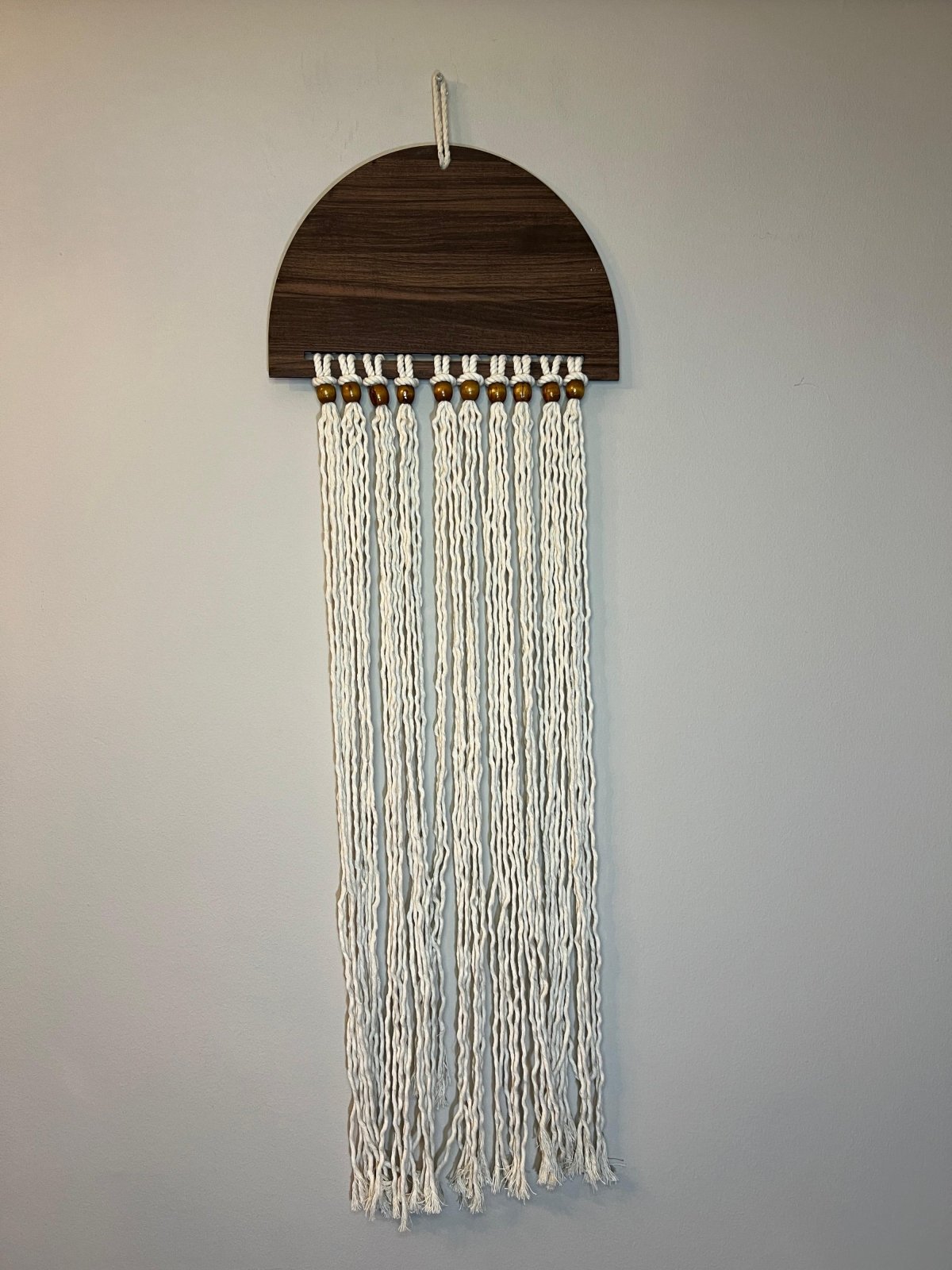 تعليقه خشب نصف دائري و بها خرز بني و الخيط المستخدم مجدول