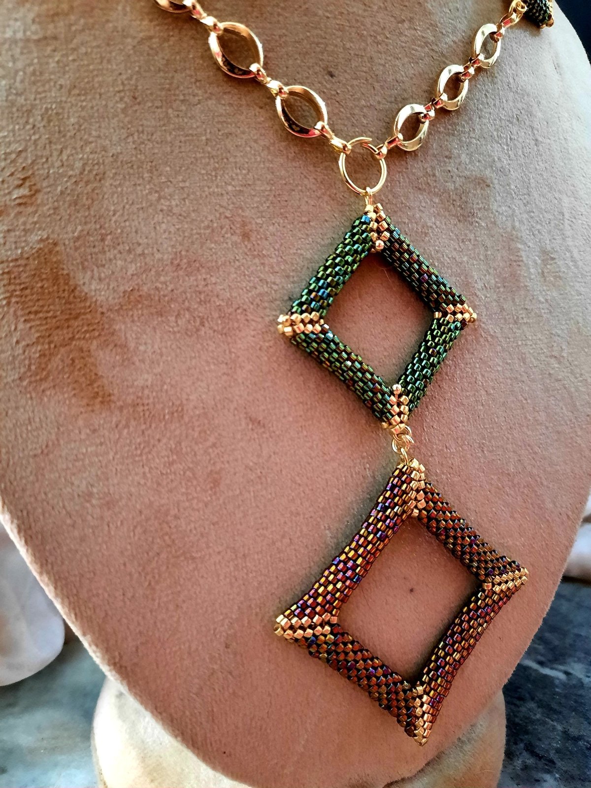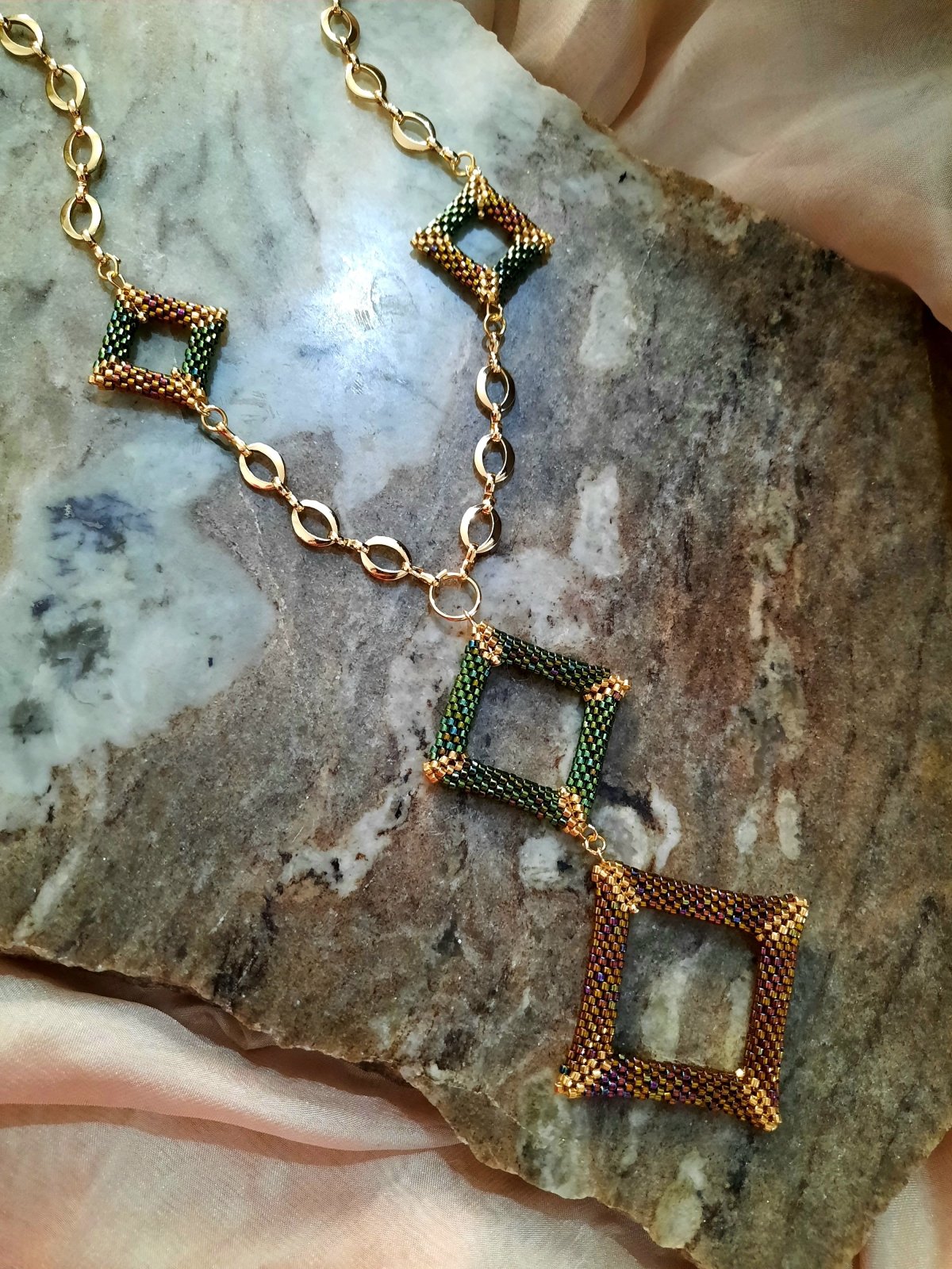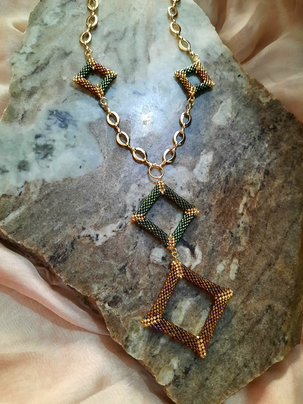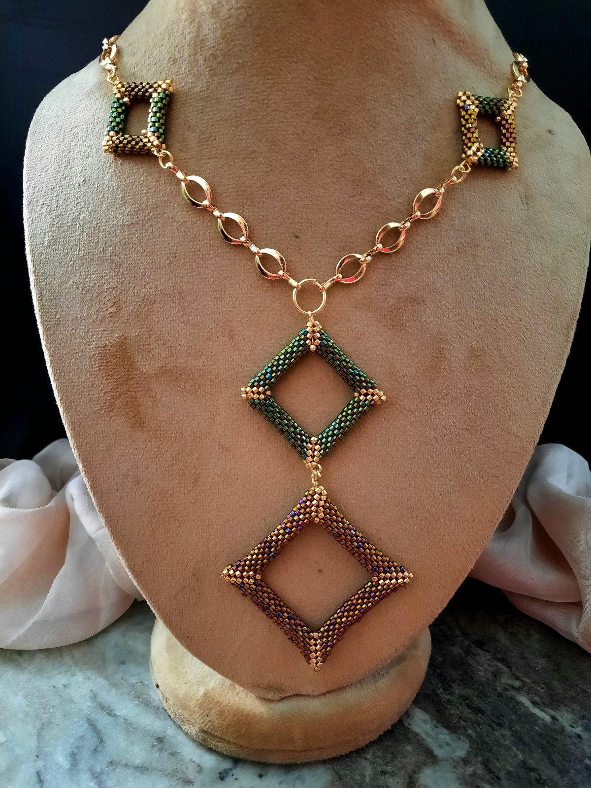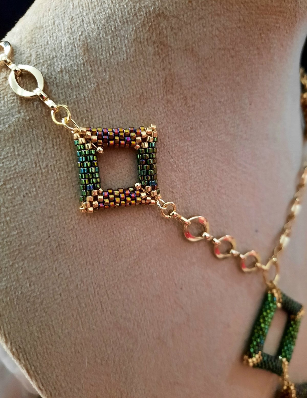 عبارة عن عقد طوله ٦٠سم قابل للأطالة مصمم من مجموعة مربعات مجسمة من خرز الميوكى بتداخل لونين مميزين معا .. مصنوع بالكامل من خرز الميوكى اليابانى .. جميع المواد المعدنية المستخدمة غير قابلة للصدأ او تغيير اللون .. ولا تسبب التحسس ..الوزن خفيف جداا ..