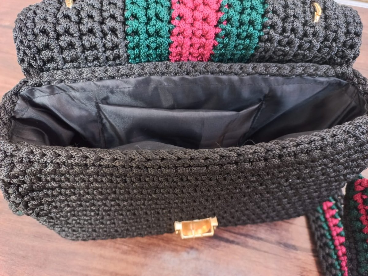 شنطه كروشيه مصنوعه من أجود انواع الخيوط وهو خيط المتميز مبطنه من الداخل بطانه ستان مع جيب داخلي مقفل تركي لغلق الشنطه وزراع طول ١١٠سم مقاس الشنطه ٢٧سم في ١٨سم في عمق ١٠سم