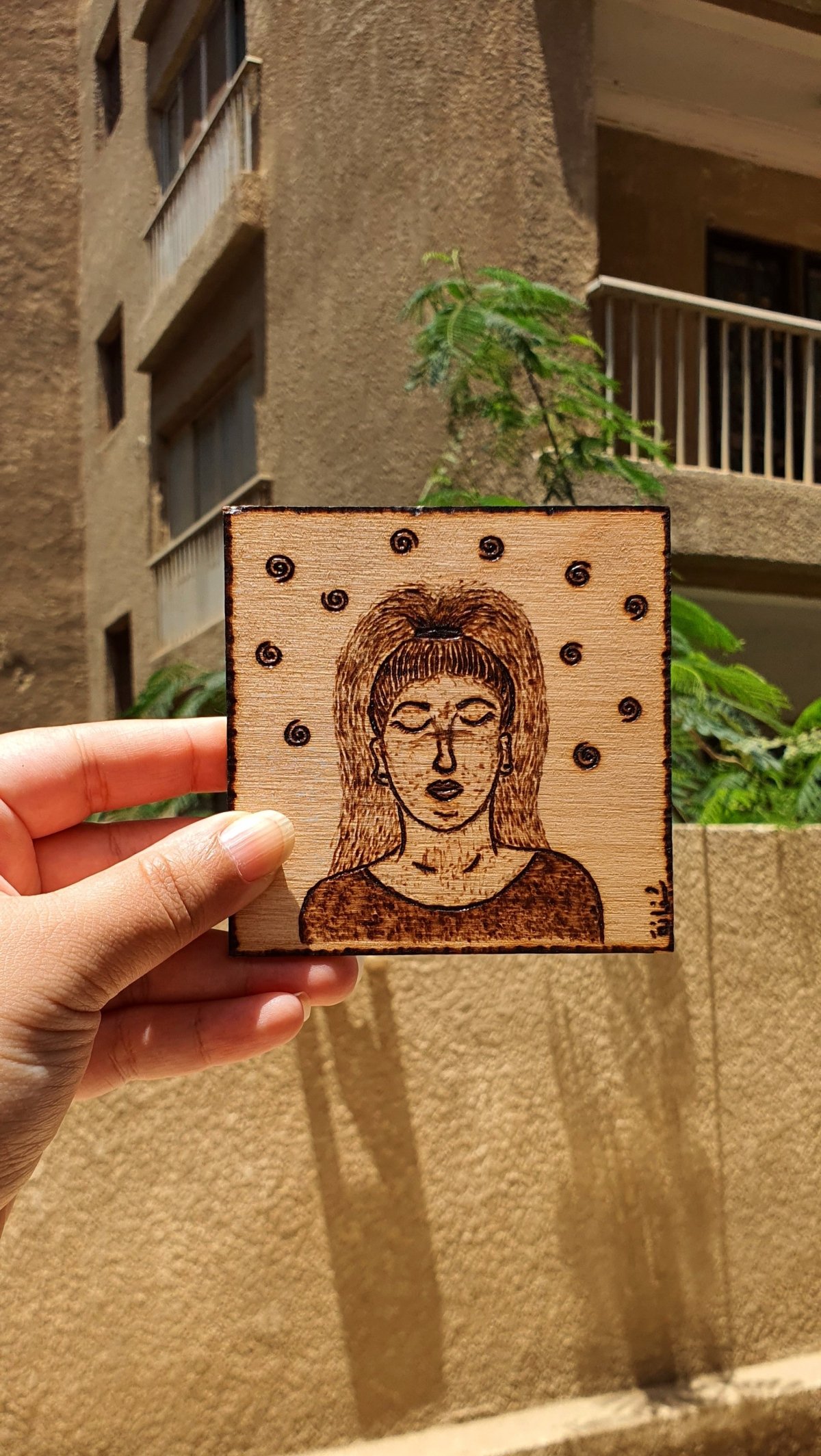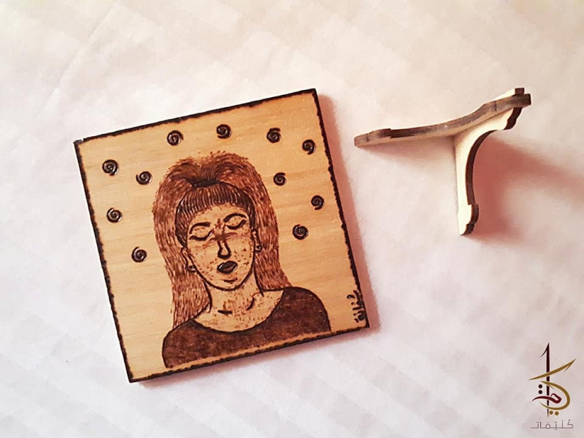 قطعة خشب مربعة بتصميم فريد، نفَّذناه بفن الحرق اليدوي على الخشب، يمكن وضعها على طاولة أو مكتب لإضافة لمسة فنية دافئة إلى غرفتك أو مكتبك.