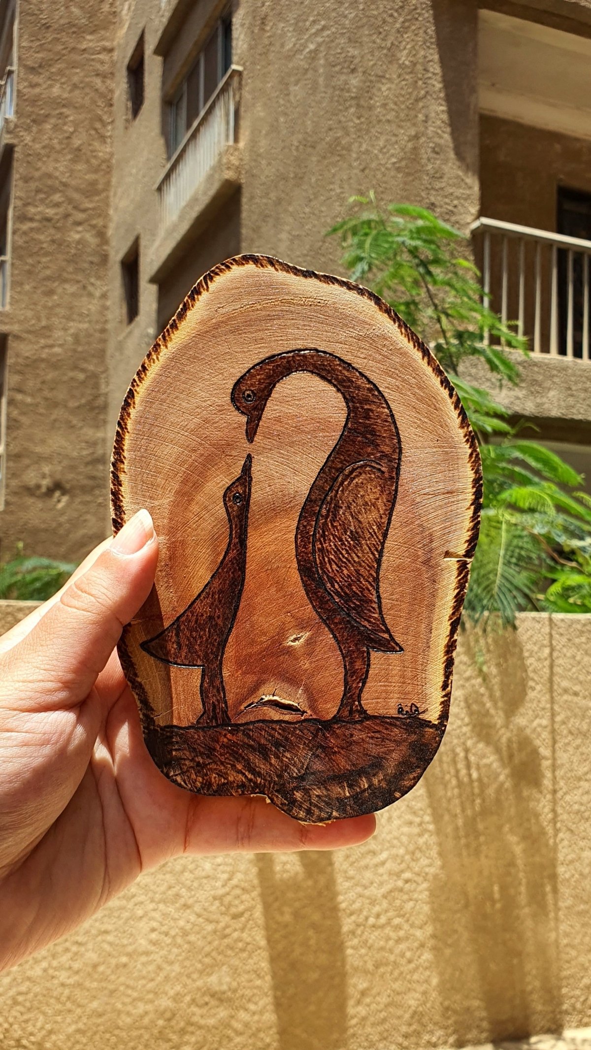 قطعة من جذع شجر بتصميم فريد، نفَّذناه بفن الحرق اليدوي على الخشب، يمكن تعليقها على الحائط لإضافة لمسة فنية دافئة إلى غرفتك أو مكتبك.