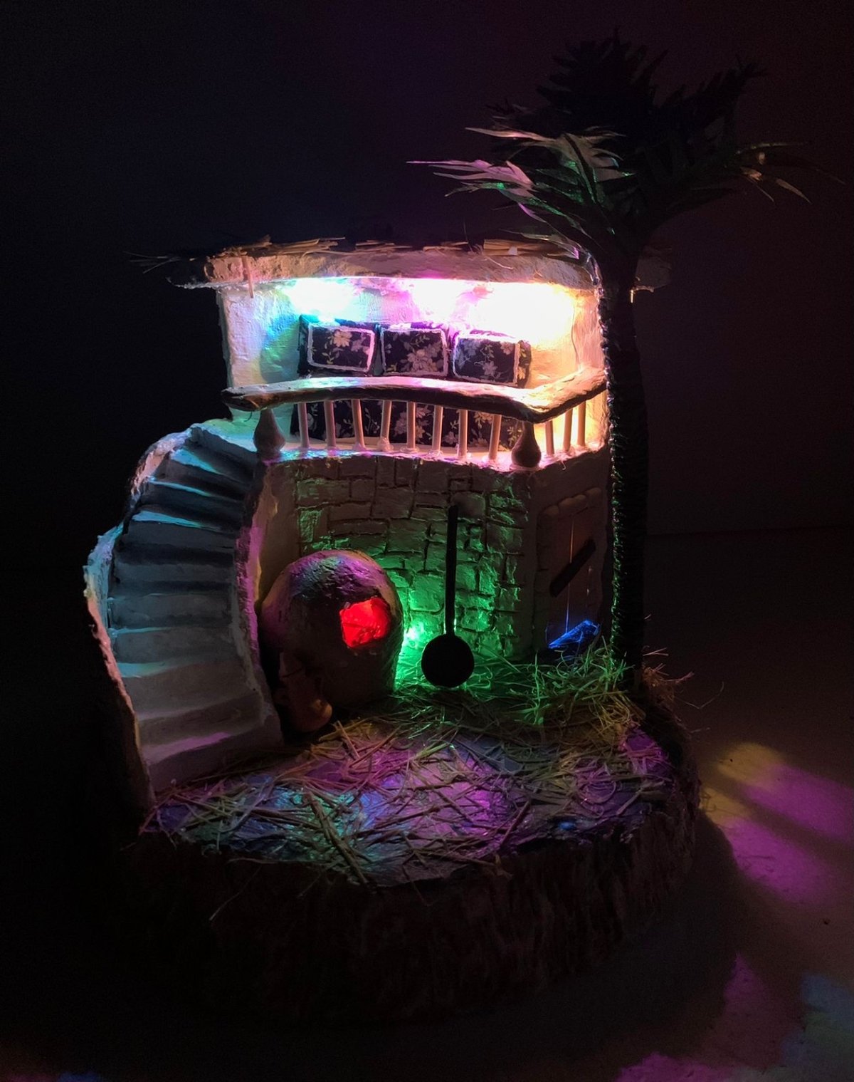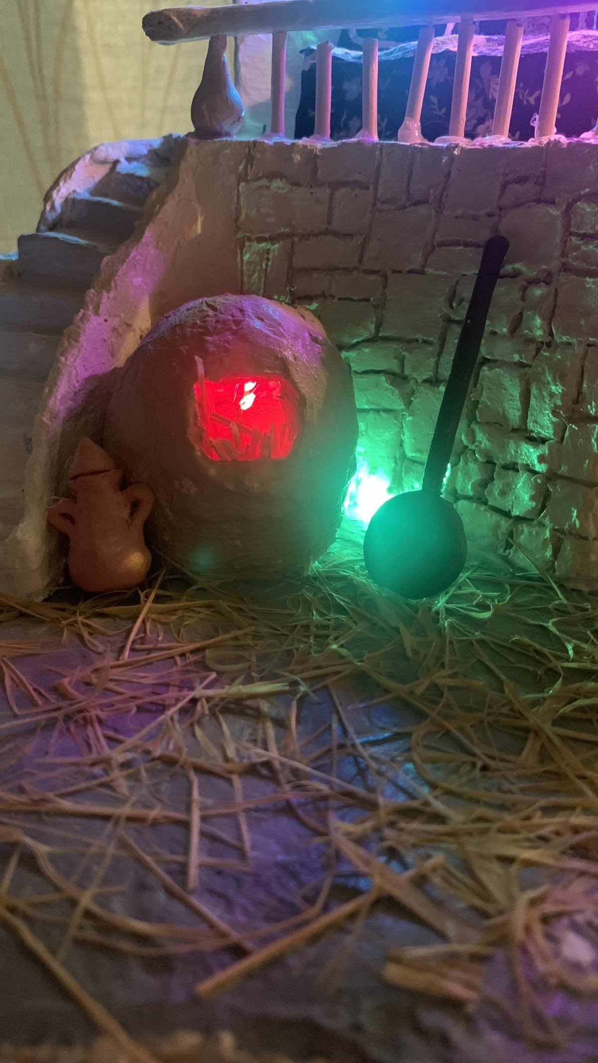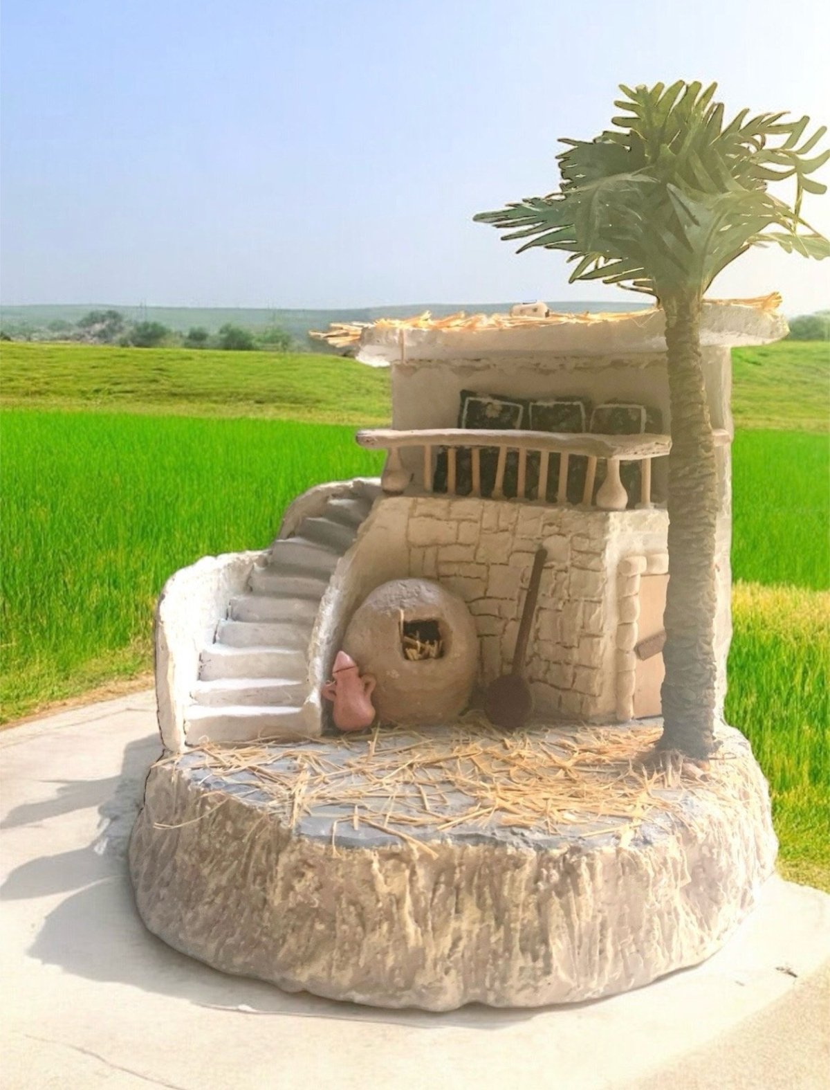 ماكيت من فن الديوراما لمنزل من الريف المصري مصنوع يدويا من خامات مختلفه مثل الجبس والكارتون والفوم والطمي والقماش ومزود بإضاءه .. قطر ٢٧ سنتي وارتفاع ٢٧ سنتي