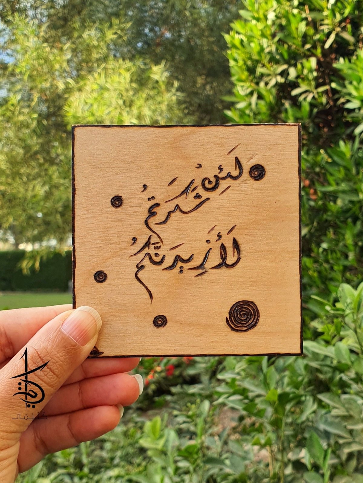 قطعة خشب مربعة بتصميم فريد، نفَّذناه بفن الحرق اليدوي على الخشب، يمكن وضعها على طاولة أو مكتب لإضافة لمسة فنية دافئة إلى غرفتك أو مكتبك.