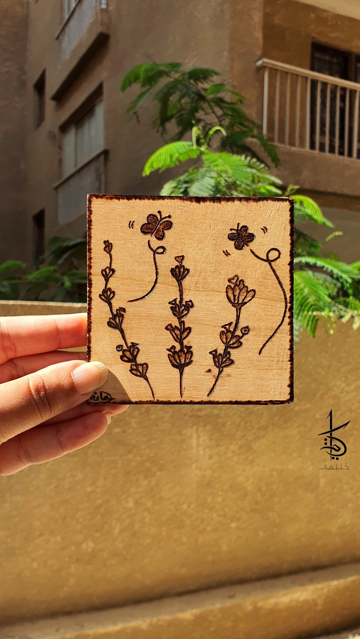 قطعة خشب مربعة بتصميم فريد، نفَّذناه بفن الحرق اليدوي على الخشب، يمكن وضعها على طاولة أو مكتب لإضافة لمسة فنية دافئة إلى غرفتك أو مكتبك.