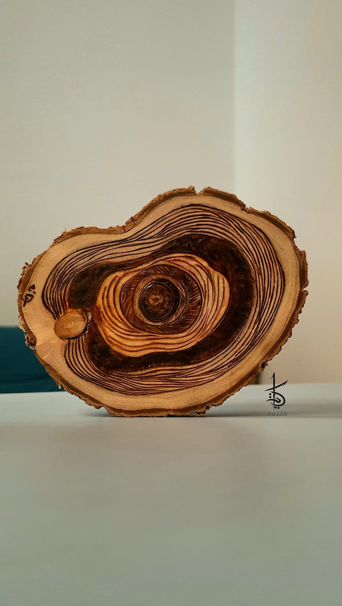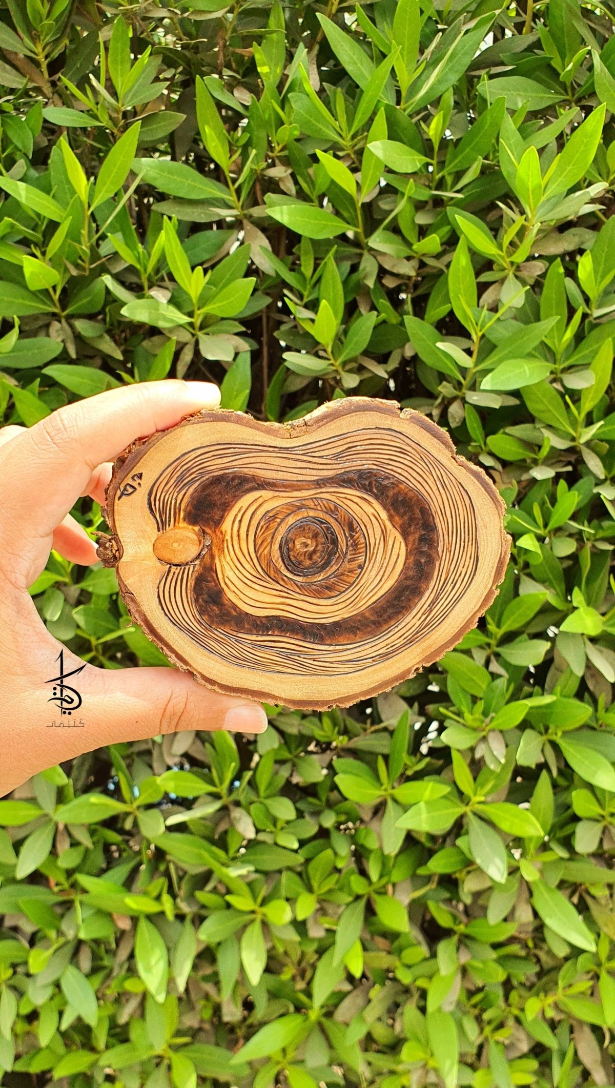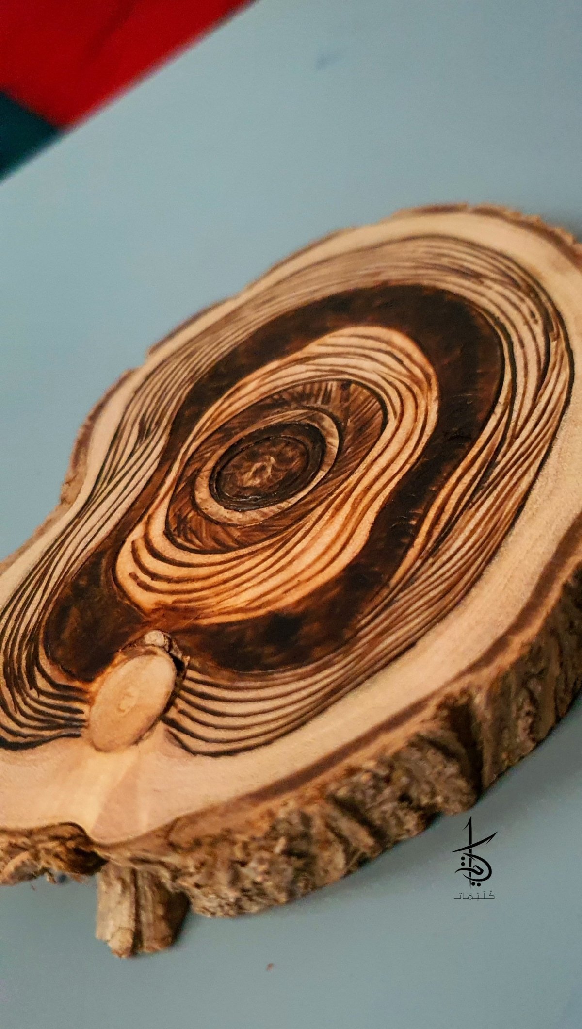 قطعة من جذع شجر بتصميم حر فريد من نوعه، نفَّذناه بفن الحرق اليدوي على الخشب، يمكن وضعها على طاولة أو مكتب، أو استخدامها قاعدة أكواب، لإضافة لمسة فنية دافئة إلى غرفتك أو مكتبك.