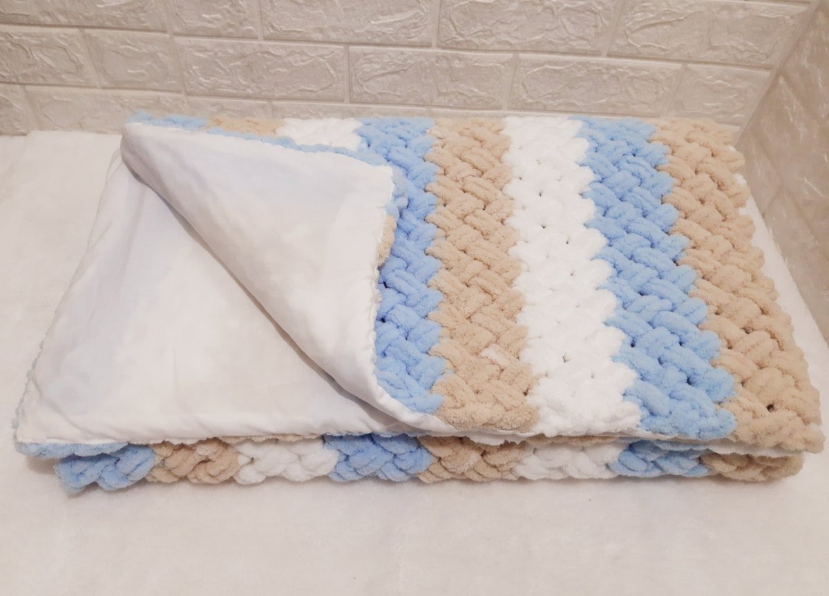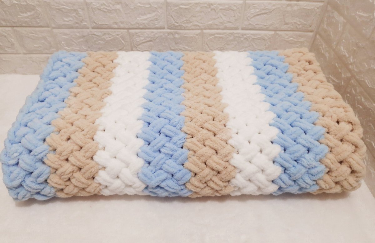 البطانية مشغولة بخيط قطيفة عالى الجودة ومبطنة بقماش قطن . مميزة جدا بالنعومة والتدفئة للبيبي . مقاس البطانية ١٢٠ سم × ١٢٠ سم