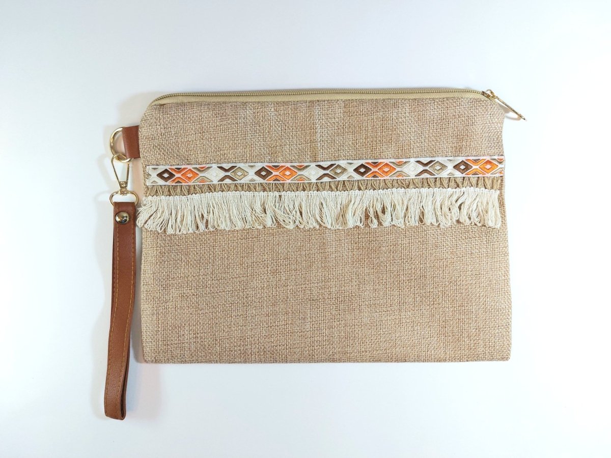 كلاتش كتان وعليها كلفه صغيره بلون ابيض و بني و برتقالي و خيش مبطن من الداخل. و سوسته و يده من الجانب مقاس الكلاتش ٢٧ عرض × ٢٠ طول