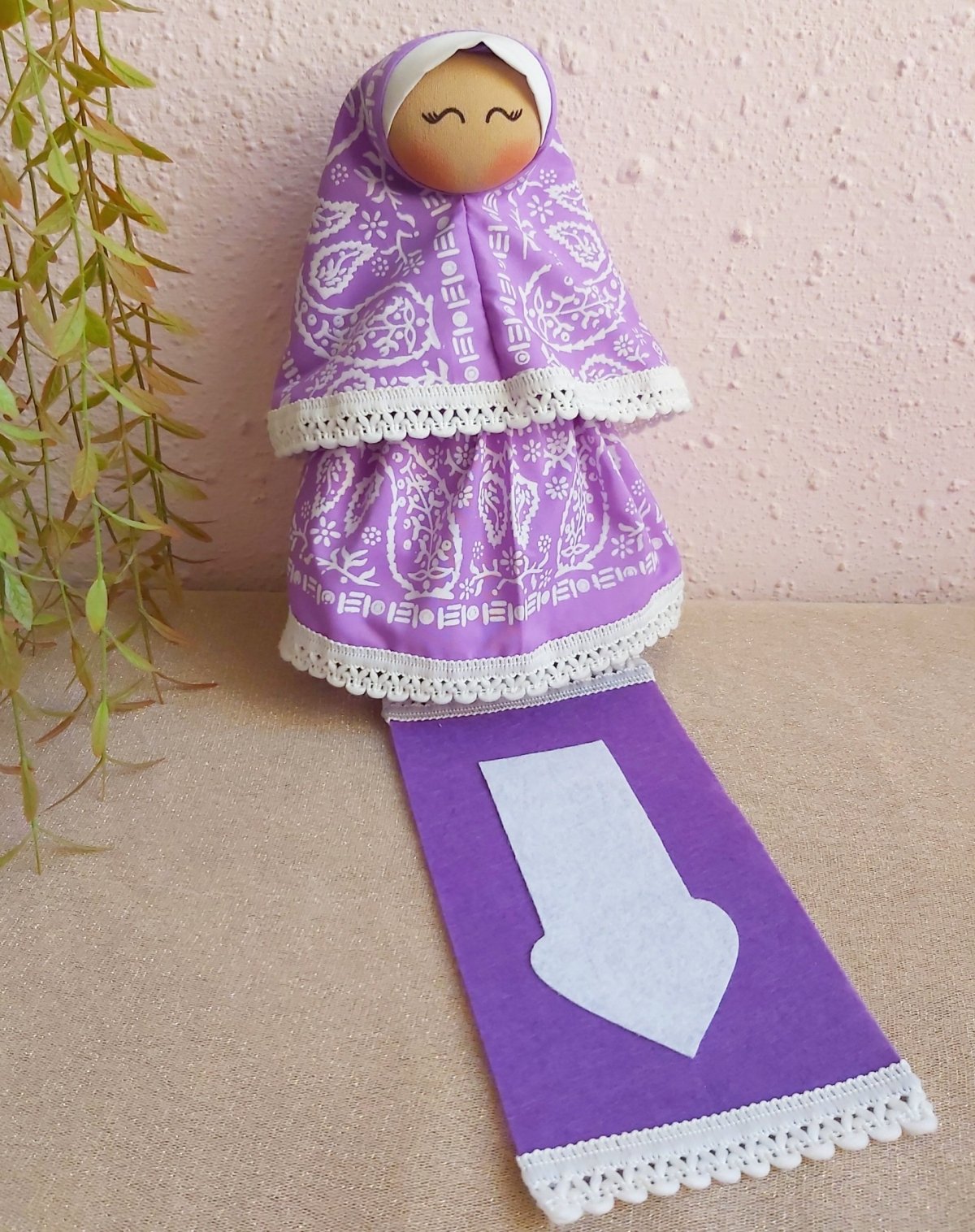 ومعها طقم الصلاة وسجادة الصلاة الخاصة بها وبنفس لون فستان العروسة