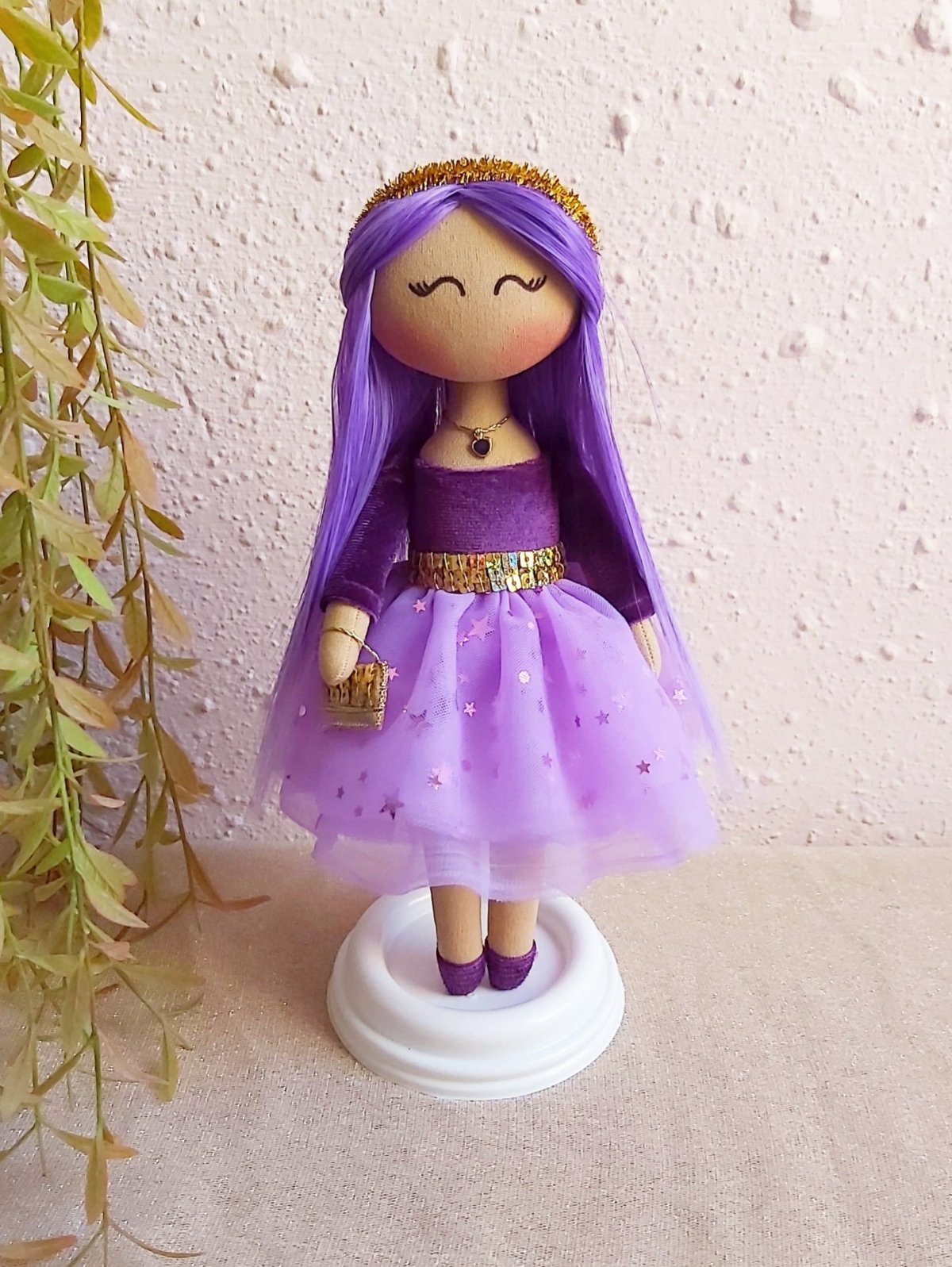 عروسة مصنوعة يدويًا بجميع تفاصيلها ،الشعر حراري والملابس ثابتة ،اليدين متحركين، و يبلغ إرتفاعها حوالي ٢٤سم.