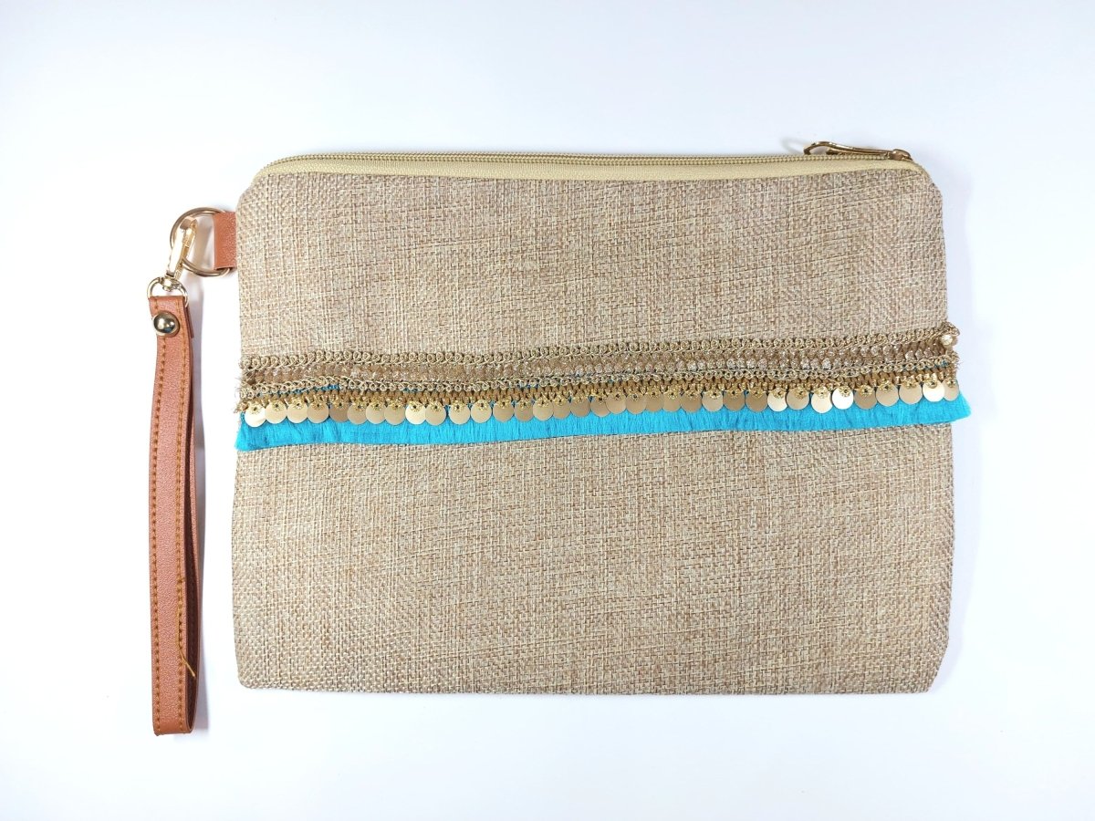كلاتش كتان وعليها كلفه بلون الدهبي و اللبني . مبطن من الداخل. و سوسته و يده من الجانب مقاس الكلاتش ٢٧ عرض × ٢٠ طول
