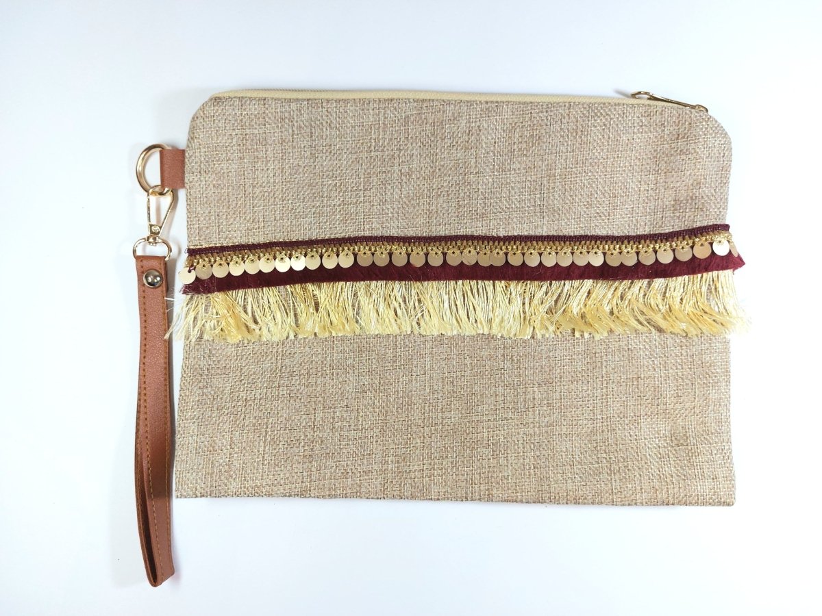كلاتش كتان بشريط نبيتي و دهبي . مبطن من الداخل. و سوسته و يده من الجانب مقاس الكلاتش ٢٧ عرض × ٢٠ طول