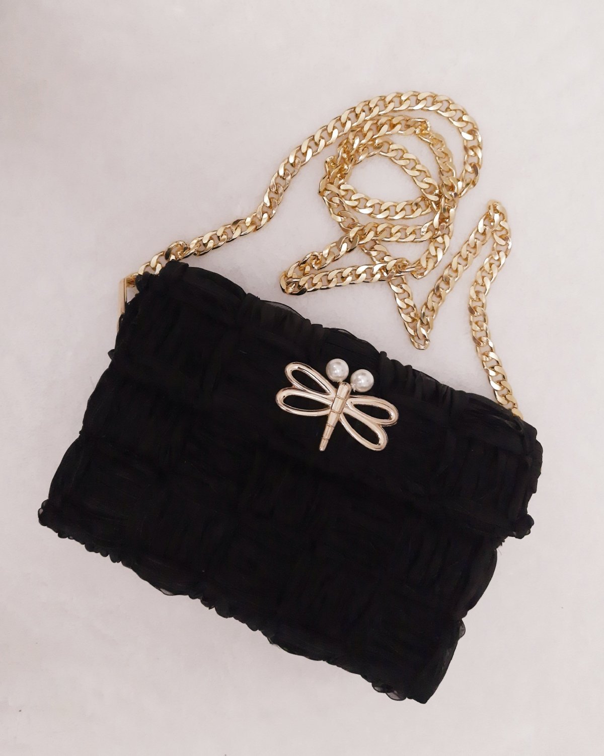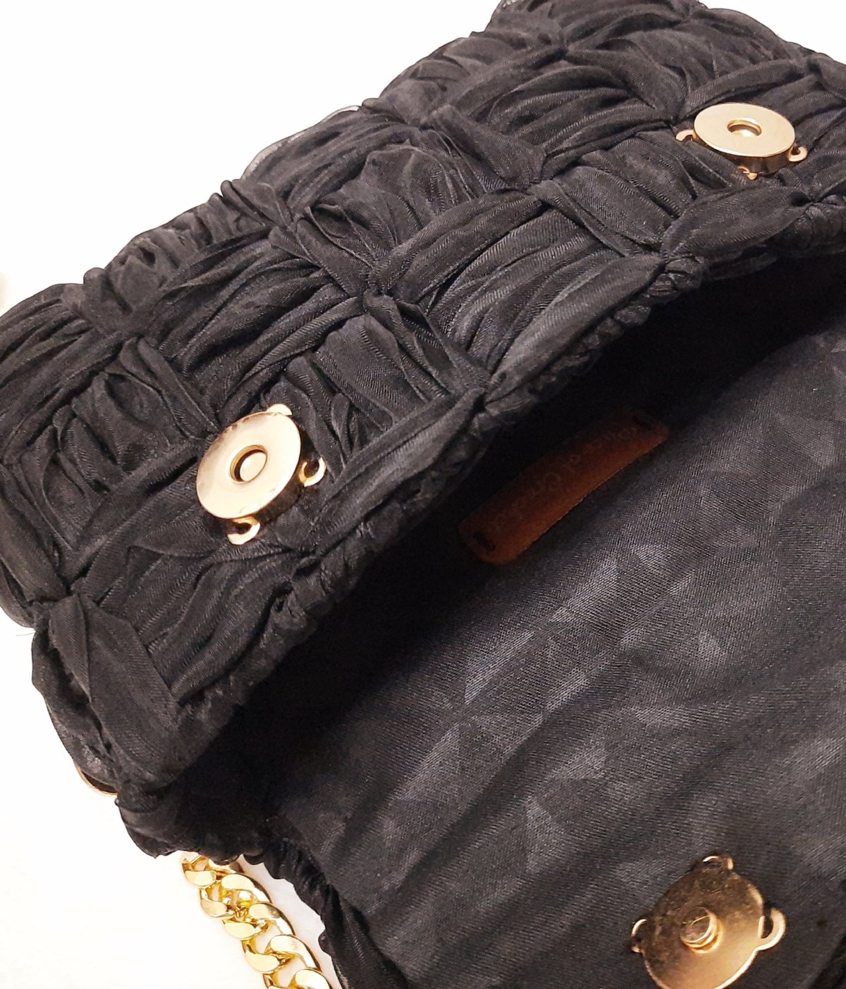 شنطة كنفاه مشغولة بشرايط الاورجنزا . مبطنة من الداخل ولها يد سلسلة . واكسسوار دهبي . متاح تنفيذها بأى لون ومتاح اكسسوار فضى .