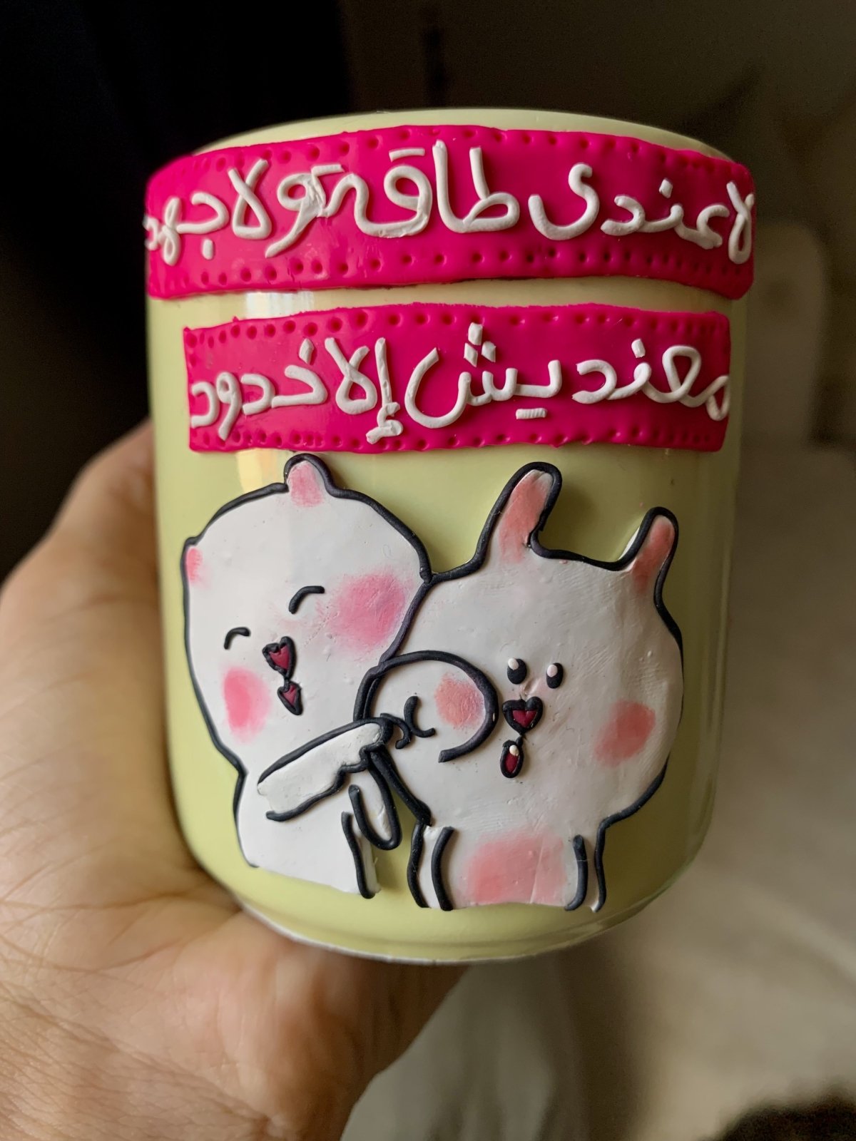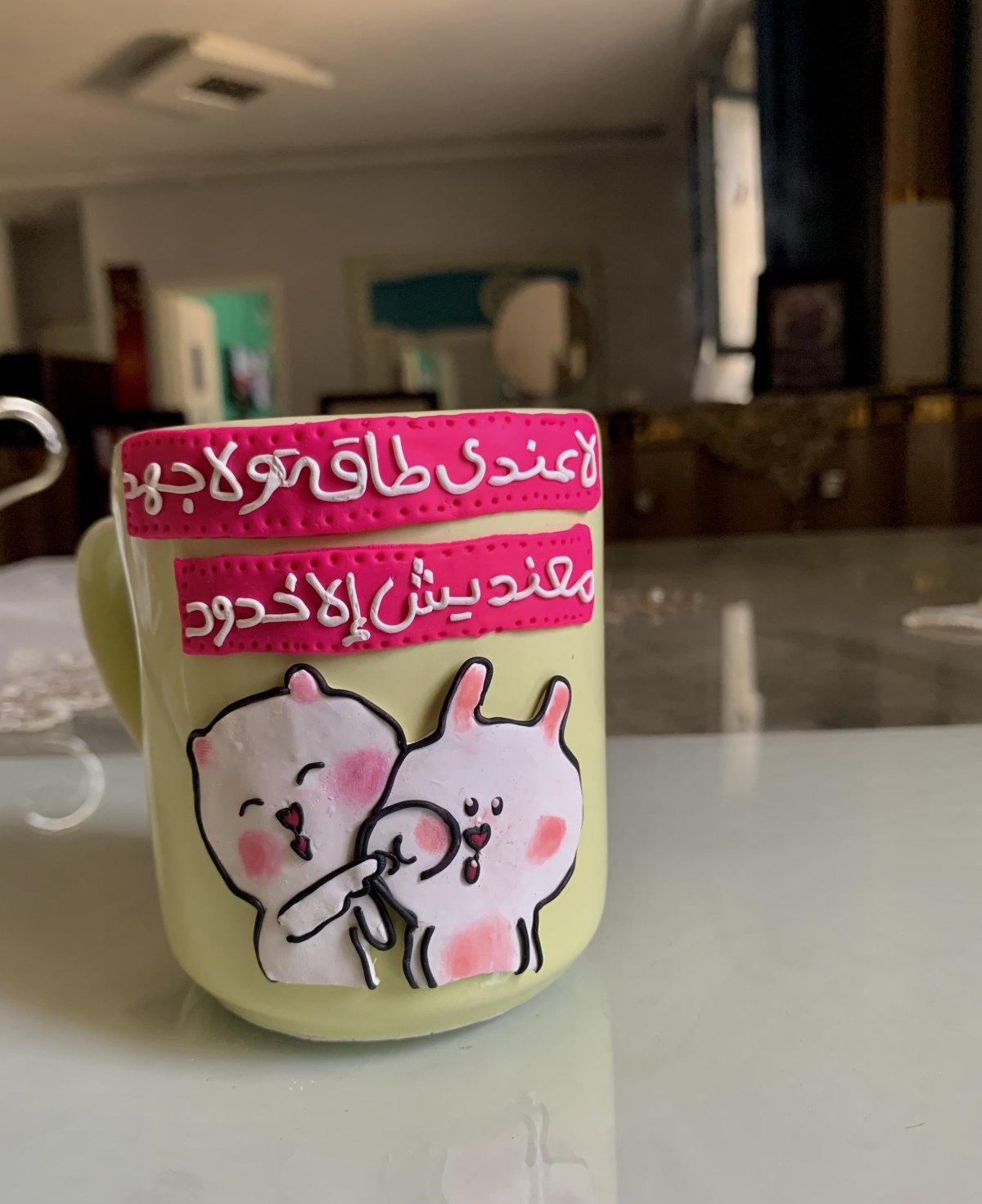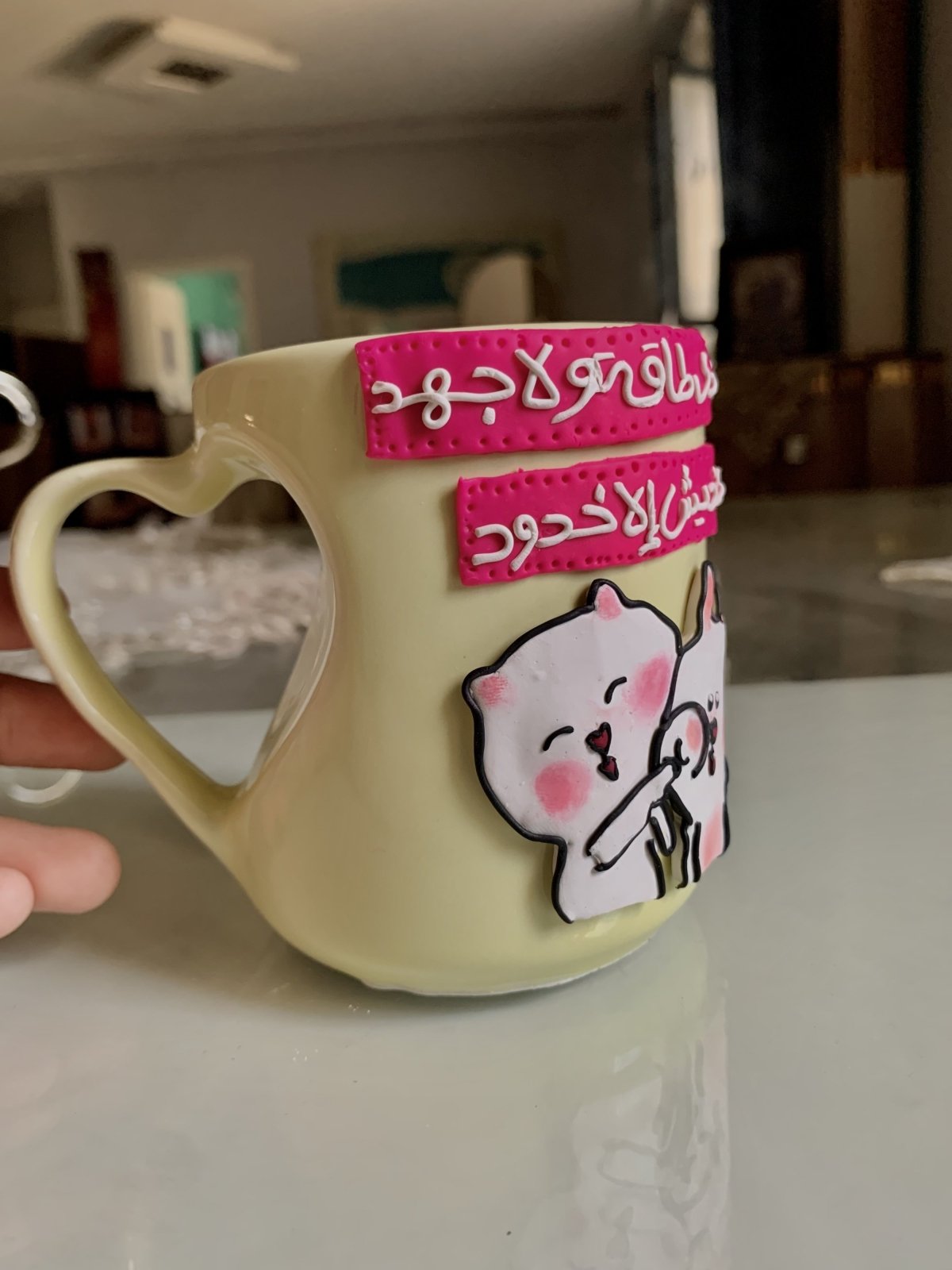 مج مصنوع من الصلصال الحراري بتصميم خاص ومتاح تغير الالوان سعه المج حوالي ٣٣٠ ملل
