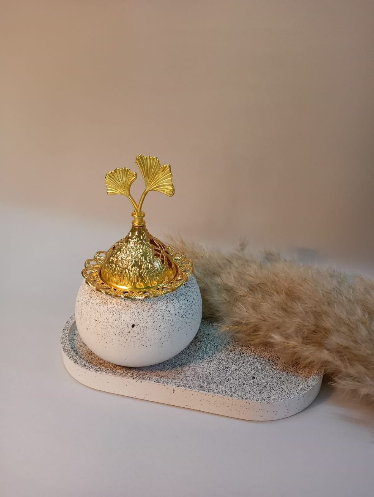 مبخره كونكريت باللون الابيض في اسود بغطاء ذهبي مع كوستر بيضاوي من نفس اللون معزوله بطبقة حمايه ضد الميه
