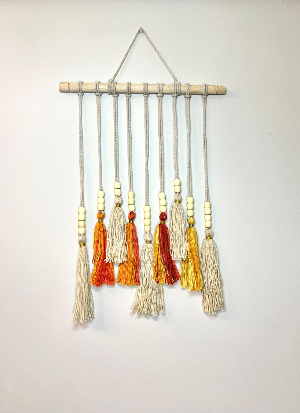 تعليقه علي عصا ٤٠ سم مصنوعه من خيط الصوف الوان برتقالي و بيج طول الشغل 105 سم