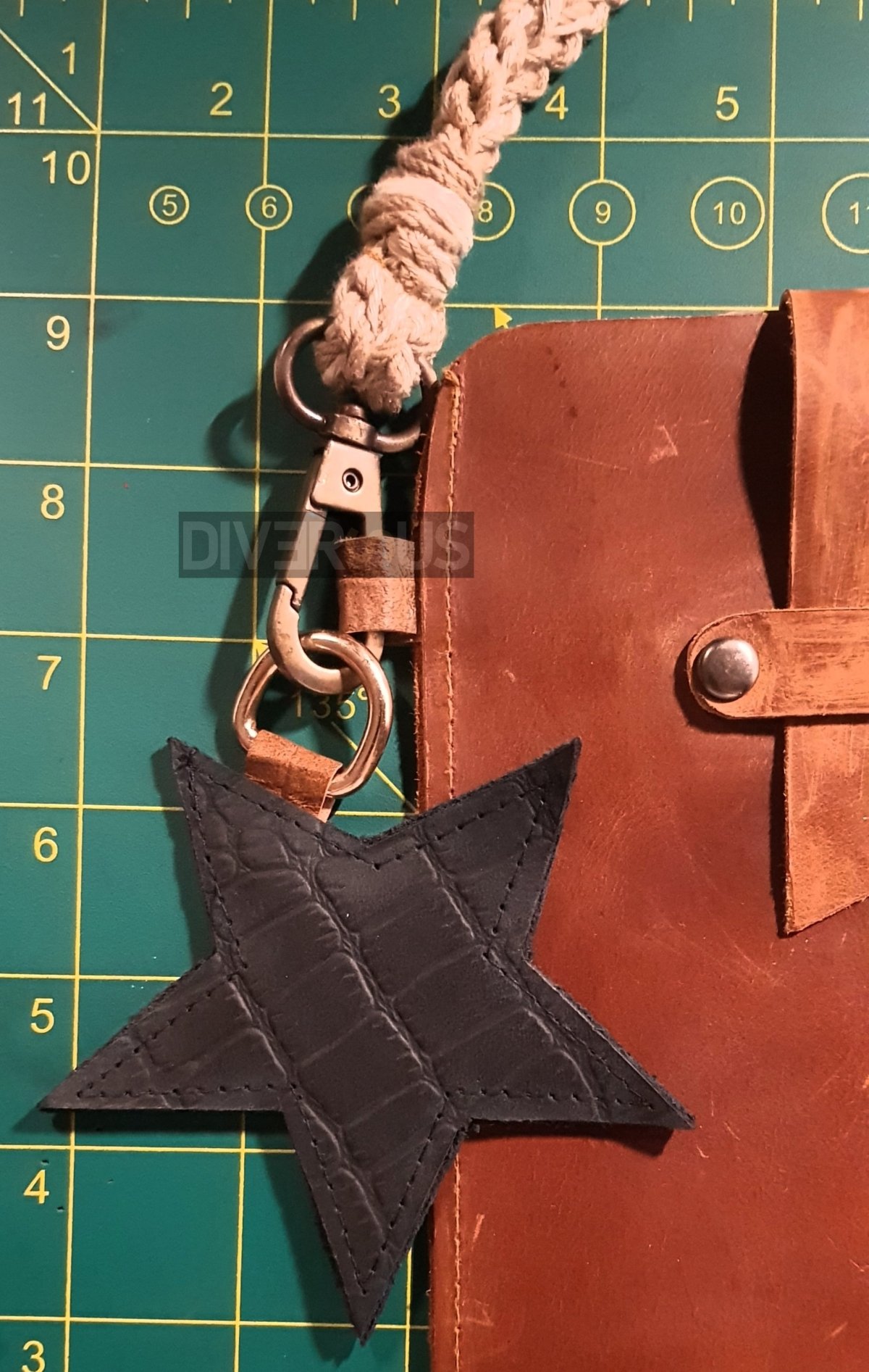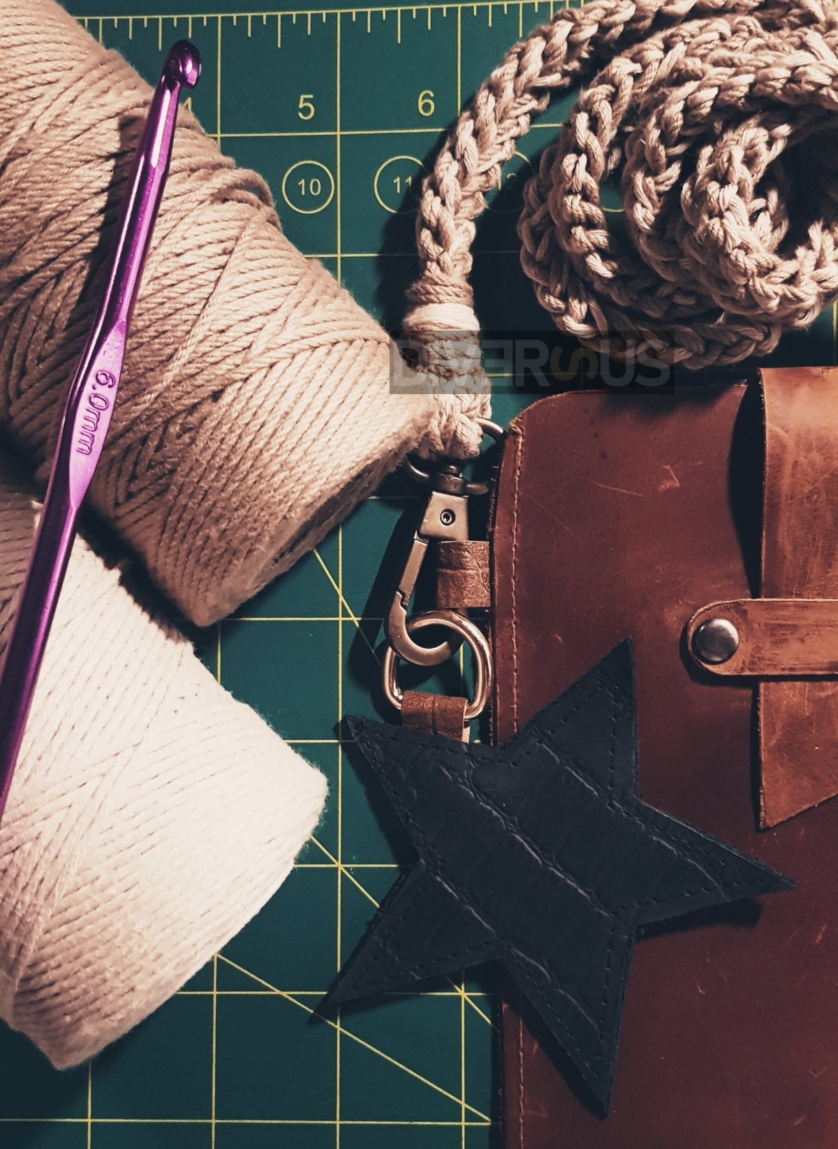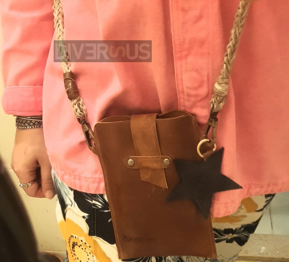 شنطة موبايل جلد طبيعي مع ايد كروشيه قطن ..لها جيب داخلي ..مقاسها ٢٠ × ١٤