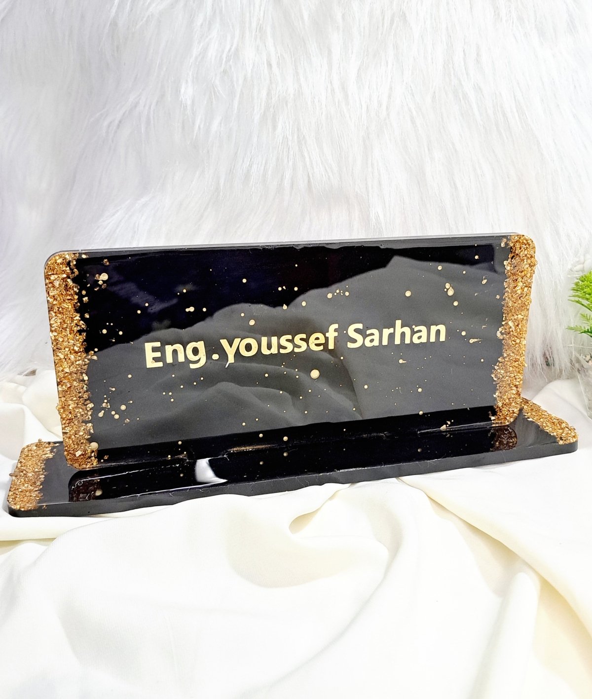 إستاند مكتب من الريزن مقاس القاعده ٣٠سم × ٨ ومقاس القطعه الأساسيه ٢٥سم × ١١سم علي شكل مستطيل عليه الأسم والمهنه متاح تغيير الأسم والمهنه