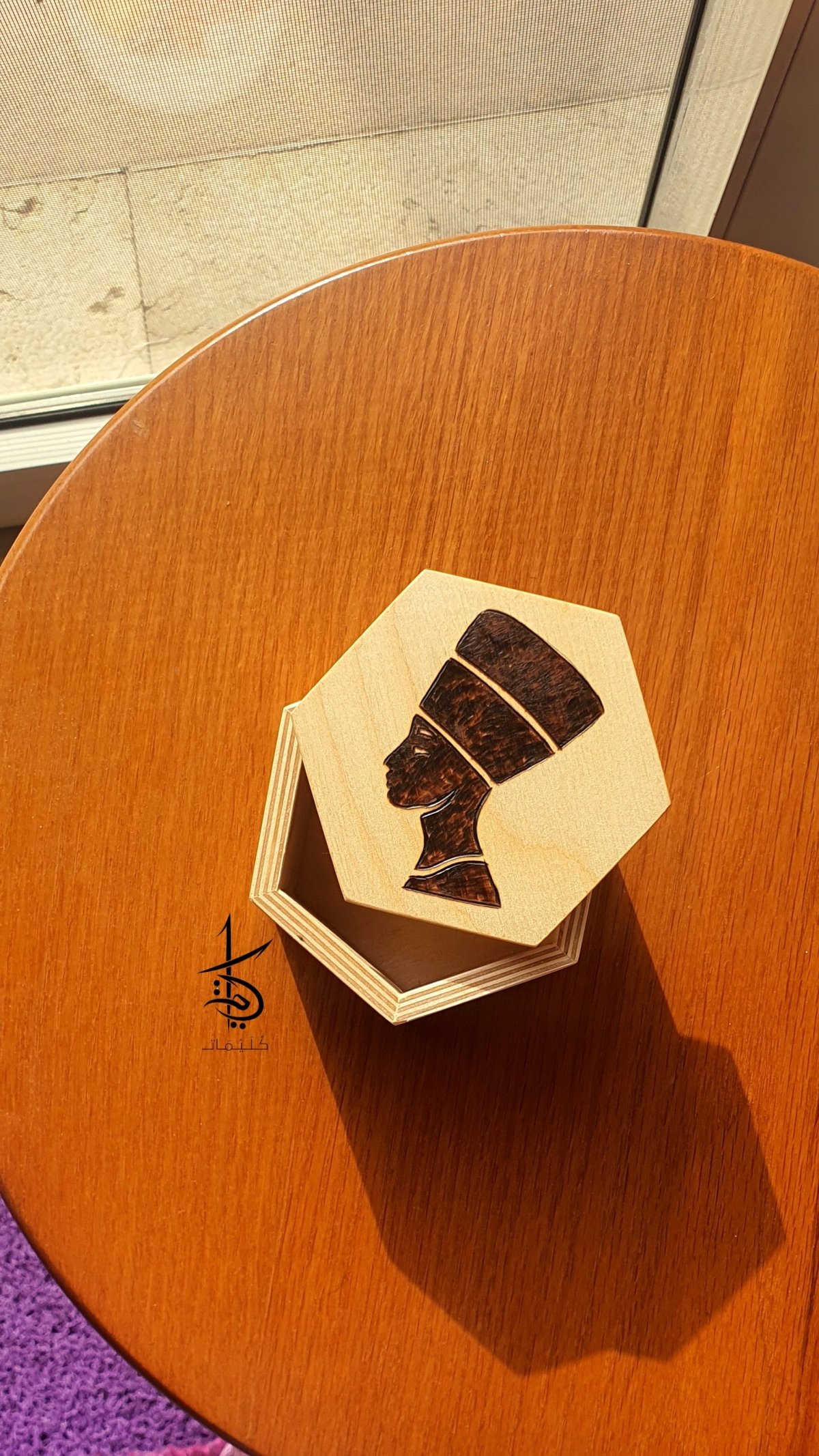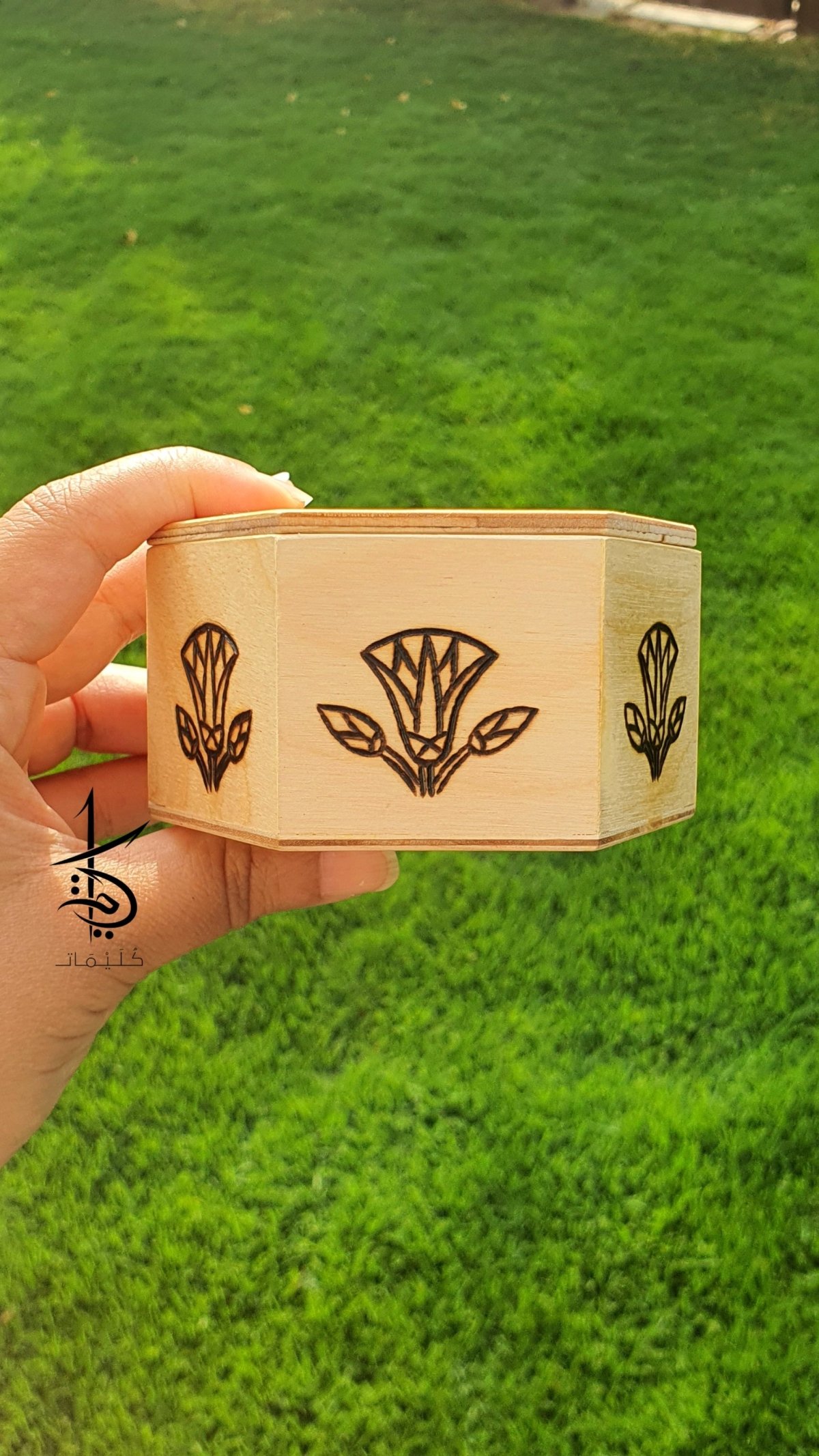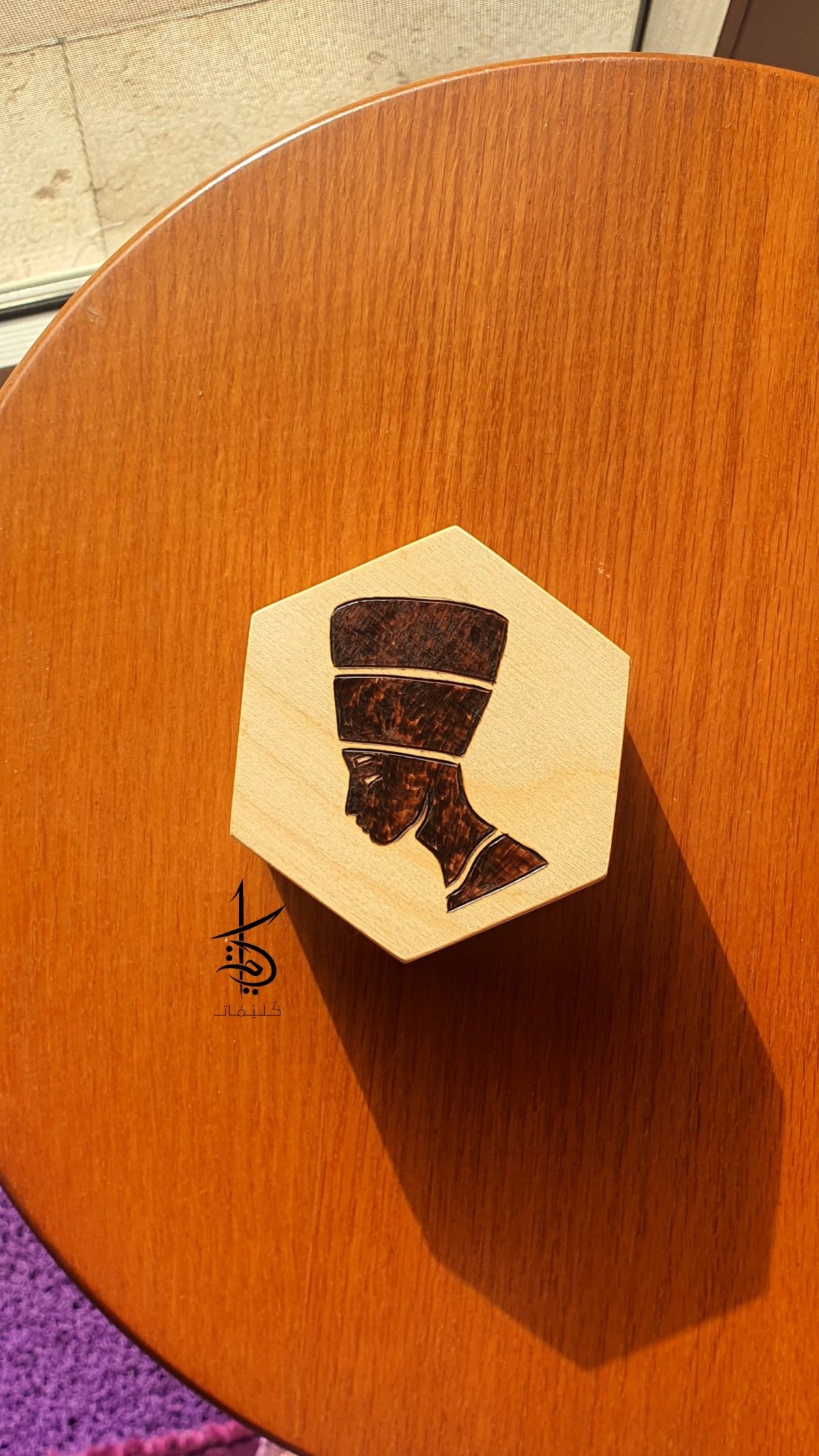 صندوق خشب صغير سداسي الشكل، بتصميم فريد من نوعه، نفَّذناه بفن الحرق اليدوي على الخشب.