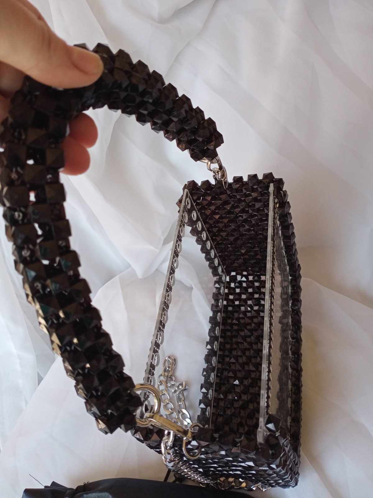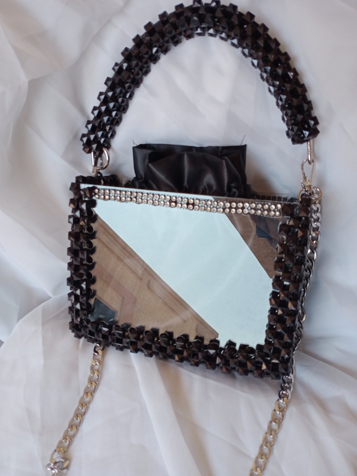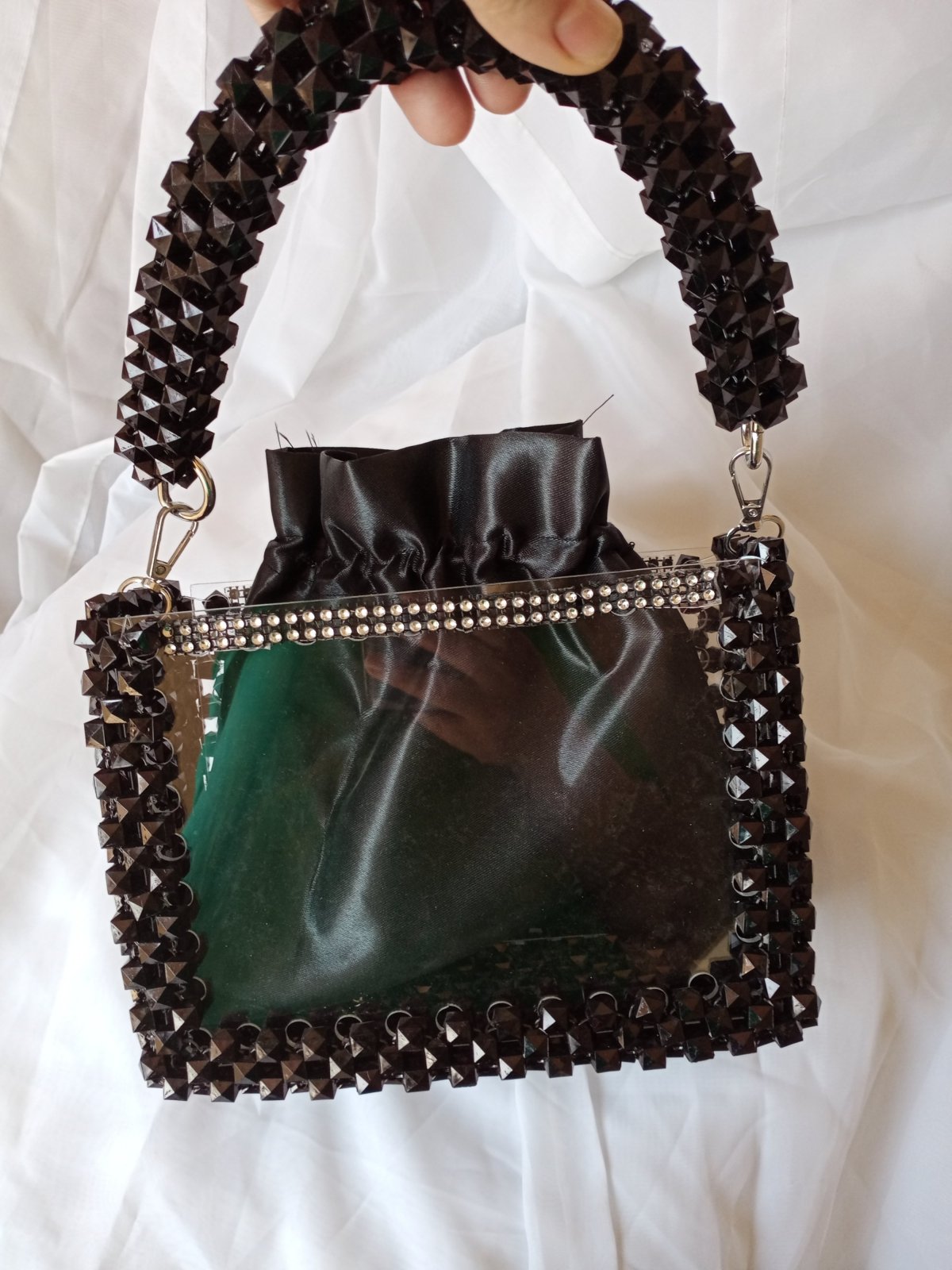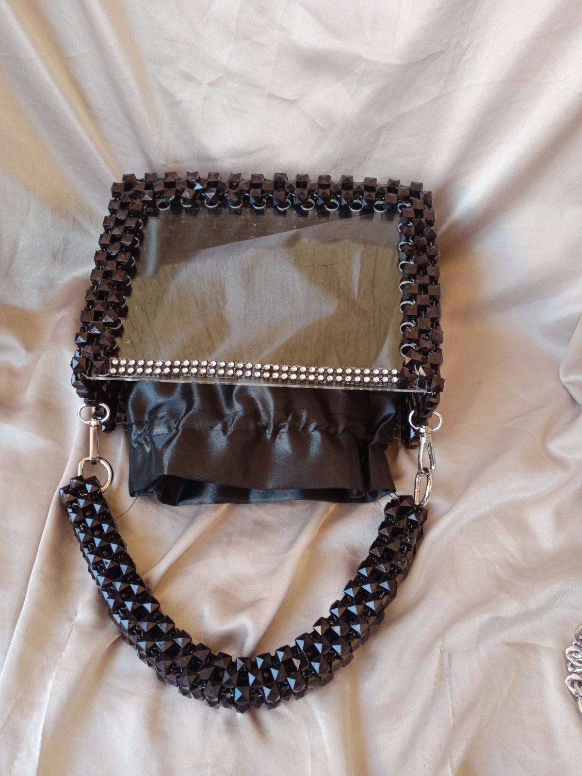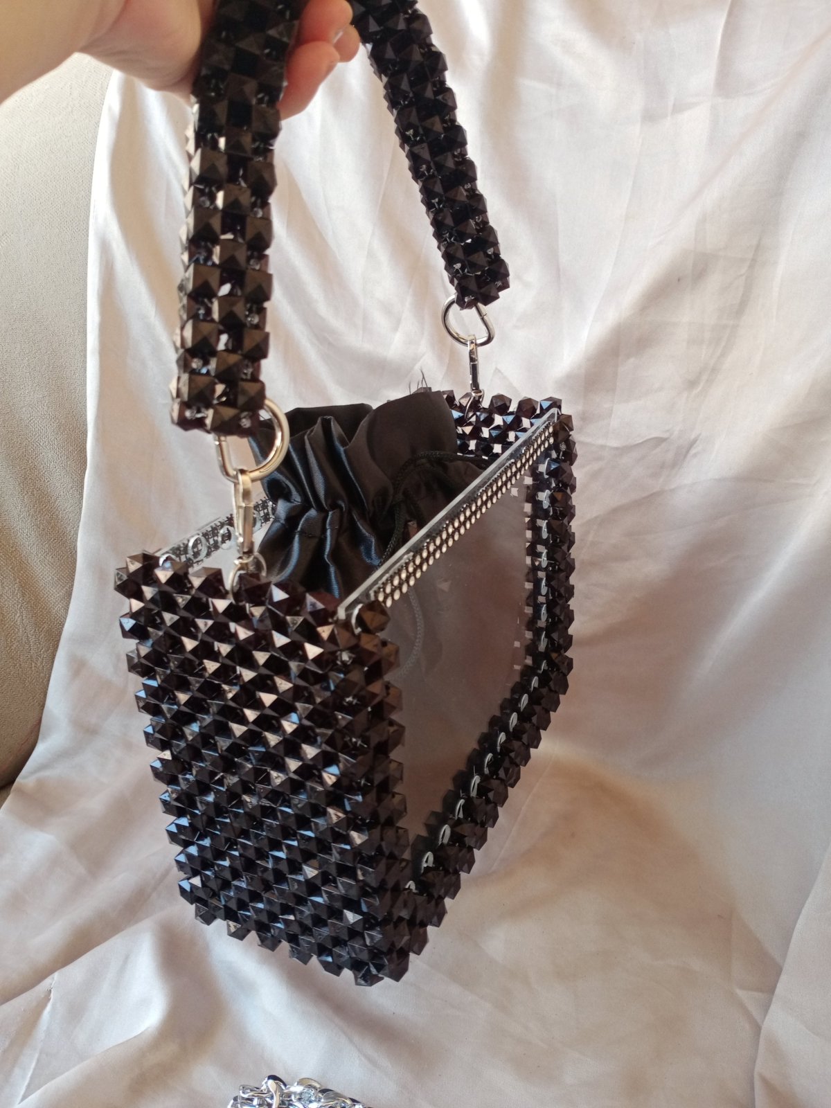 حقيبه من الخرز السداسي صنعت يدويا علي شكل اكليرك مستطيل لها كيس ستان من الداخل مذوده بهاند من الخرز ودراع كروس من المعدن مقاس واسع جدا من الداخل مقاس 22× ١٥ وعرض ١٠سم