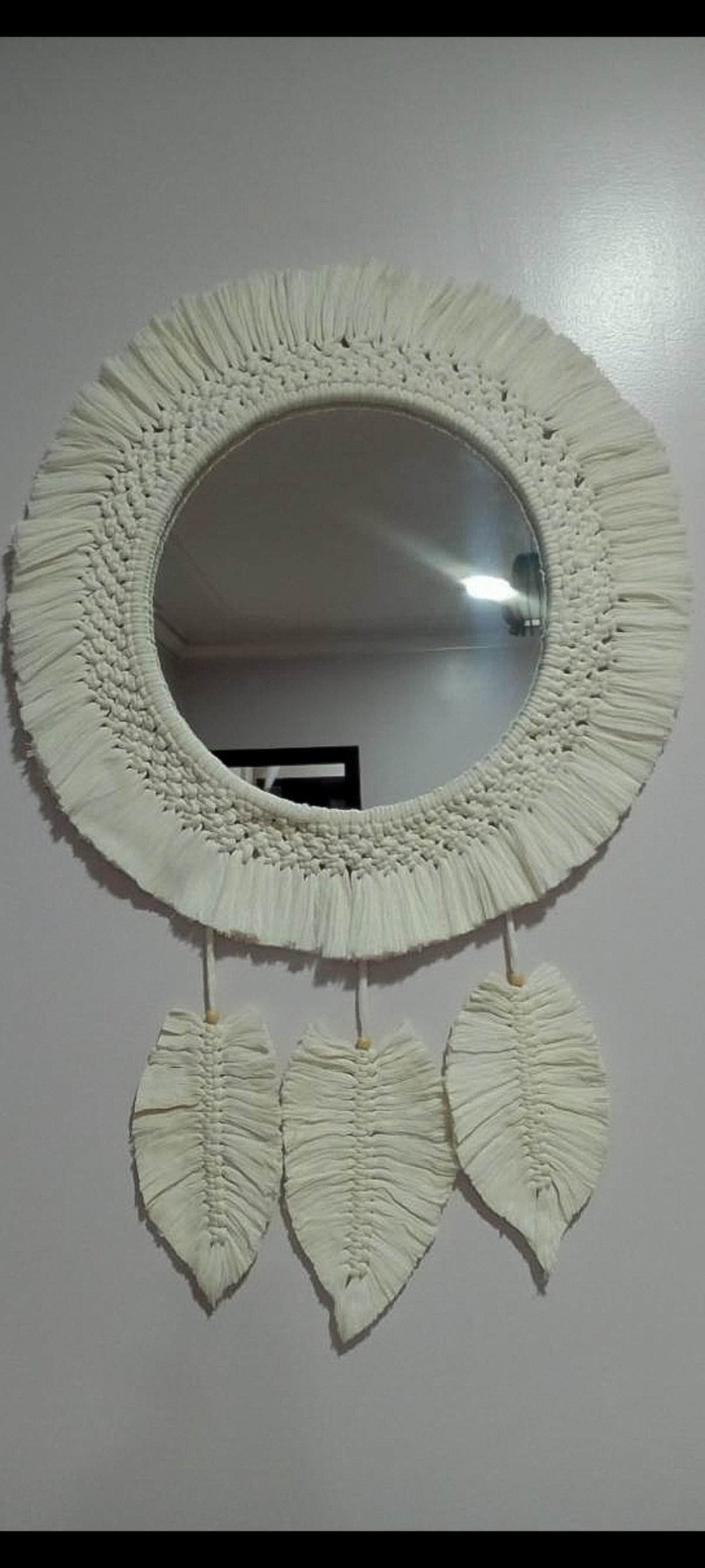 صنعت من المرايا وخيوط المكرميه القطن والريشه التي تعطي انسيابيه للمريا وخرز خشب لاعطاءها روح للمكان.