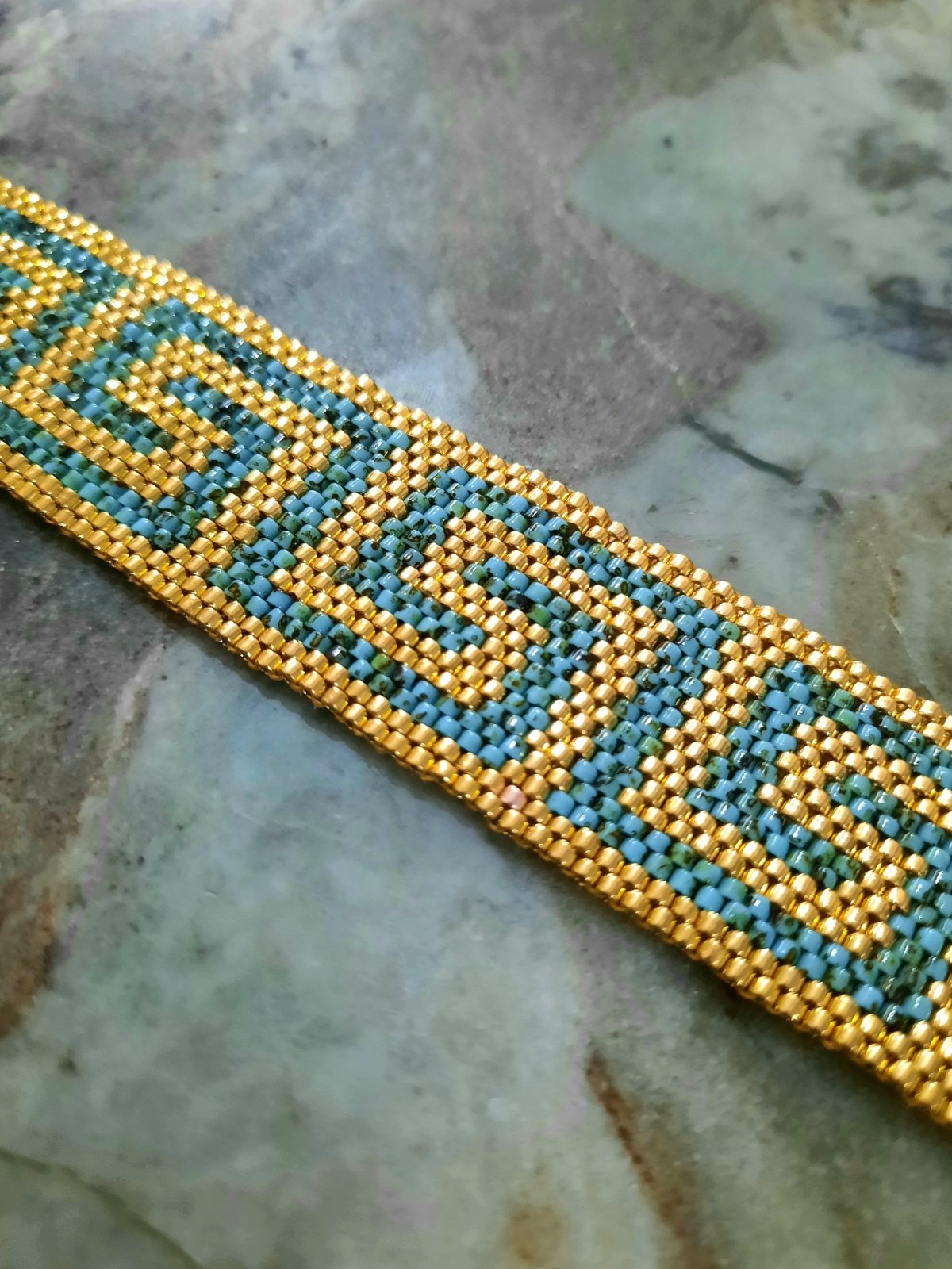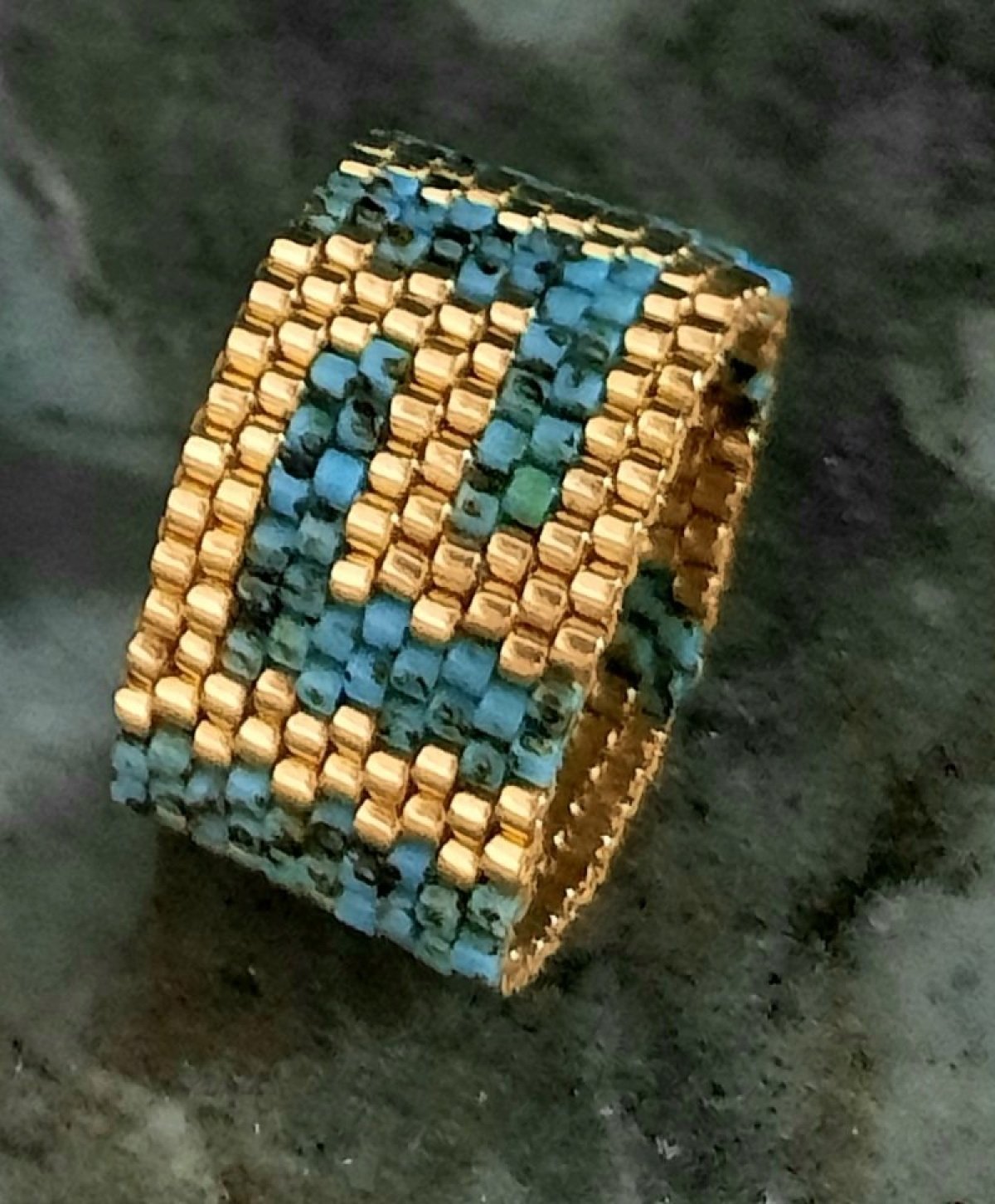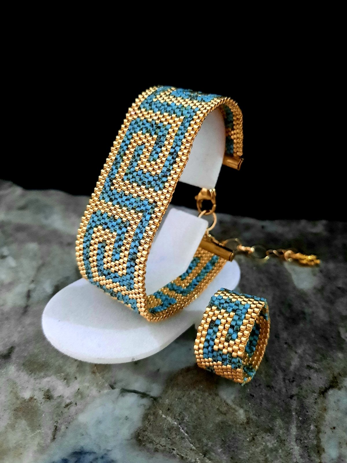 طاقم مصمم بنمط الفيرزاتشى عبارة عن إسورة بمزيج من اللون الفيروزى مع الذهبى بلمسة رائعة وتناغم رائع .. بالأضافة الى خاتم بنفس النمط ..مصنوع بالكامل من خرز الميوكى اليابانى .. جميع المواد المعدنية المستخدمة غير قابلة للصدأ او تغيير اللون .. ولا تسبب التحسس ..الوزن خفيف جداا ..