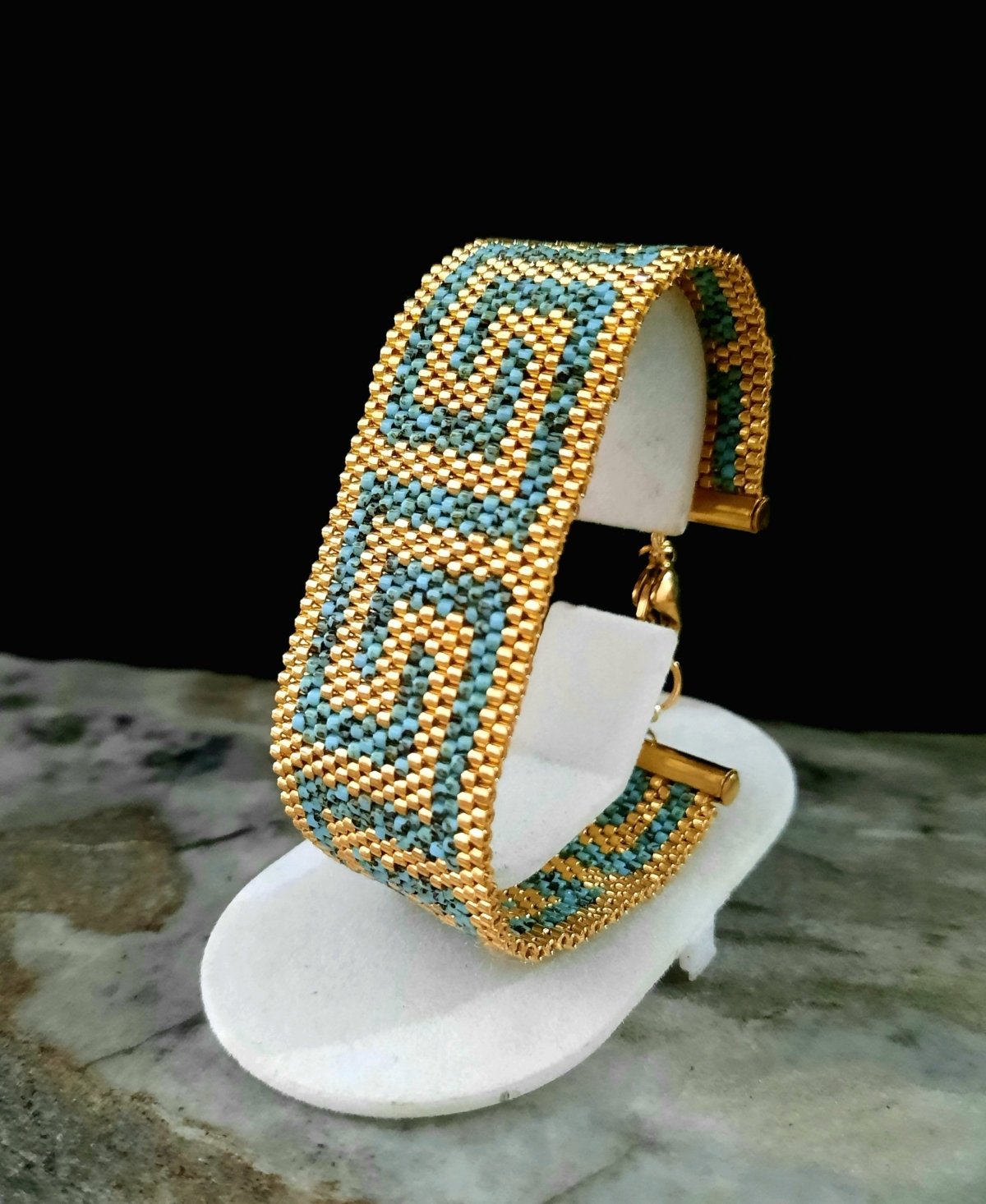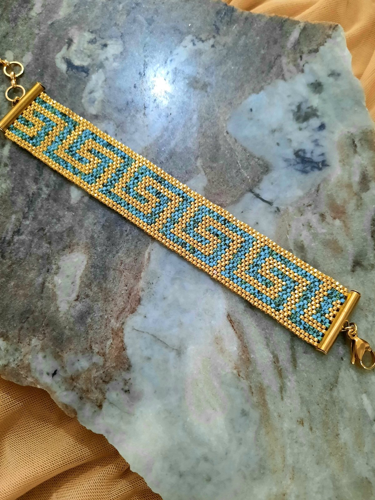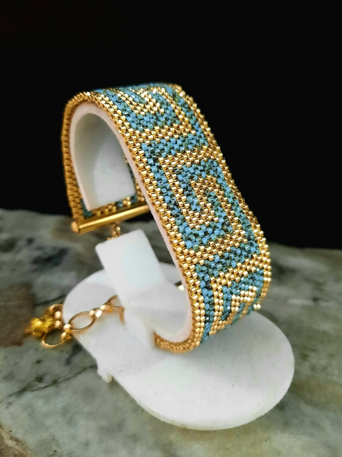 طاقم مصمم بنمط الفيرزاتشى عبارة عن إسورة بمزيج من اللون الفيروزى مع الذهبى بلمسة رائعة وتناغم رائع .. بالأضافة الى خاتم بنفس النمط ..مصنوع بالكامل من خرز الميوكى اليابانى .. جميع المواد المعدنية المستخدمة غير قابلة للصدأ او تغيير اللون .. ولا تسبب التحسس ..الوزن خفيف جداا ..