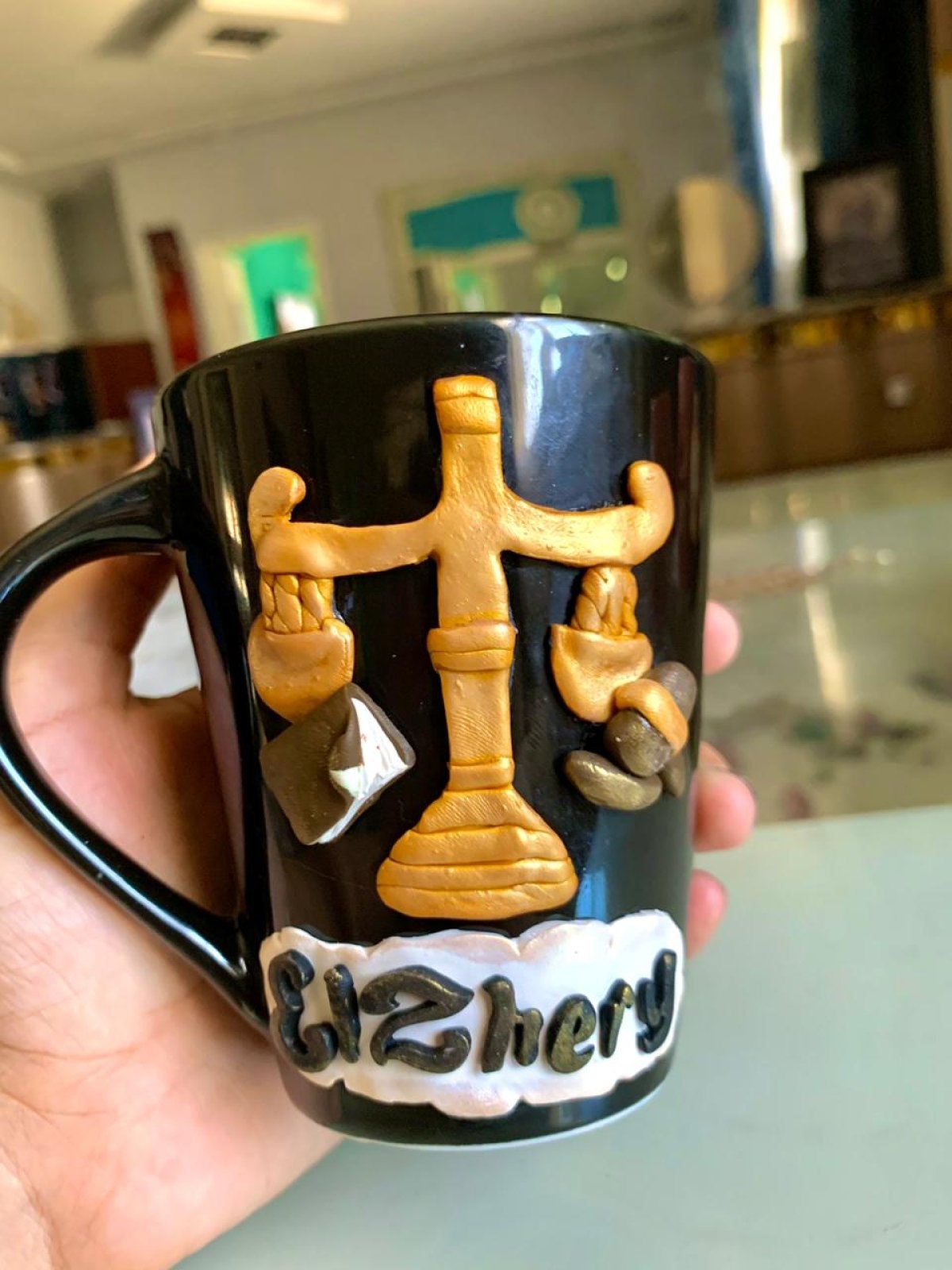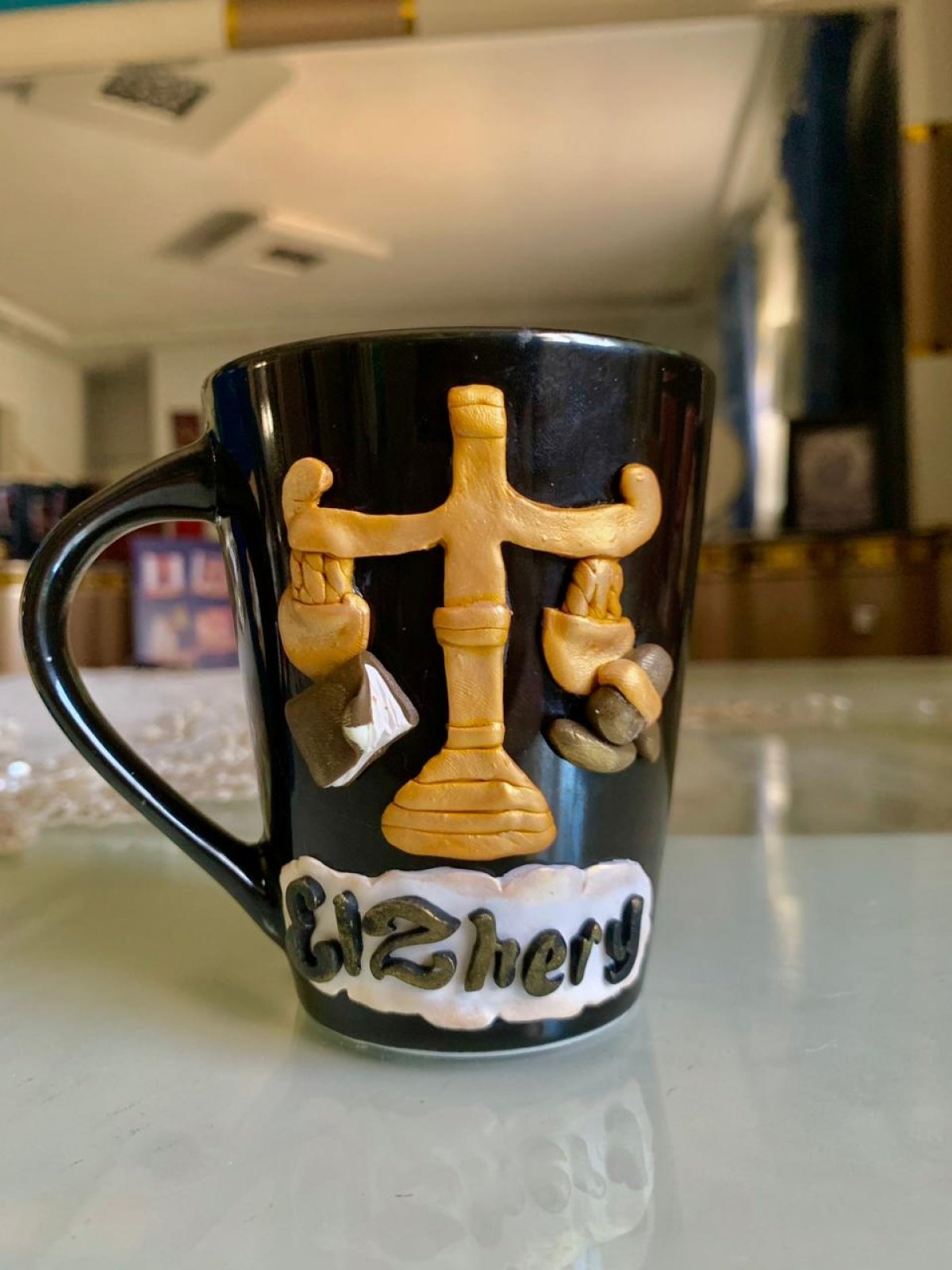 مج عليه شكل يخص المحامي من الصلصال الحراري سعة المج حوالي ٣٣٠ ملل لا يدخل الفرن او الميكروويف ويمكن تغير الاسم ولون المج
