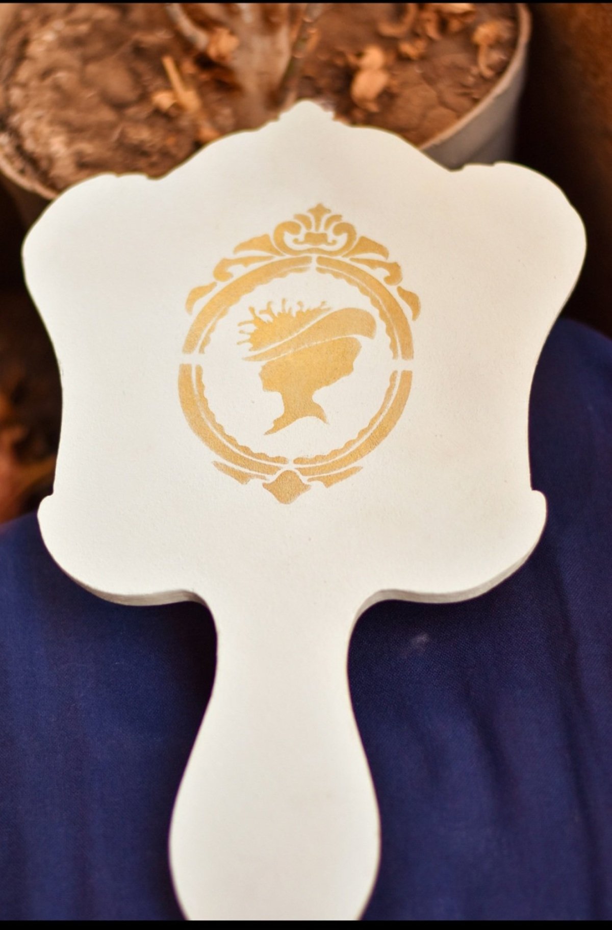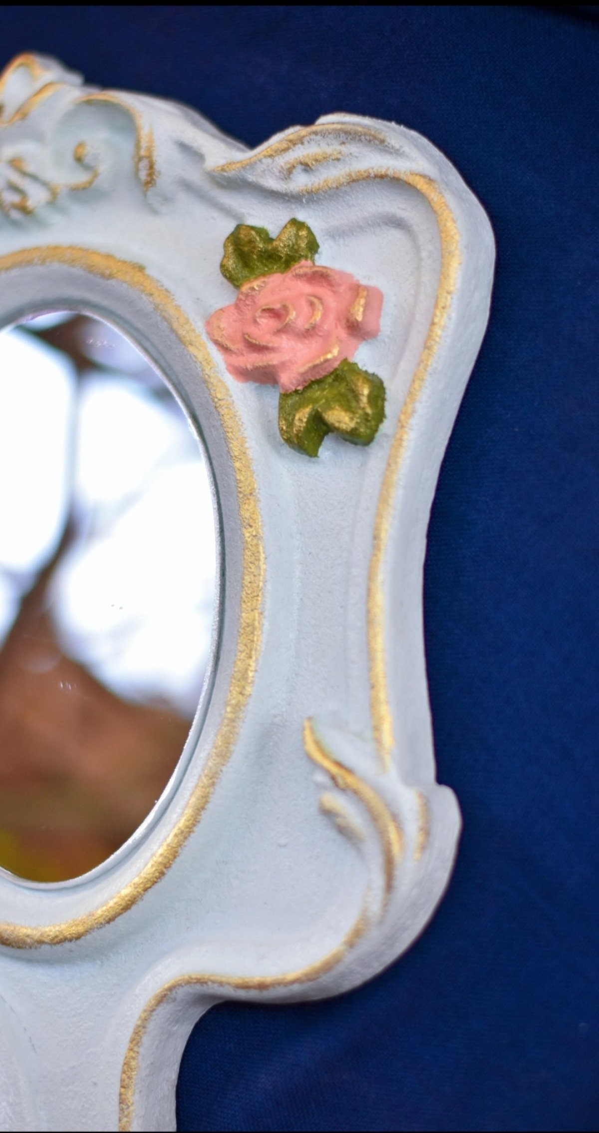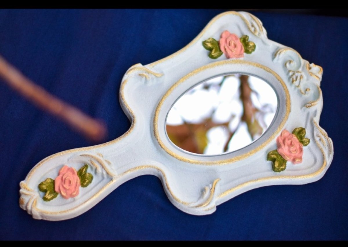 مراية يد مطعمه بأويمة من الورود البارزه واللون الذهبي ورسمه فيكتوري من الخلف