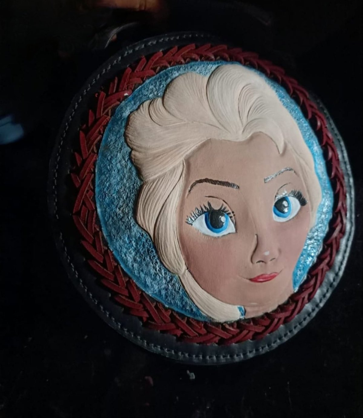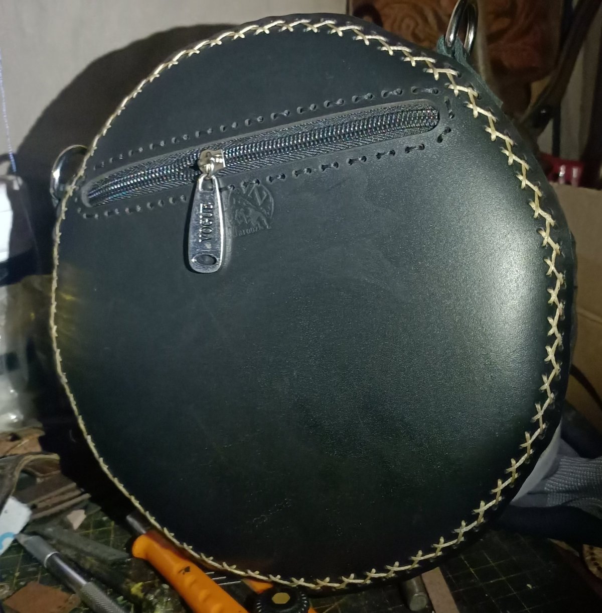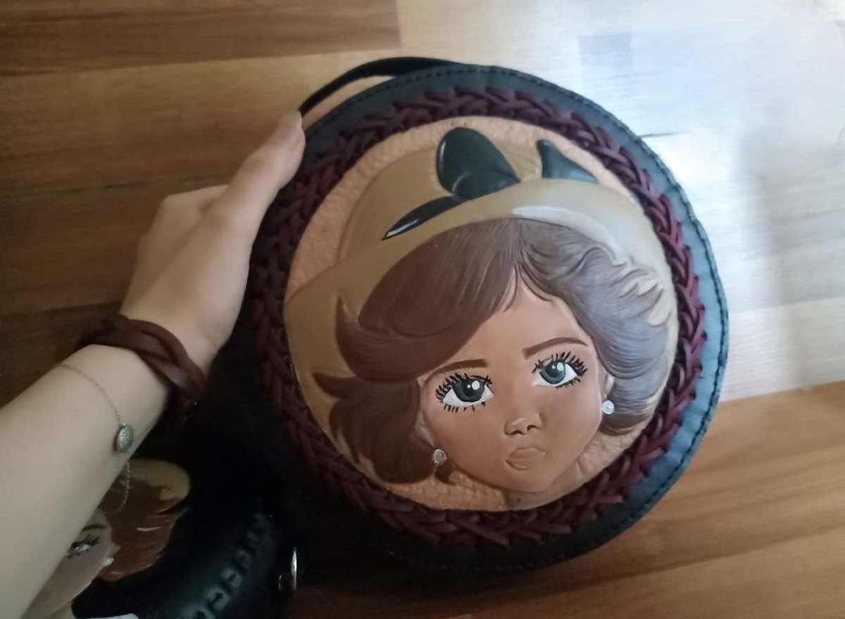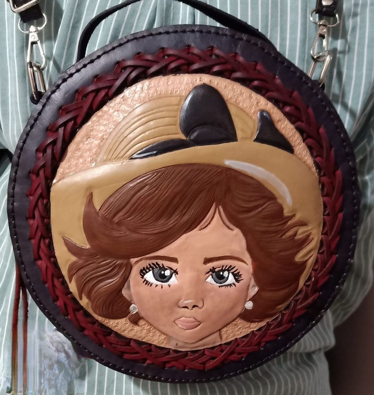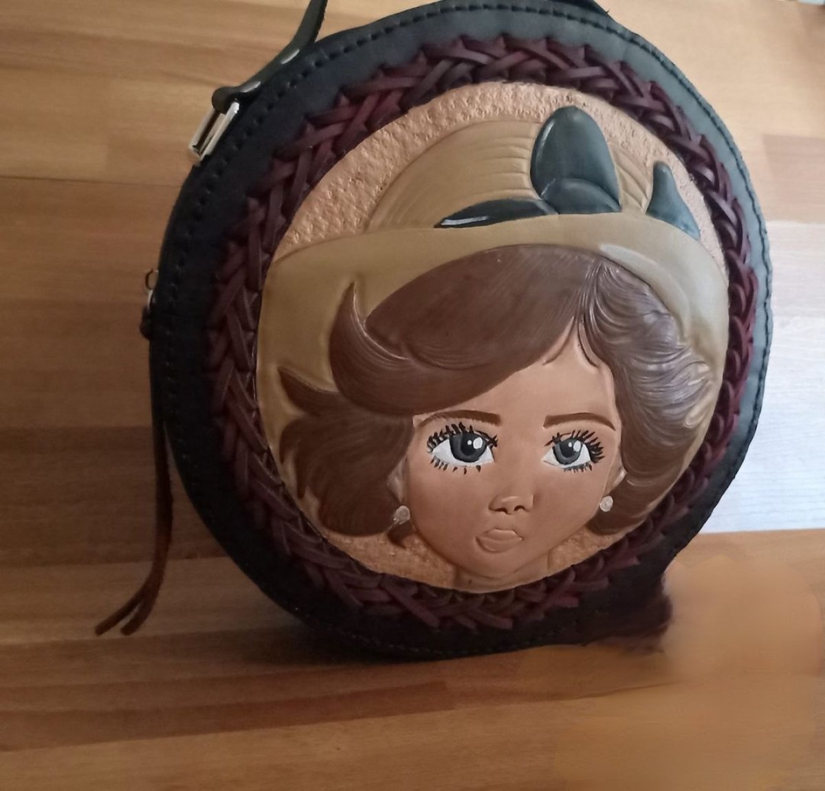 شنطه كروس حريمي جلد بقري بالكامل متبطنه جلد من الداخل القطر 26سم الرسم والحفر والتأبيب والتلوين يدوي بالكامل الضفيره على الوش جلد بقري