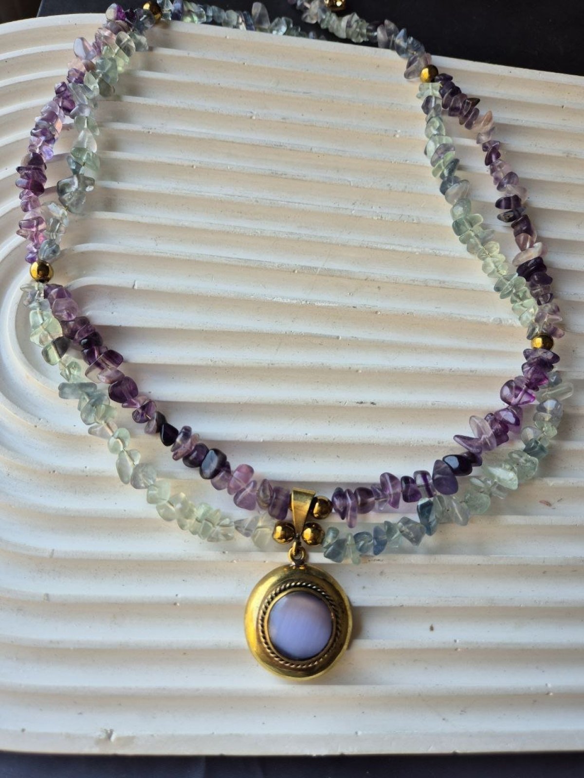 كوليه من حجر الفلورايت مع فواصل هيماتيت و دلاية نحاس بفص عقيق