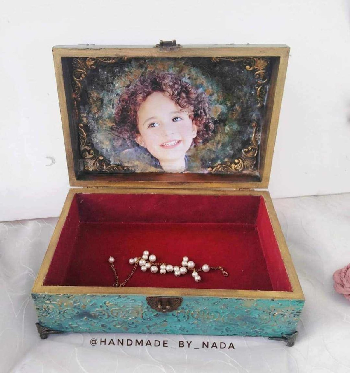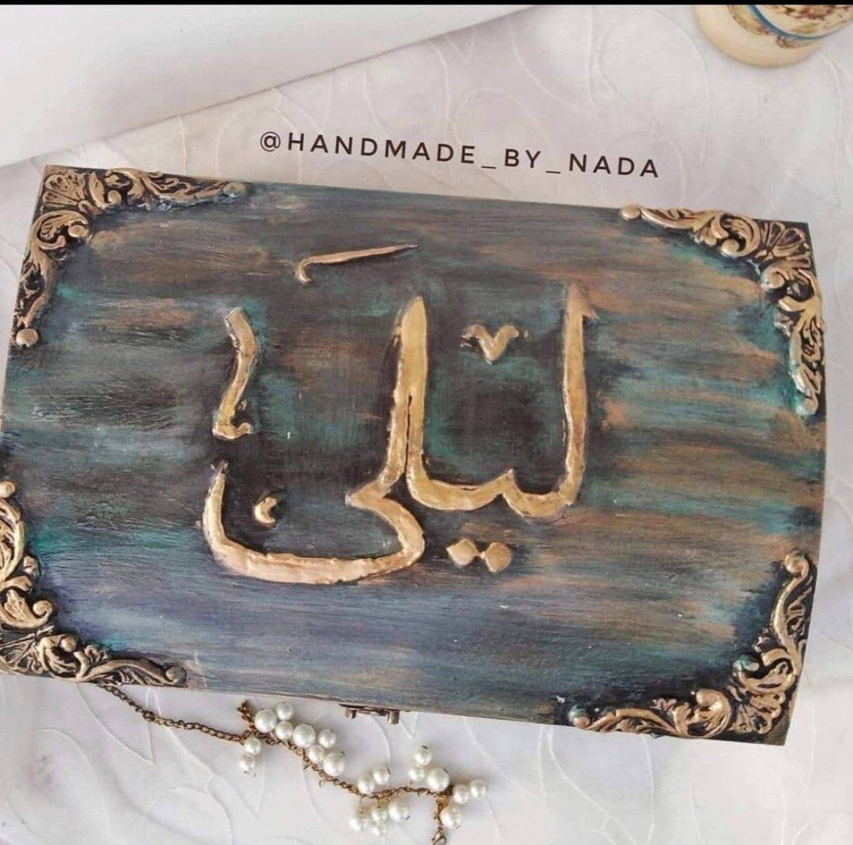 صندوق خشبي عتيق بصورتك واسمك محفور من الخارج بورق الدهب