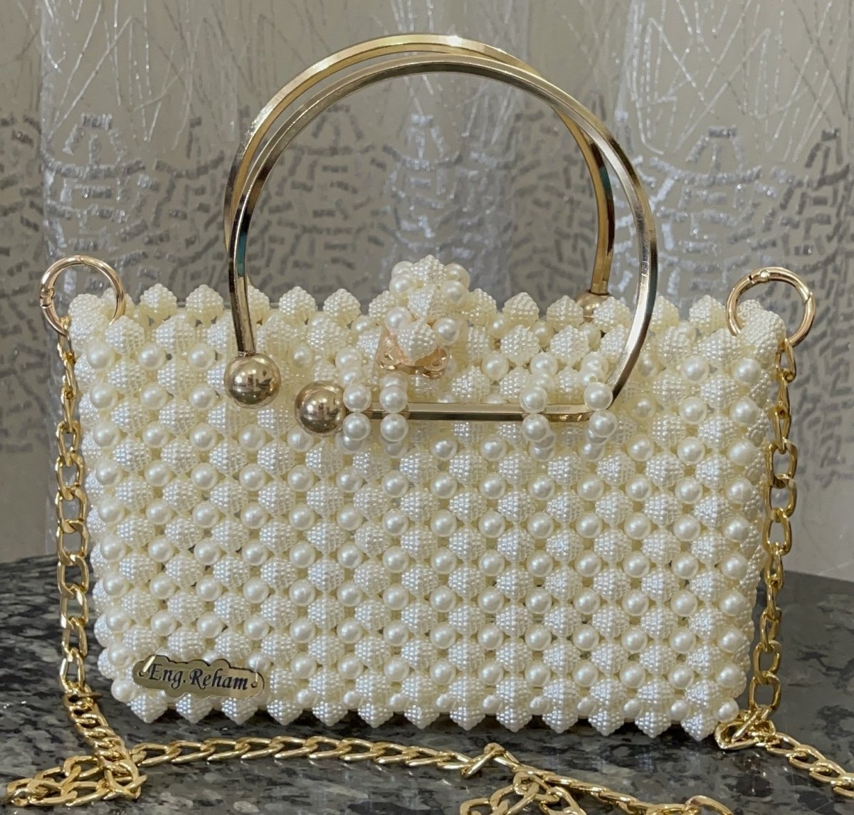 شنطة من خرز فتافيت السكر والخرز المدور ٢ يد معدنى ذهبى وحزام معدنى ذهبى بحلقات معدنيه مع قفل مغناطيس للغلق