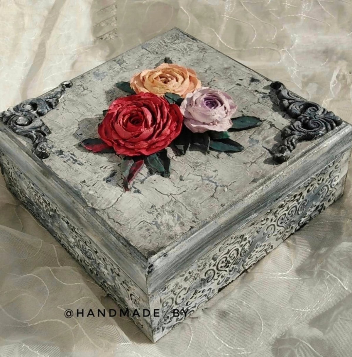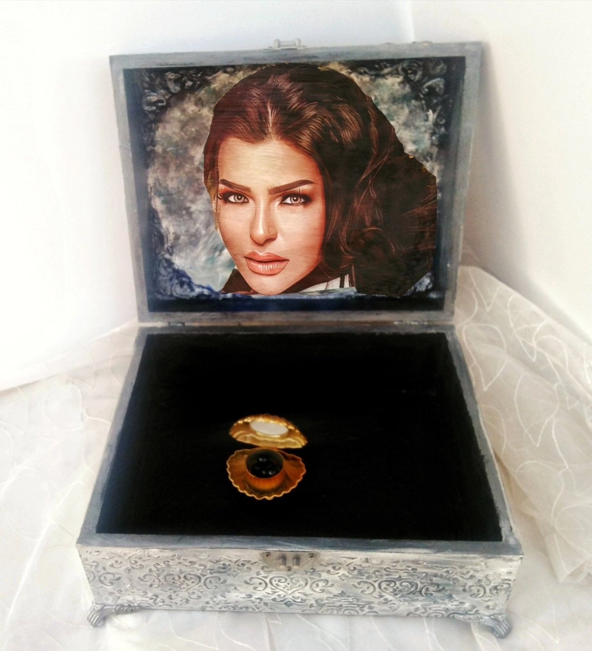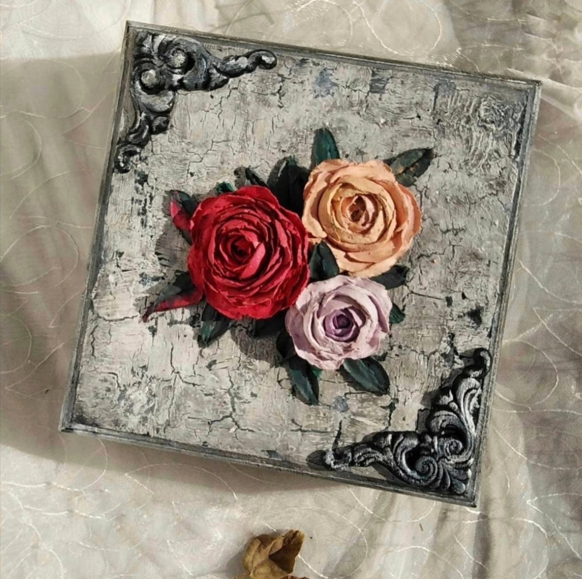 صندوق خشبي عتيق بصورتك والورود البارزة من الخارج