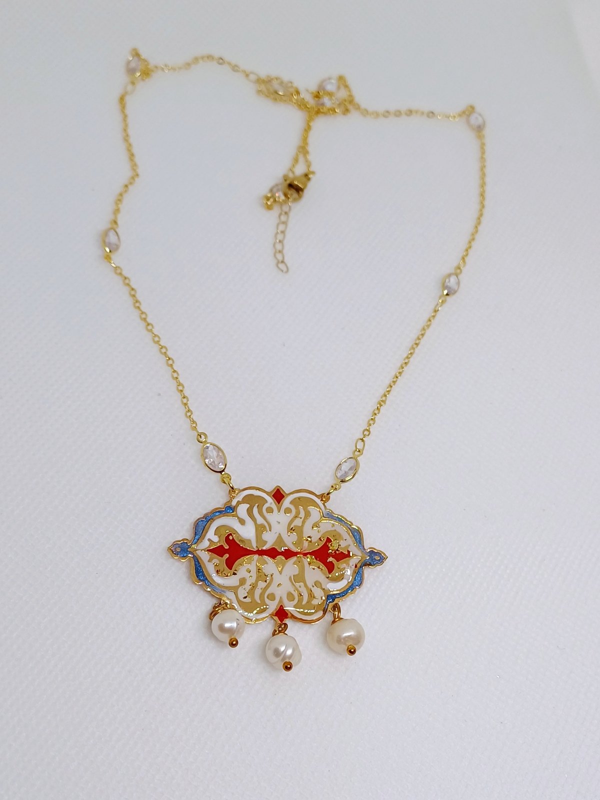 كوليه مميز من النحاس المطلي دهب و مطعم بألوان اللامعه مستوحي من الزخارف الاسلاميه و منفذ بطريقه والوان عصريه 🥰