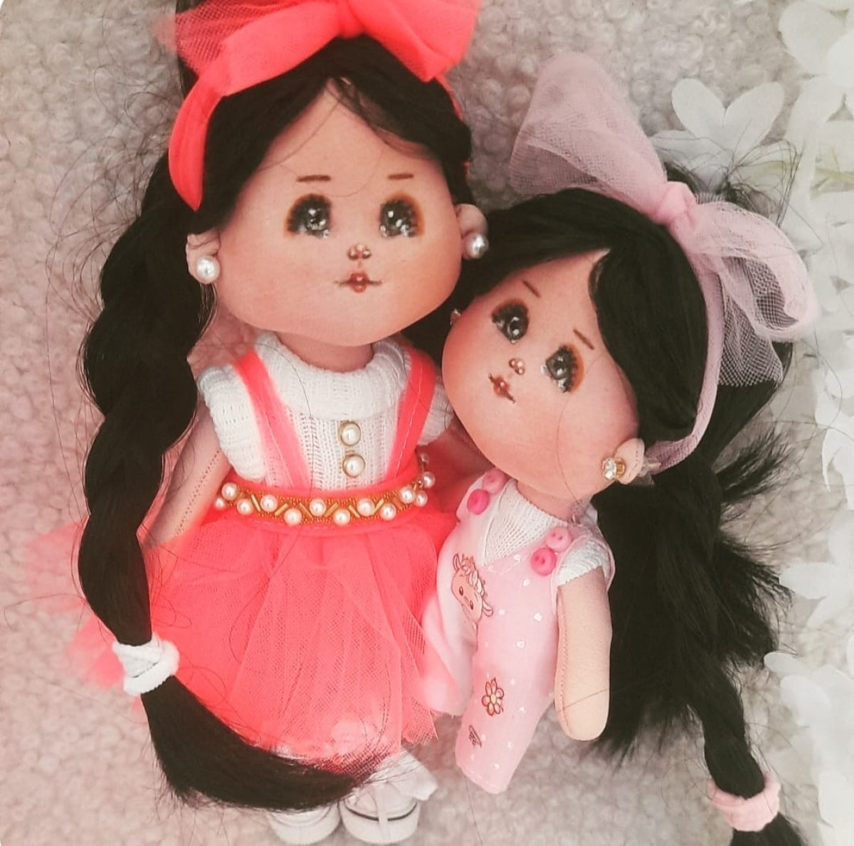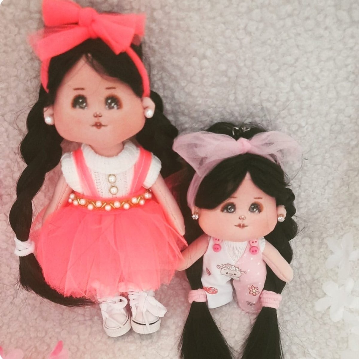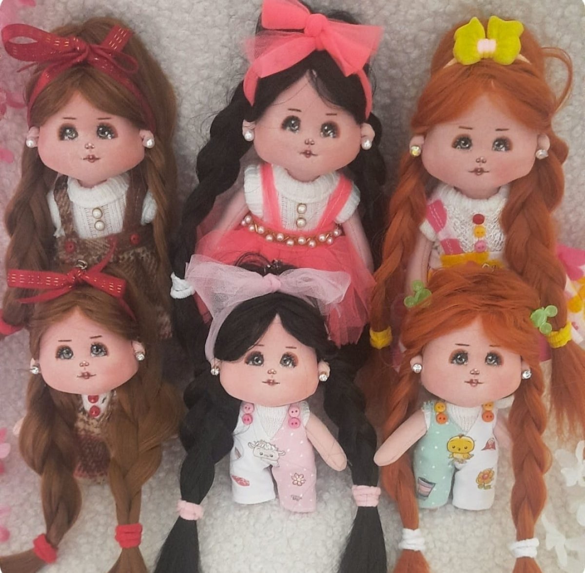 عرايس هاند ميد من القماش مناسبه لكل الأعمار وآمنه تماما علي الأطفال الملامح مرسومه يدوي وعليها ماده عازله لثبات الالوان وحمايتها والحفاظ عليها والشعر حراري مخصوص للدمي والملابس منفصله يمكن خلعها