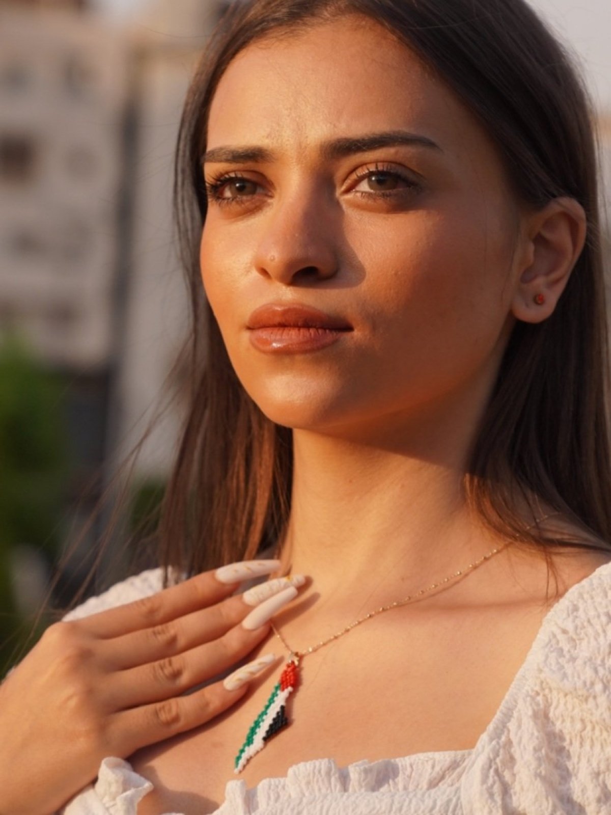 عبارة عن سلسال طوله ٥٥ سم قابل للأطالة .. مع قلادة على شكل خريطة فلسطين بألوان العلم الفلسطينى .. جميع المواد المعدنية المستخدمة غير قابلة للصدأ وتغيير اللون ولا تسبب التحسس .. وزنها خفيف جداا