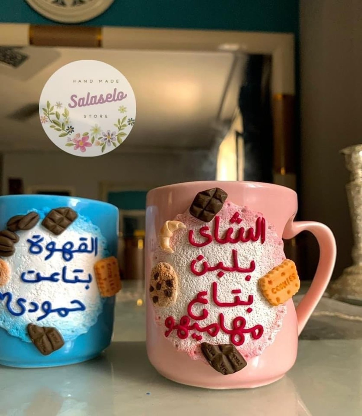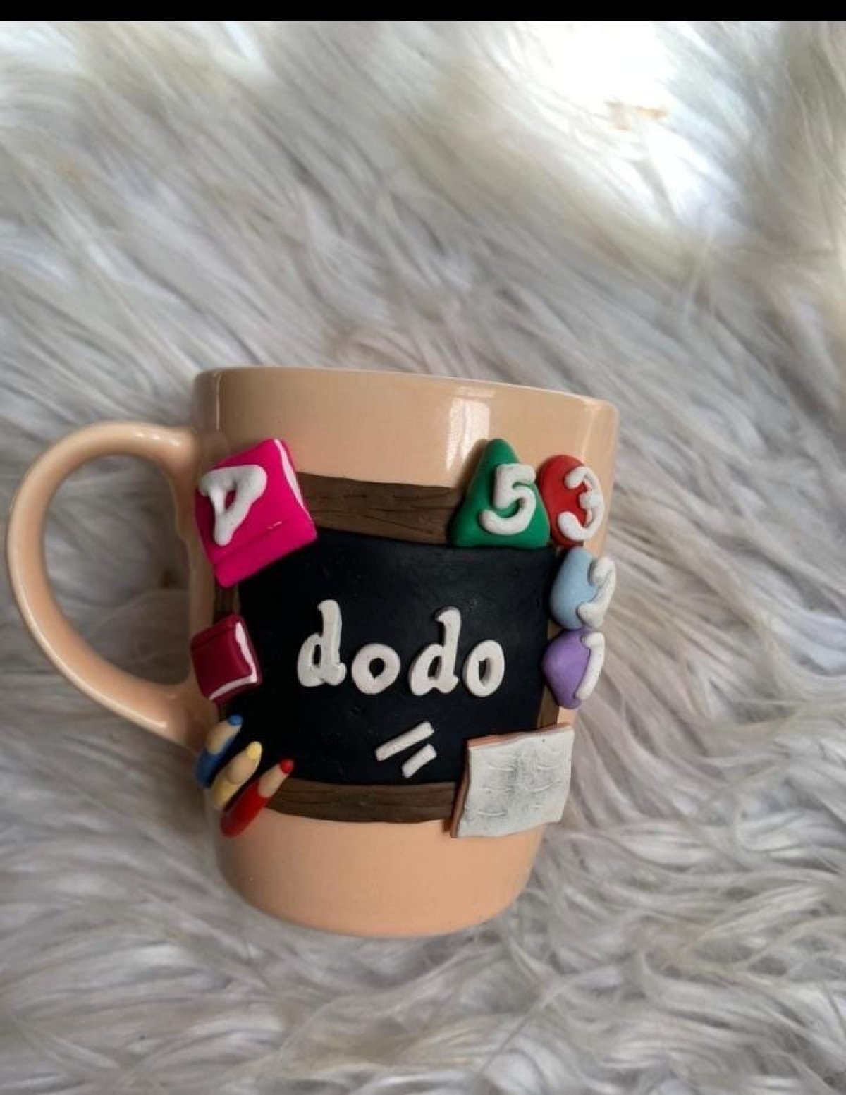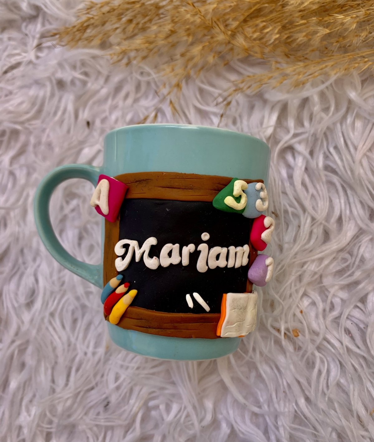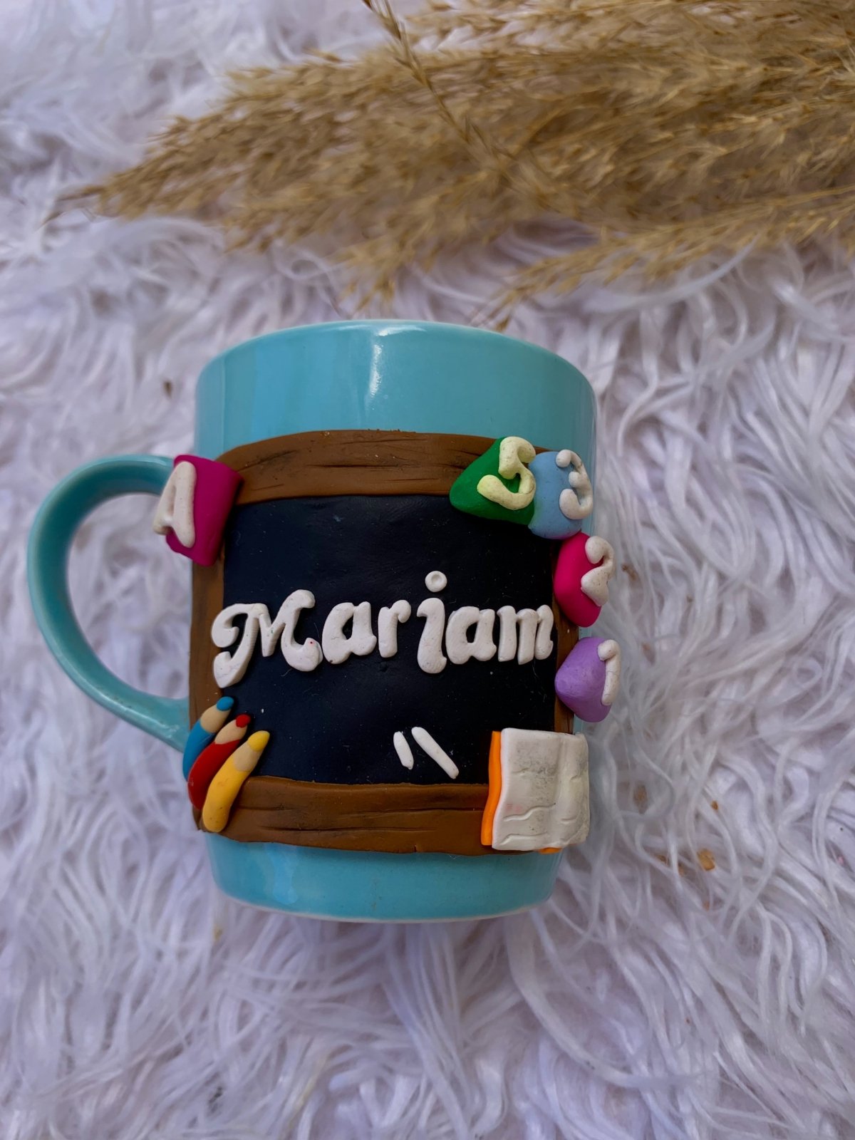 مج مصنوع من الصلصال الحراري ألوان لا تتأثر بالماء ولكن لا يدخل الفرن او الميكرويف تصميم خاص بالاسم للمدرسين سعه المج ٣٣٠ ملل