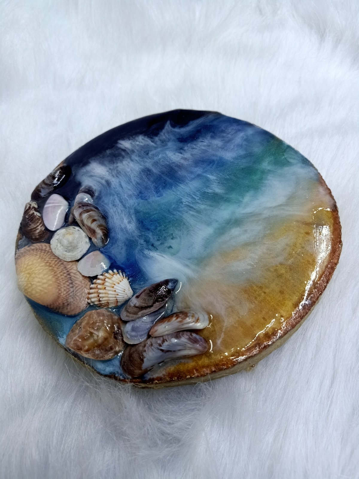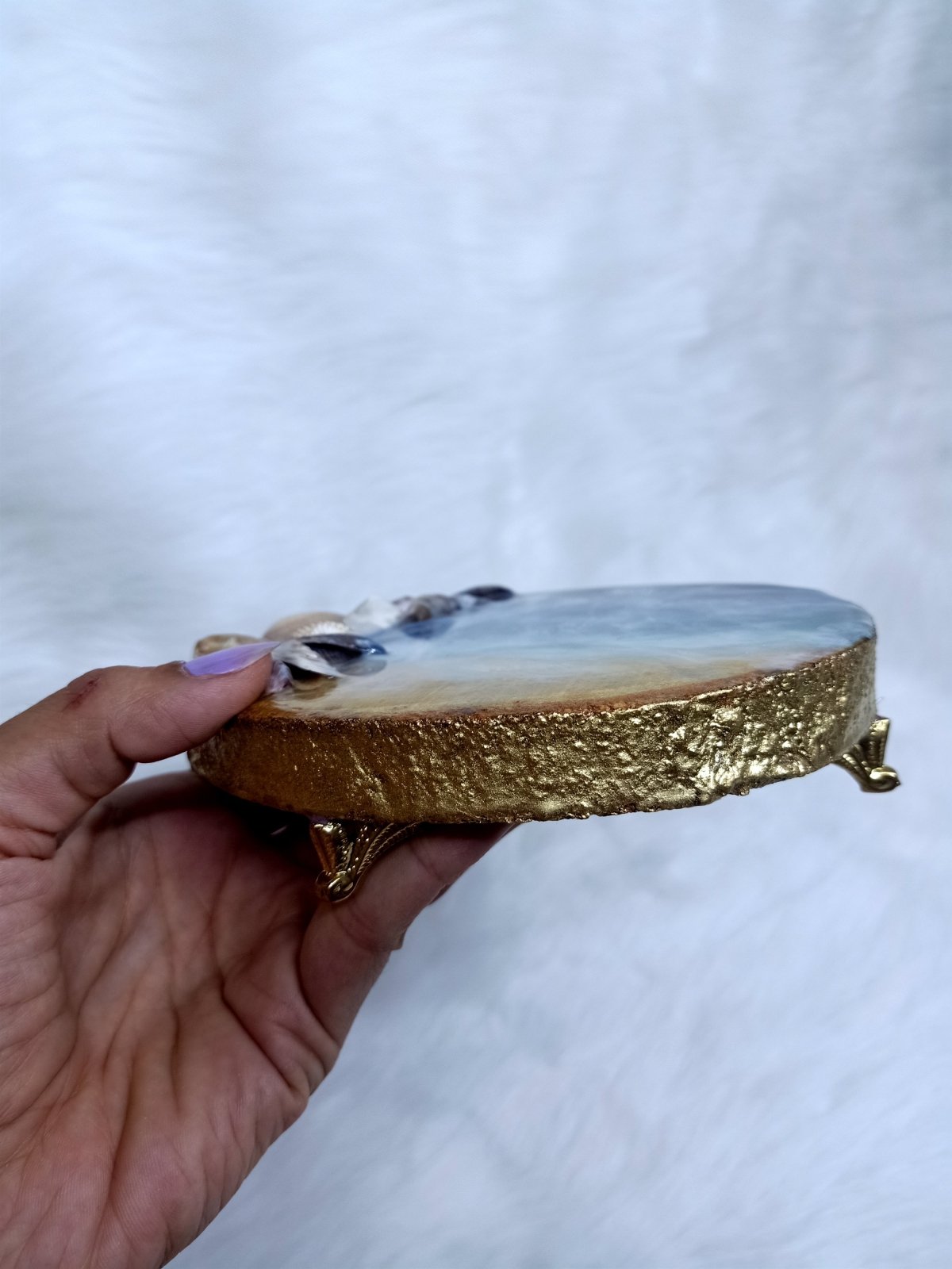 كوستر شجر خشب طبيعي ريزن موج البحر بالصدف مقاس ٢٠ سم بارجل معدن دهبي