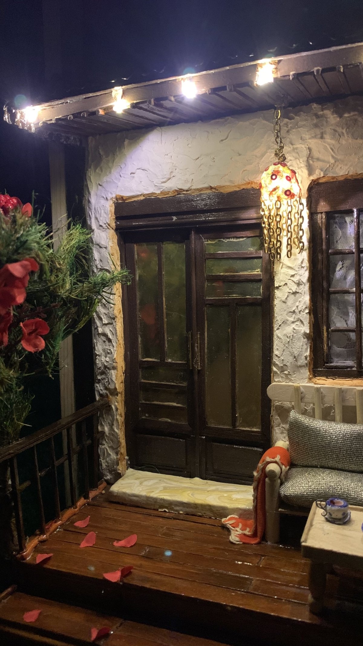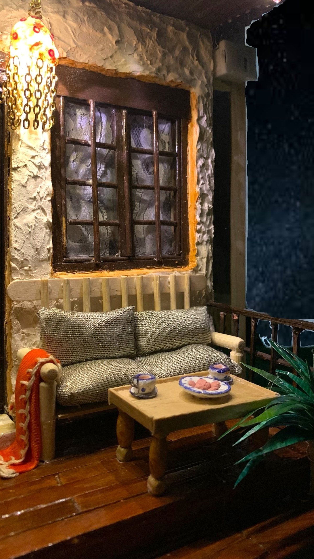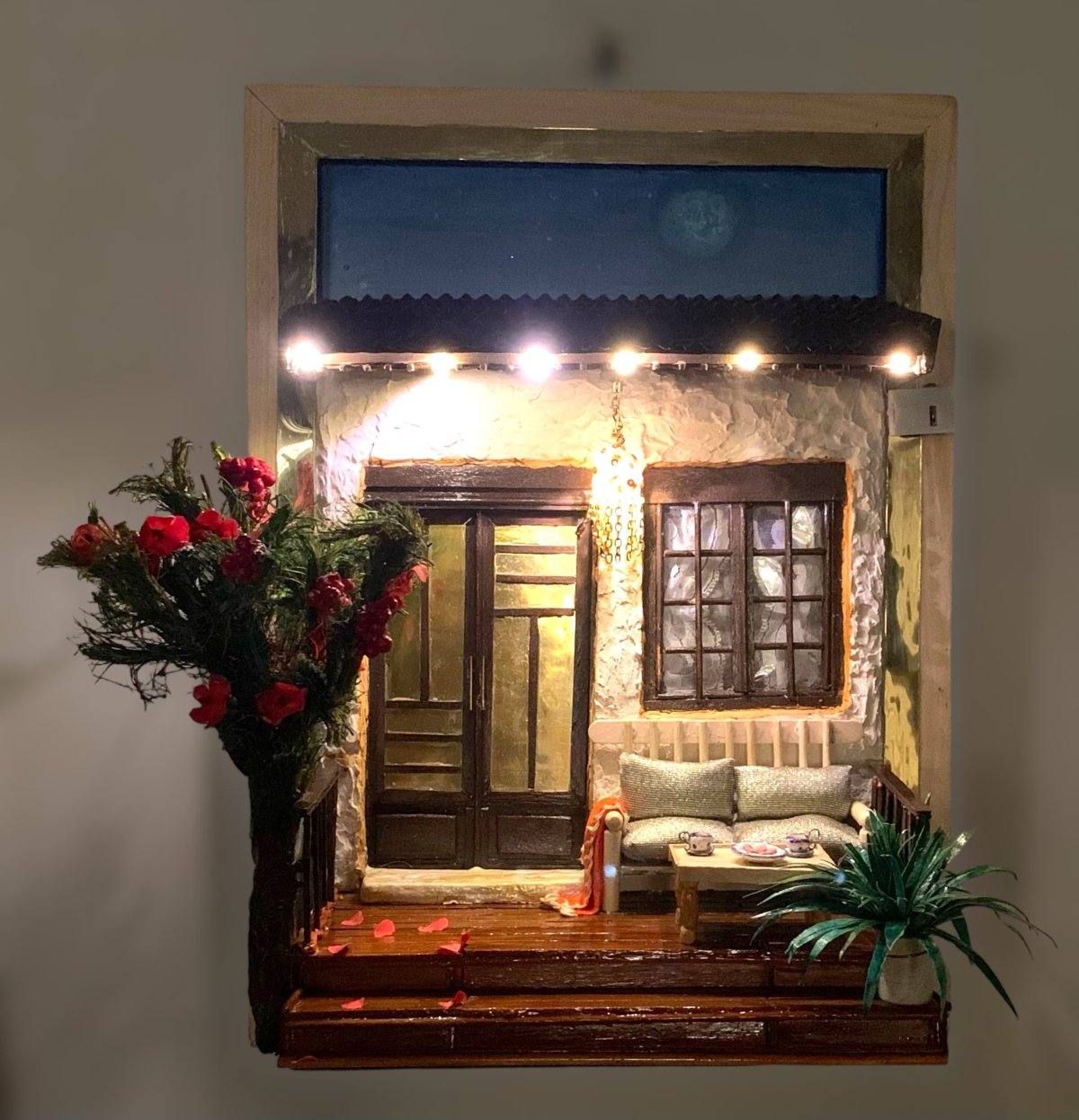 تابلوه معلق من فن الديوراما مصنع يدويا يجسد مشهد دافئ لشرفة منزل مزود بإضاءة ومصنوع من الخشب ، الكارتون، القماش ، العجائن، الاسلاك والورق .. الخ.