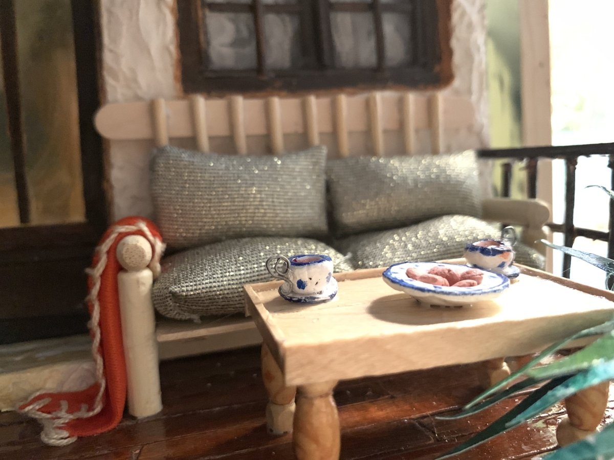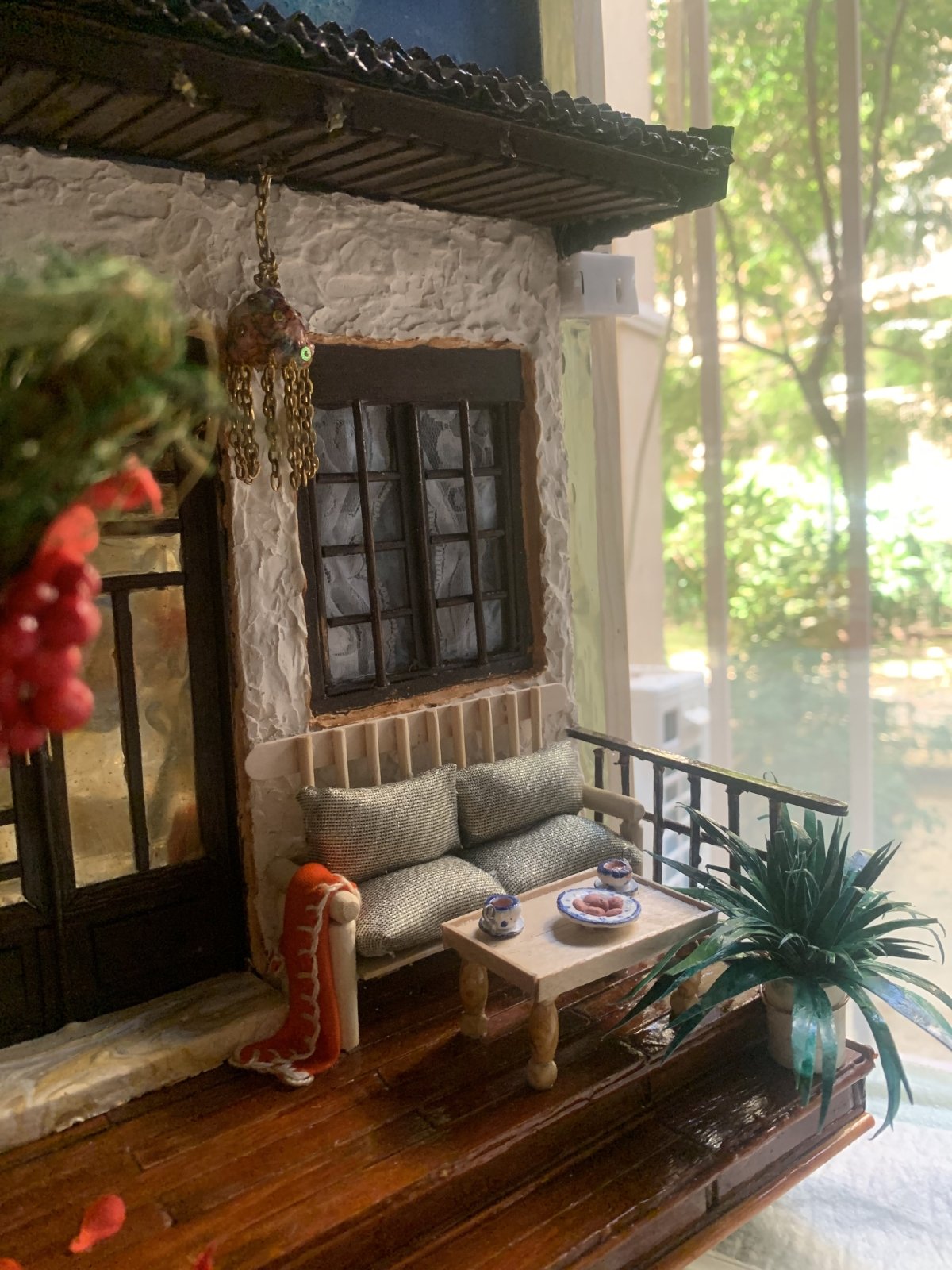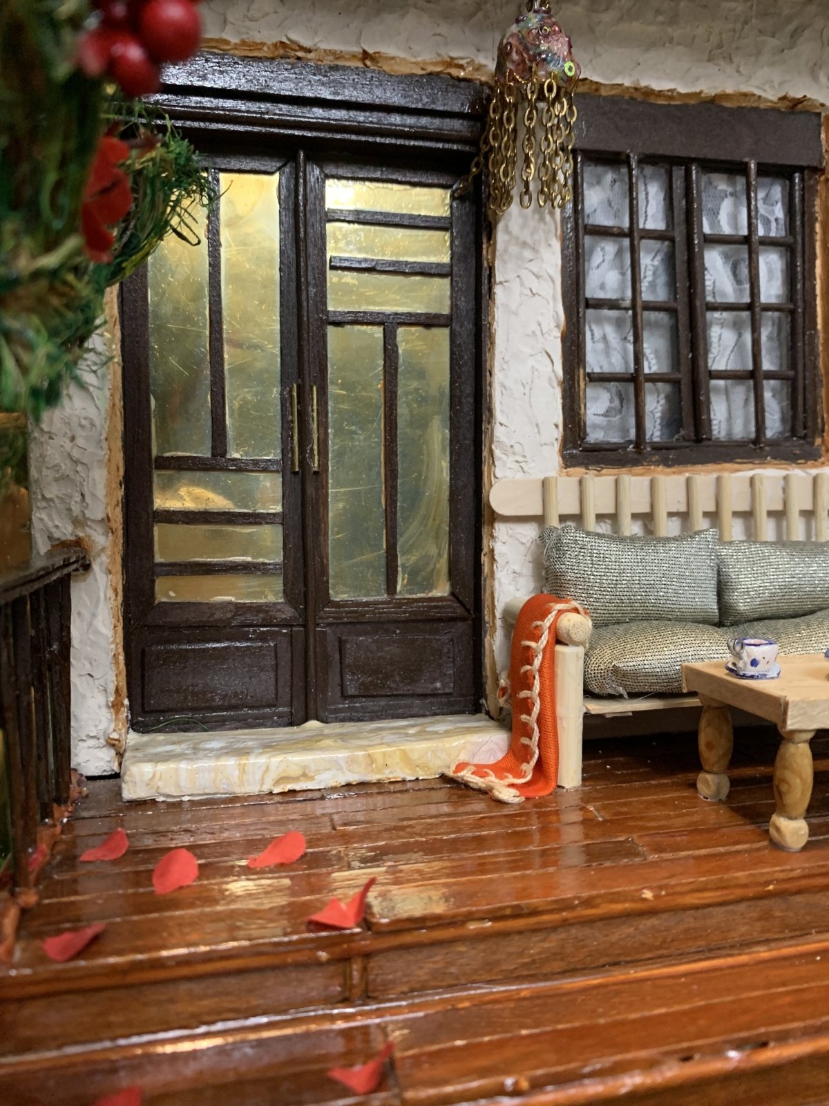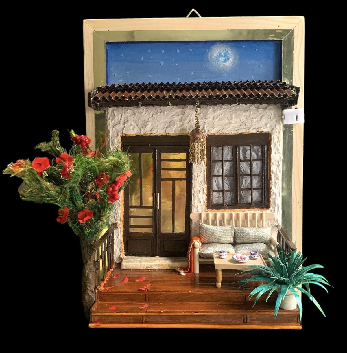 تابلوه معلق من فن الديوراما مصنع يدويا يجسد مشهد دافئ لشرفة منزل مزود بإضاءة ومصنوع من الخشب ، الكارتون، القماش ، العجائن، الاسلاك والورق .. الخ.