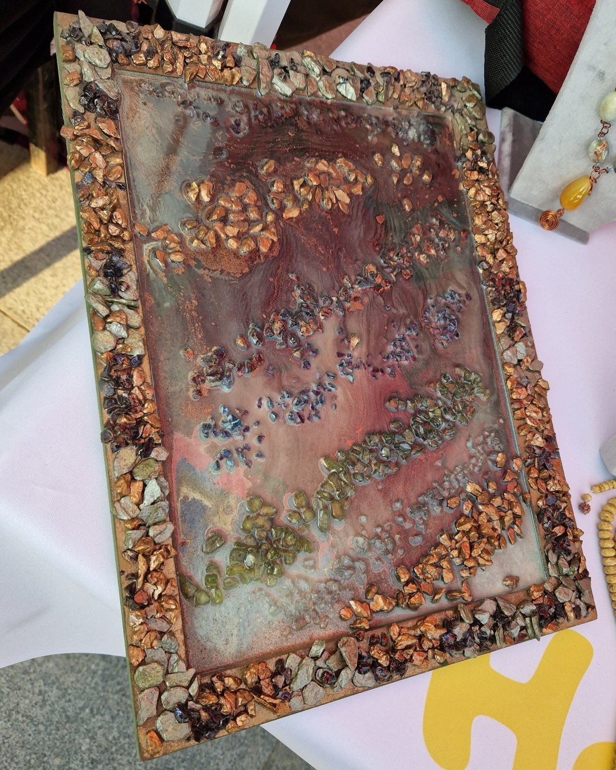 لوحة فنية من الخشب مغطاه والريزن مع الأحجار بألوان كلاسيكية قيمة