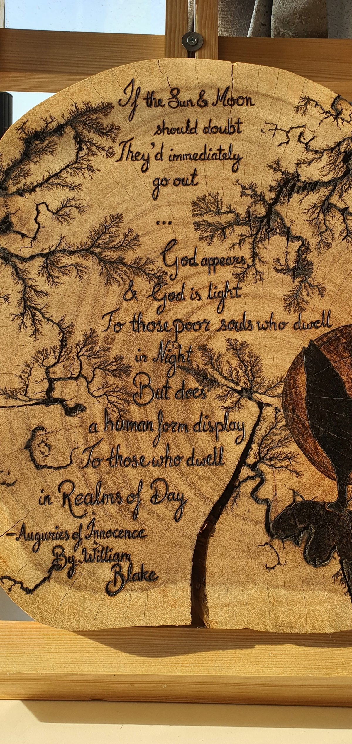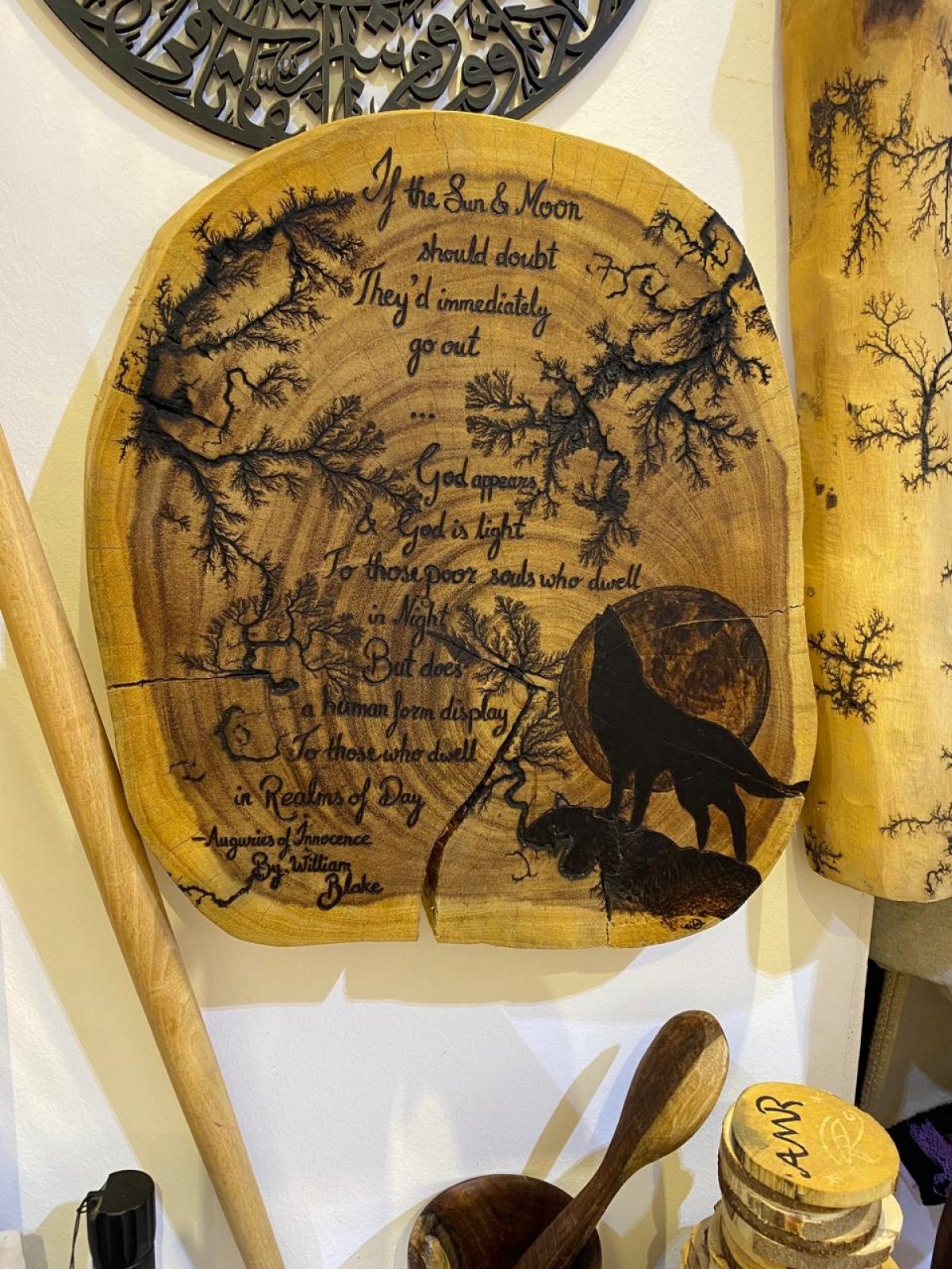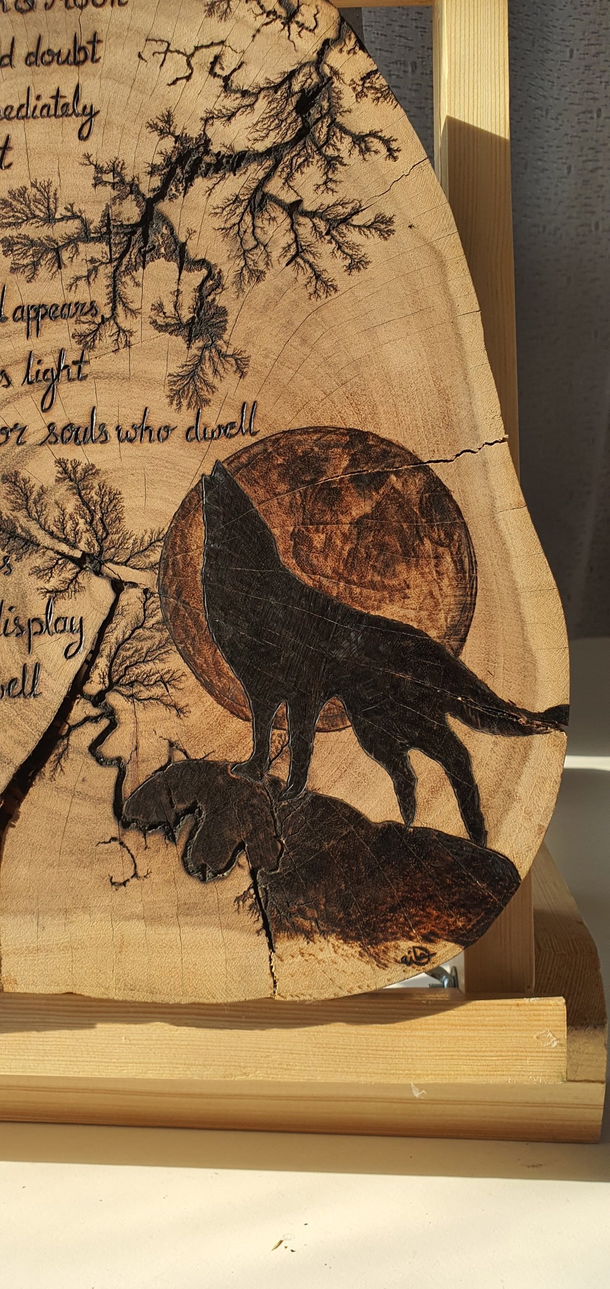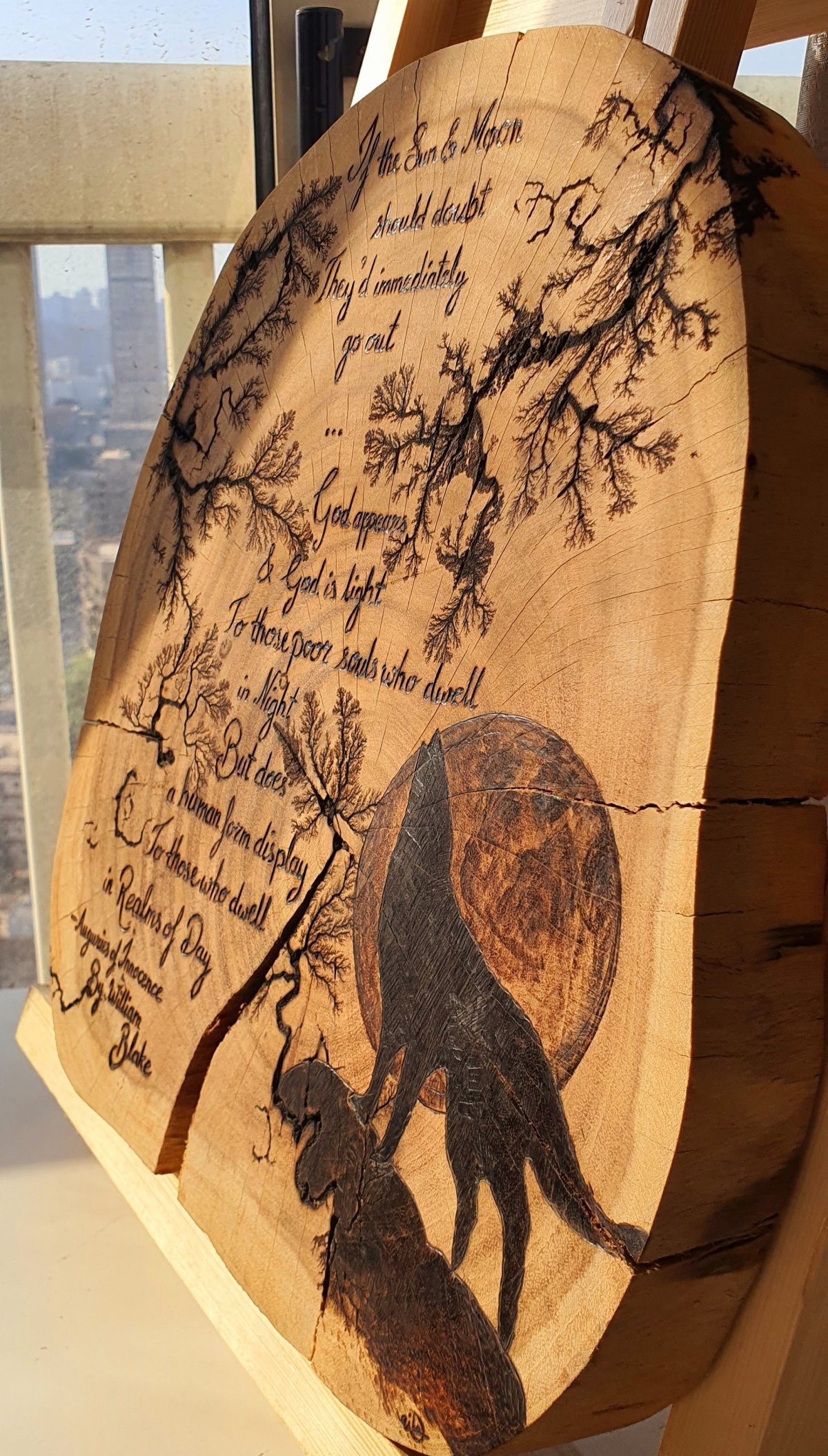 جذع خشب من شجر التوت، مزين بتصميم فريد، نفَّذناه بفن الحرق اليدوي على الخشب، يمكن تعليقه على الحائط لإضافة لمسة فنية دافئة إلى غرفتك أو منزلك. الأبعاد: ارتفاع ٣٥ سم، عرض ٣٢ سم، سمك ٥ سم