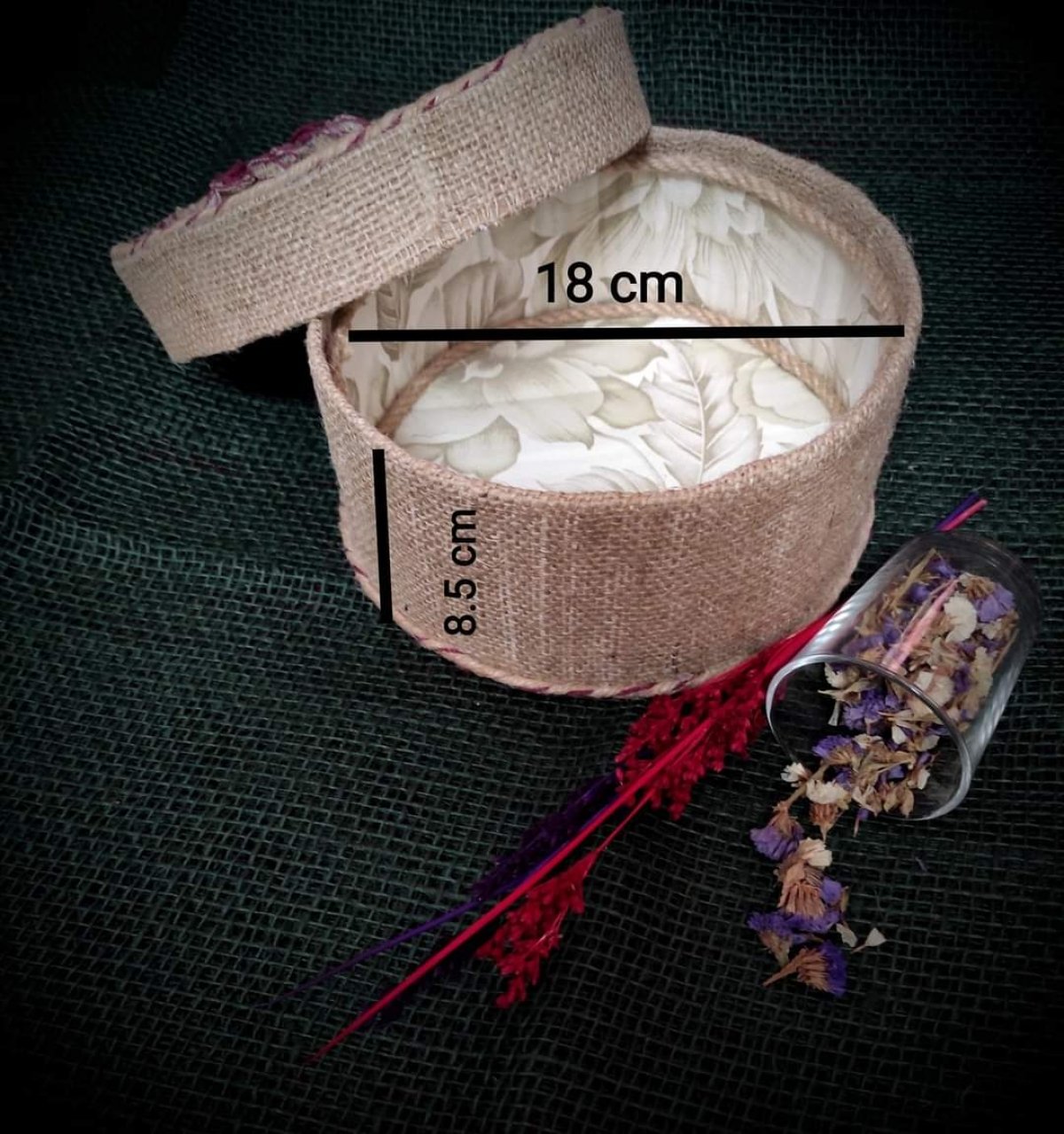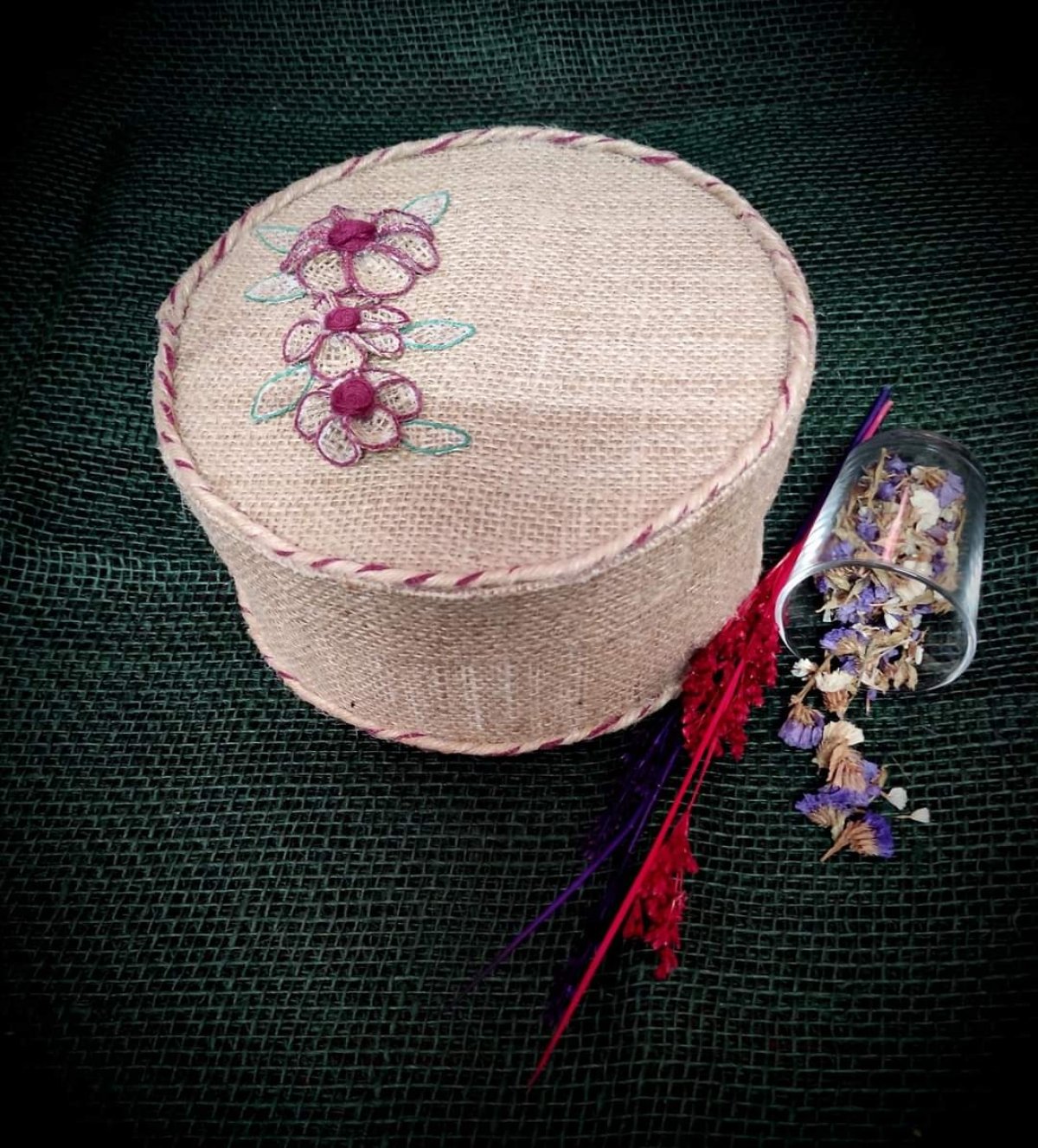 صندوق هدايا دائرى مصنوع من الكرتون المقوى والخيش المطرز