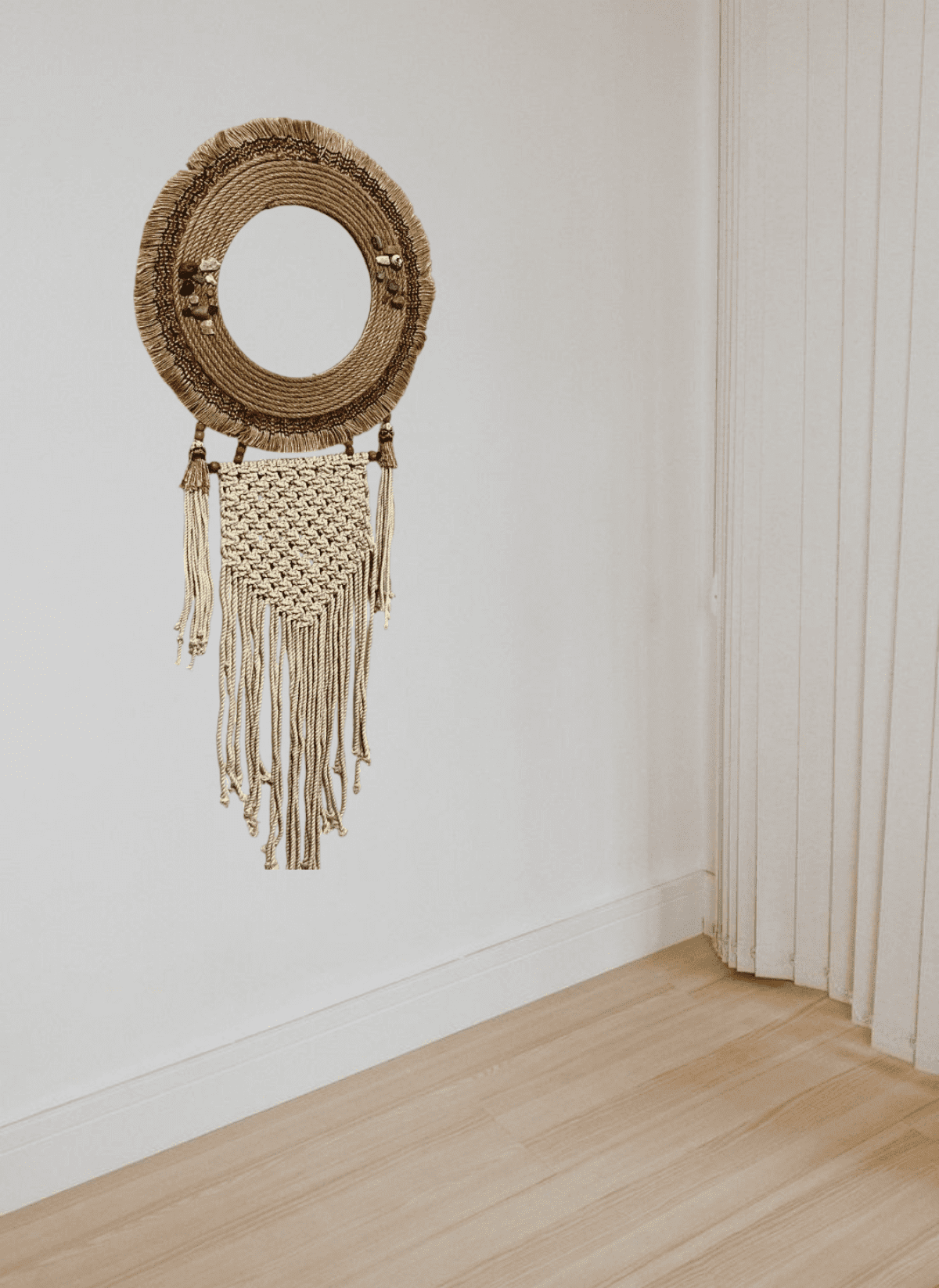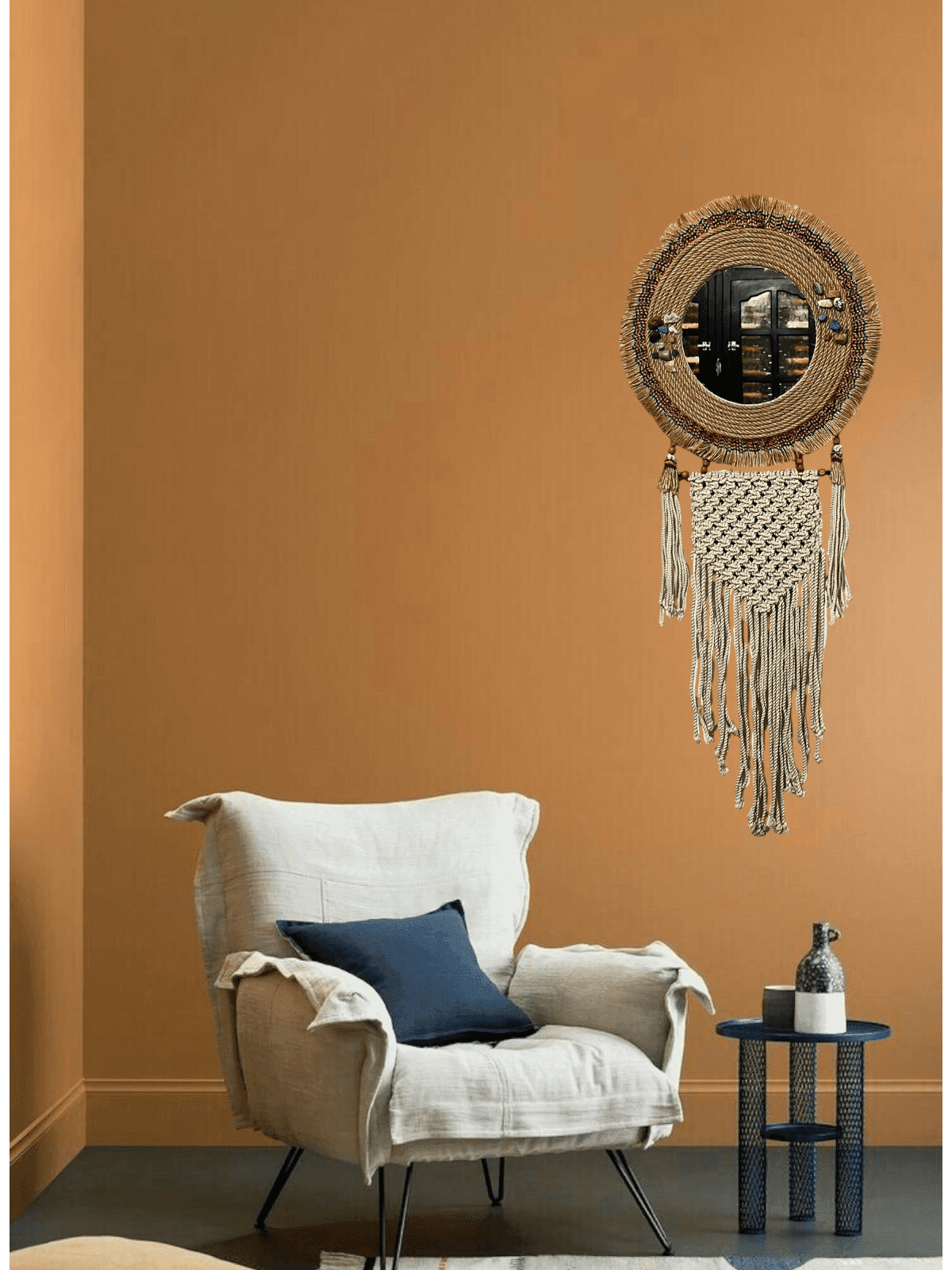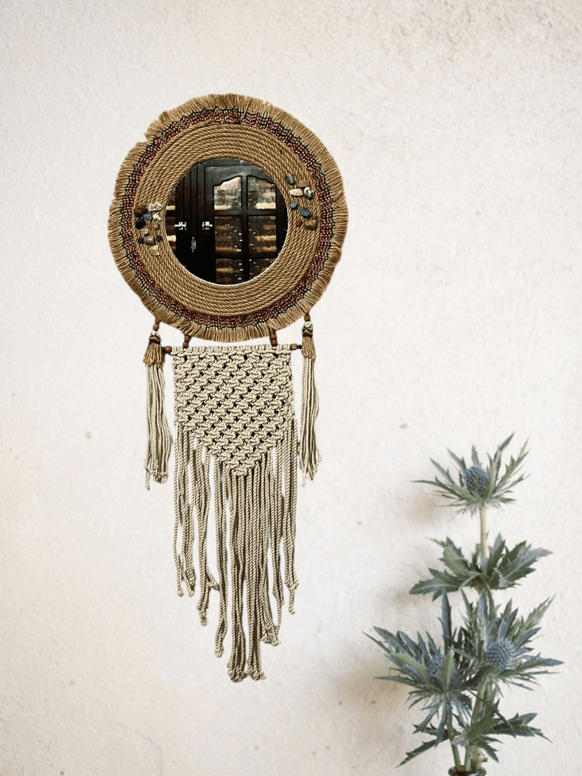 مراية مكرمية مصنوعة من الخيش وقطن المكرمية قطر ٤٠ سم وطول ١٠٠ سم