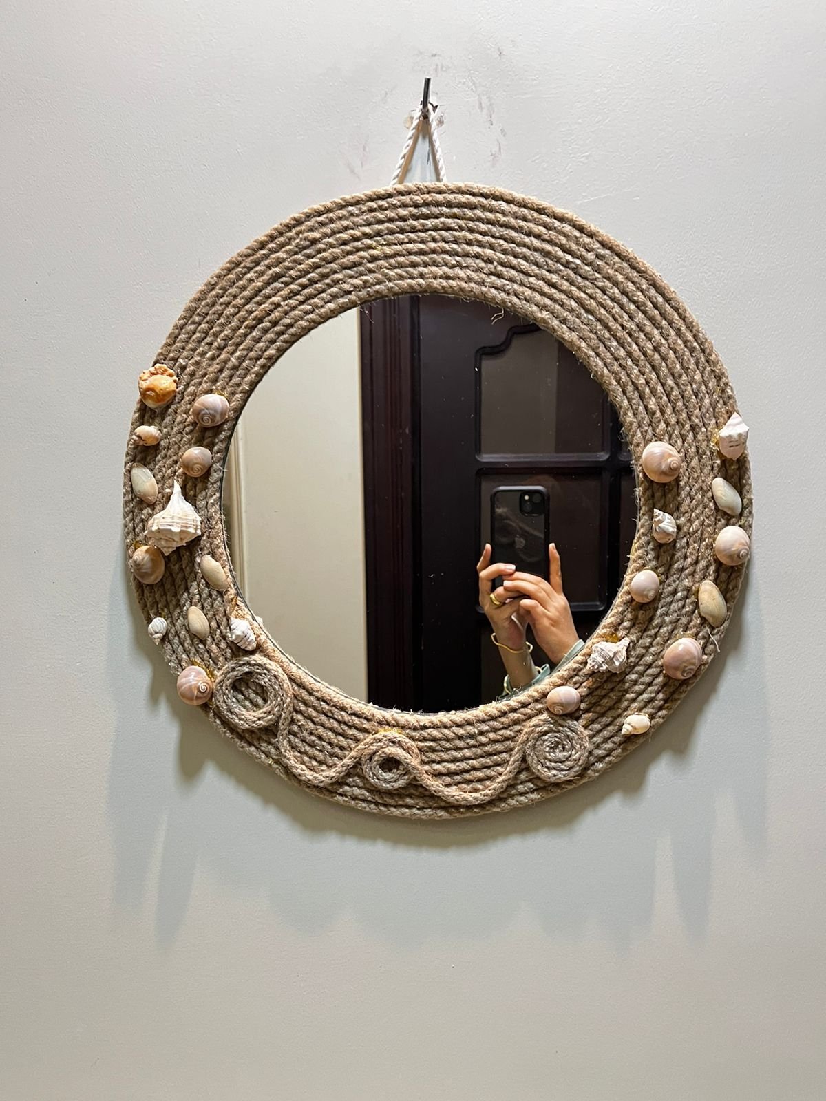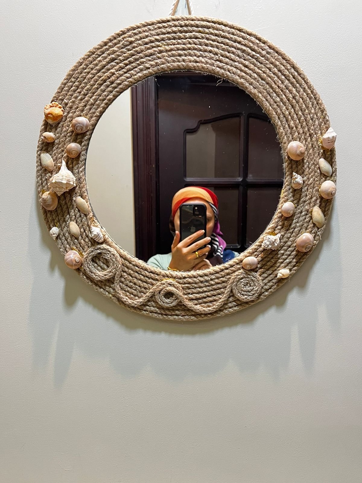 مراية مكرمية مصنوعة من خيط المكرمية وزجاج د. جريش قطر ٤٣ سم لون بني فاتح
