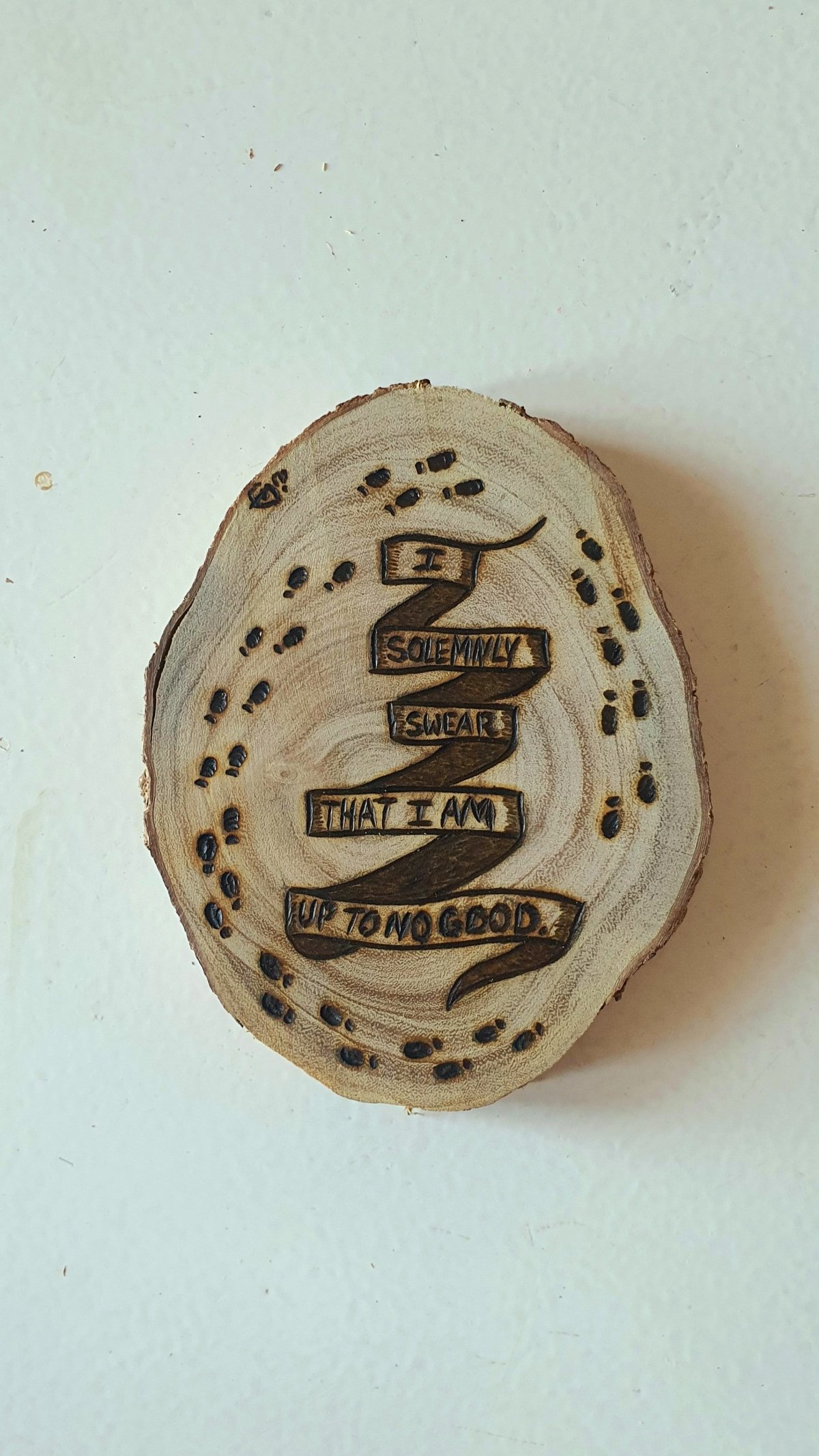 قطعة خشب من جذع شجر، بتصميم فريد نفَّذناه بفن الحرق اليدوي على الخشب، يمكن وضعها على طاولة أو مكتب لإضافة لمسة فنية دافئة إلى غرفتك أو مكتبك.
