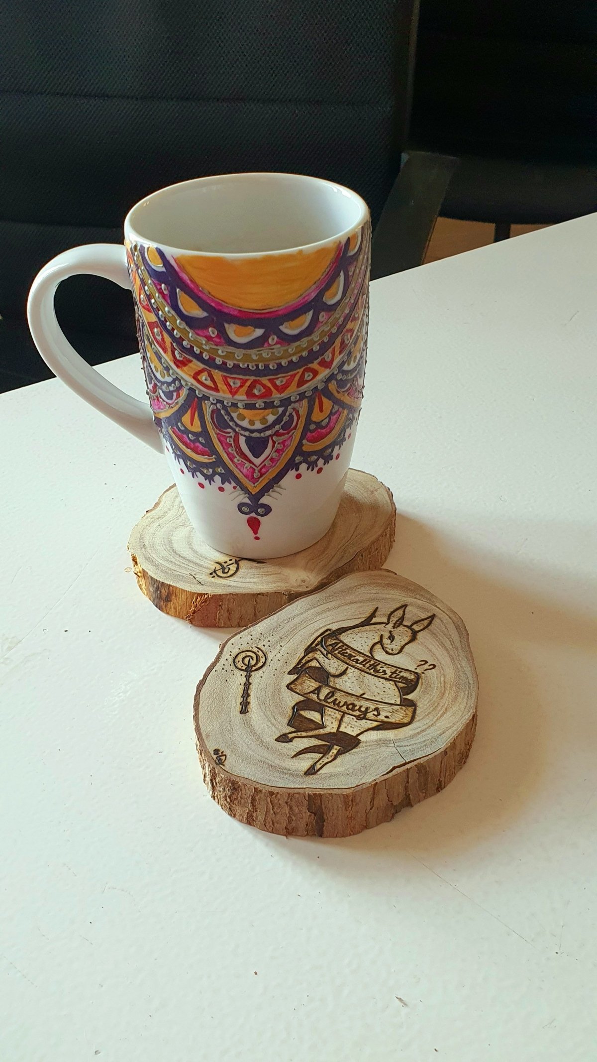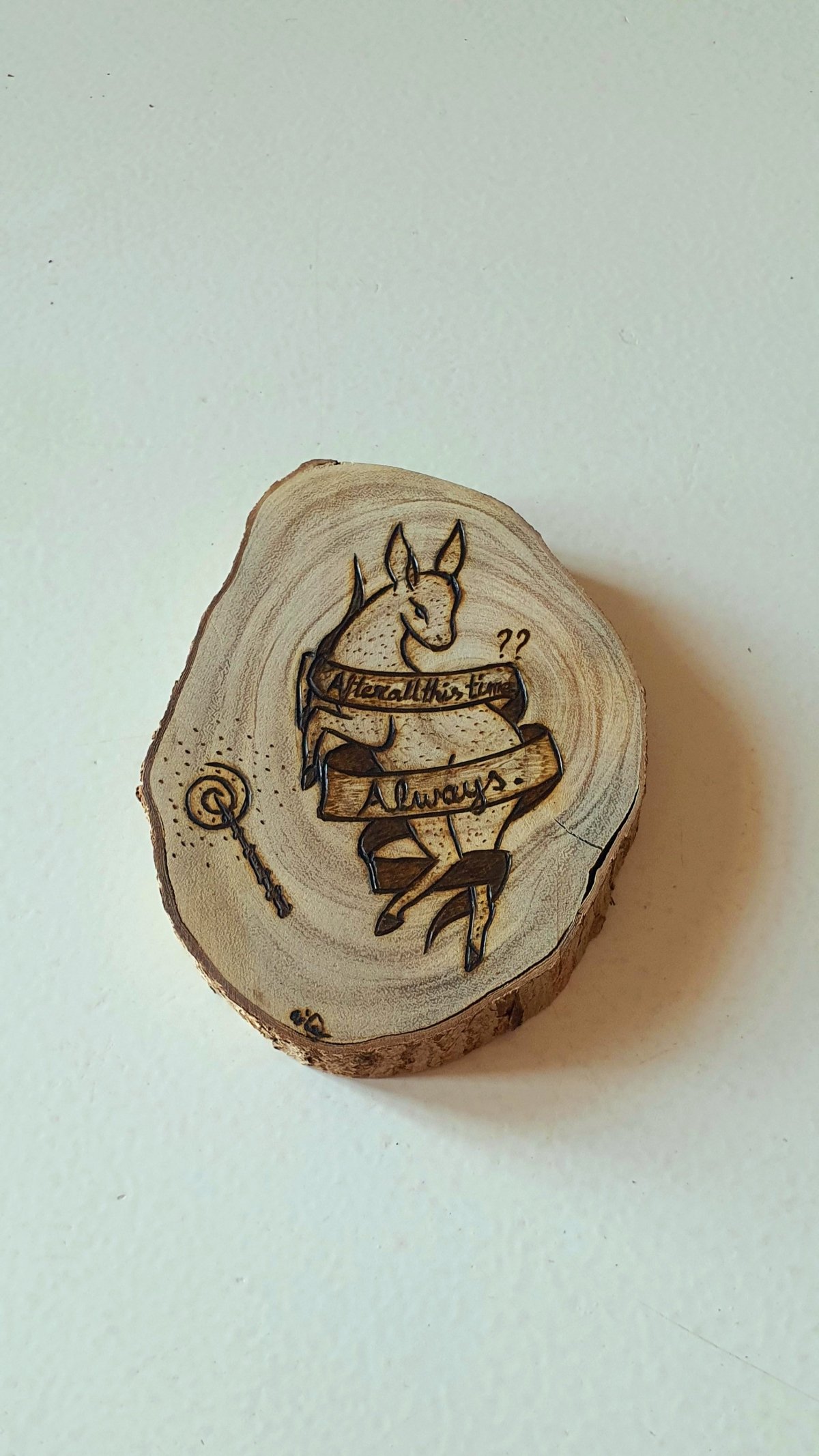 قطعة خشب من جذع شجر، بتصميم فريد نفَّذناه بفن الحرق اليدوي على الخشب، يمكن وضعها على طاولة أو مكتب لإضافة لمسة فنية دافئة إلى غرفتك أو مكتبك.