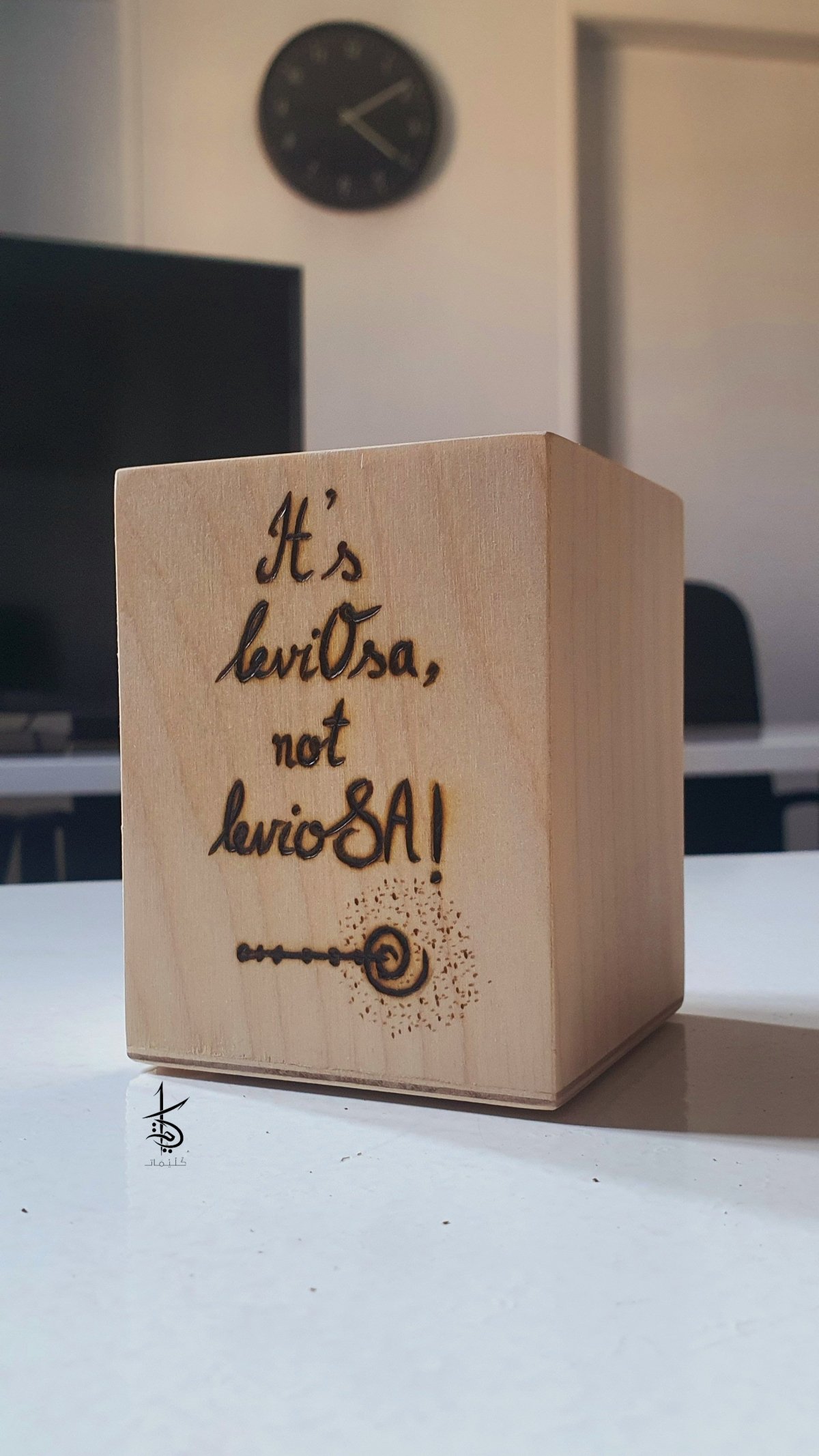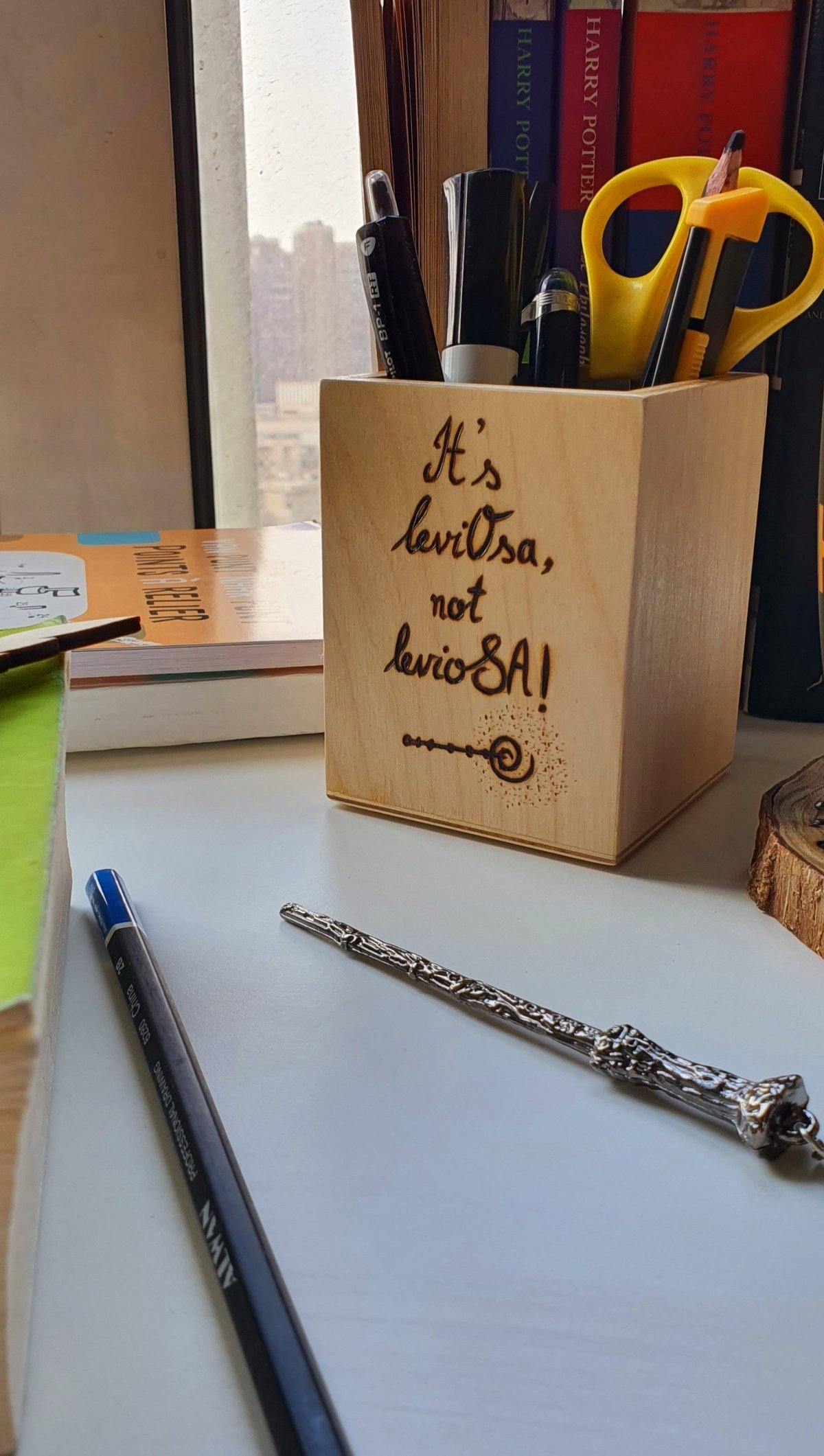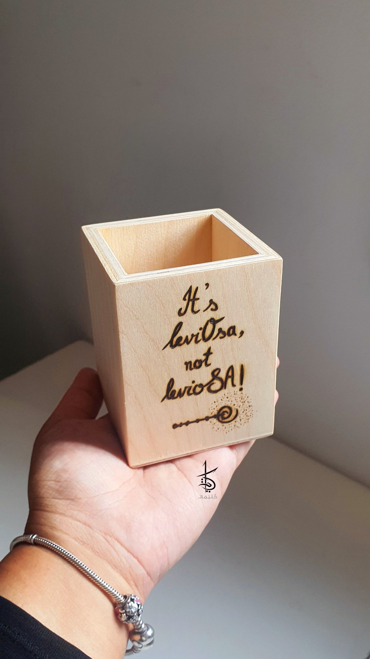 مقلمة مكتب خشب عالية الجودة، بتصميم فريد نفَّذناه بفن الحرق اليدوي على الخشب لإضافة لمسة فنية دافئة إلى غرفتك أو مكتبك.